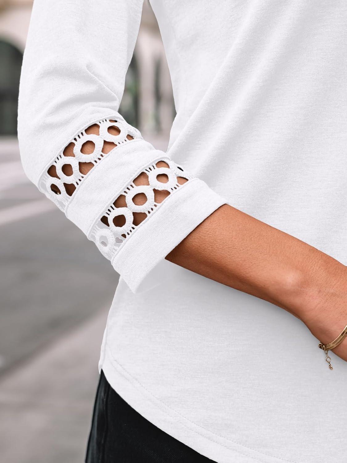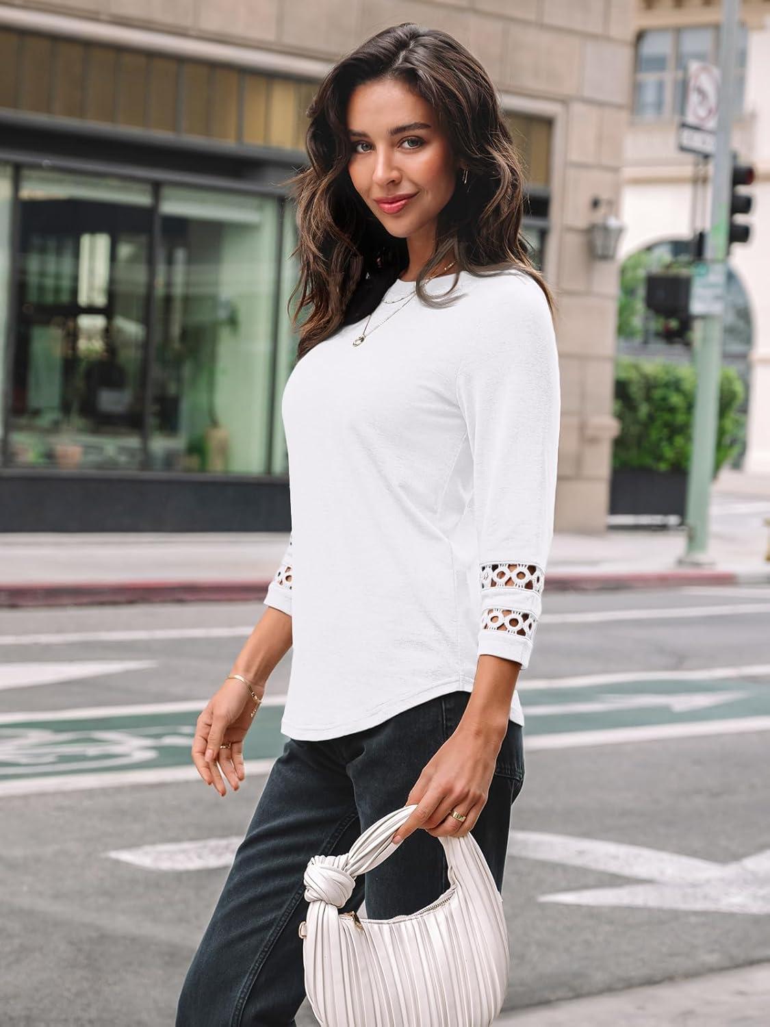 AUTOMET 3/4 Length Sleeve Womens Tops Crewneck Lace Tunic Business Casual Dressy Blouses Fall Trendy Outfits 2025(White)