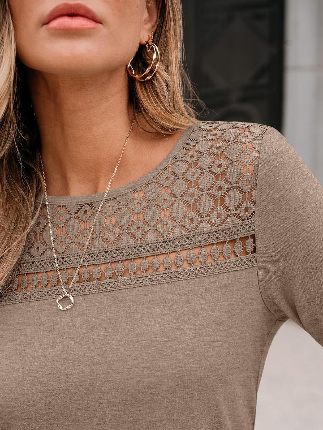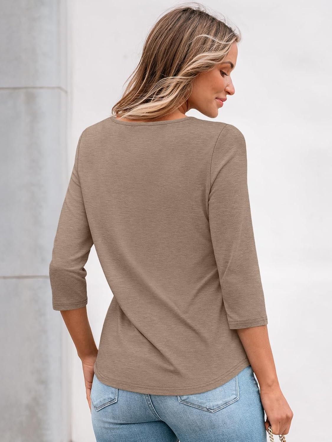 AUTOMET 3/4 Length Sleeve Womens Tops Lace Business Dressy Casual Blouses Spring Summer Fall Trendy Cute Work T Shirts(Khaki)