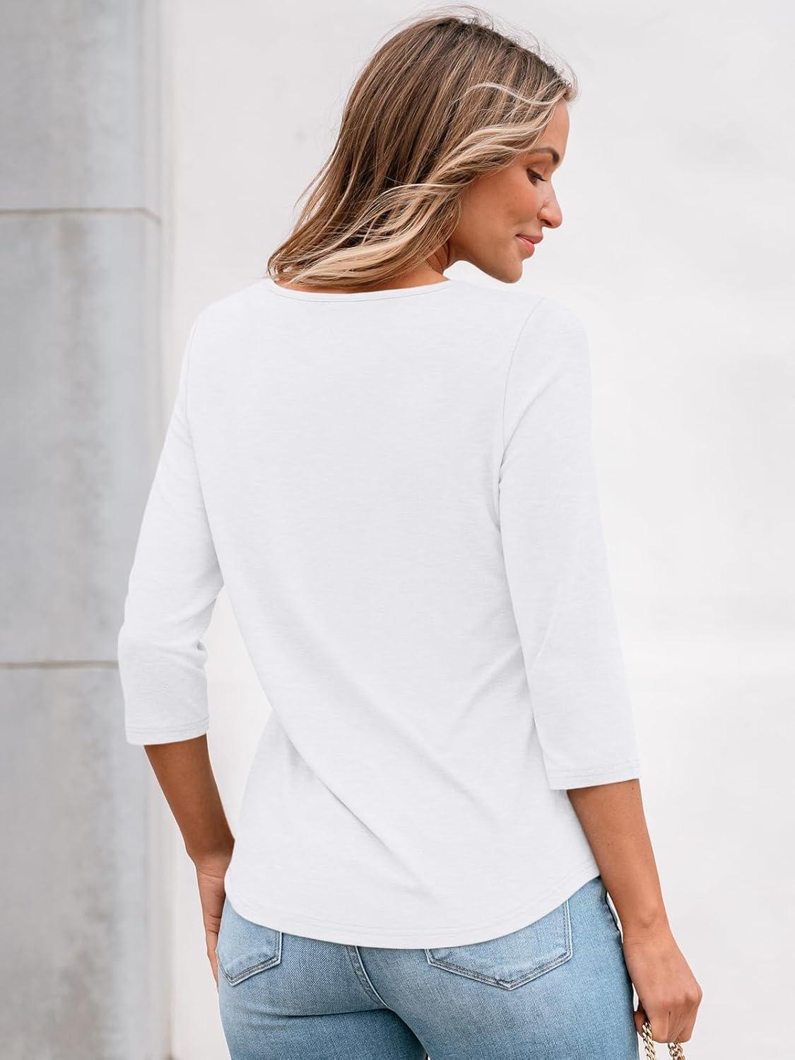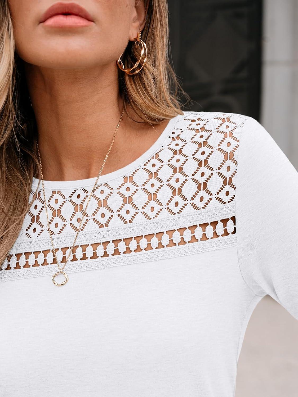 AUTOMET 3/4 Length Sleeve Womens Tops Lace Business Dressy Casual Blouses Spring Summer Fall Trendy Cute Work T Shirts(White)