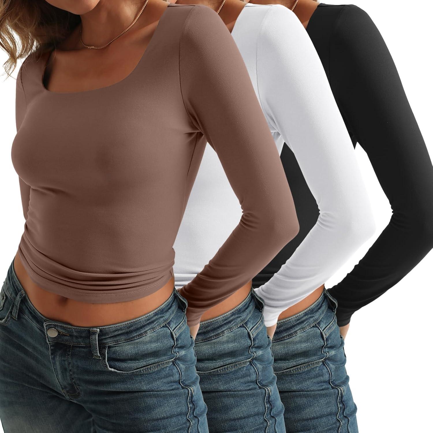 AUTOMET 3 Pack Womens Long Sleeve Shirts Fall Fashion Scoop Neck Crop Tops Basic Layer Slim Fit Y2K Clothes(Black white coffee Grey)