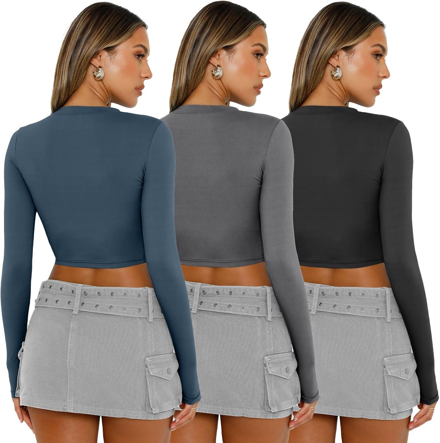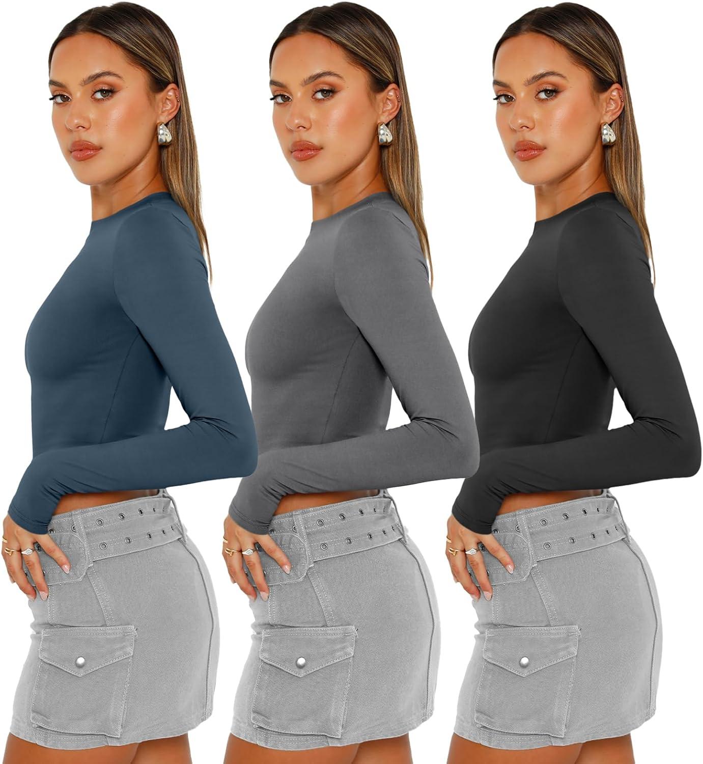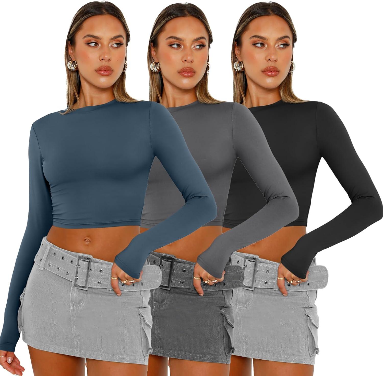 AUTOMET 3 Pack Womens Long Sleeve Shirts Y2K Going Out Crop Tops Cute Basic Slim Fitted Fall Fashion Outfits 2025 Clothes(Bluegreybalck)
