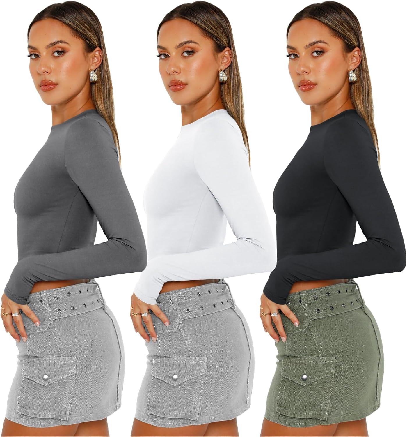 AUTOMET 3 Pack Womens Long Sleeve Shirts Y2K Going Out Crop Tops Cute Basic Slim Fitted Fall Fashion Outfits 2025 Clothes(Greywhiteblack)