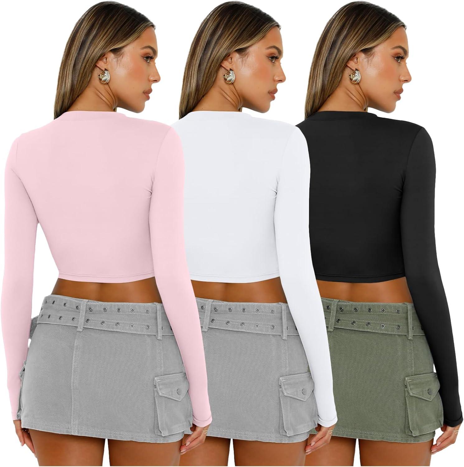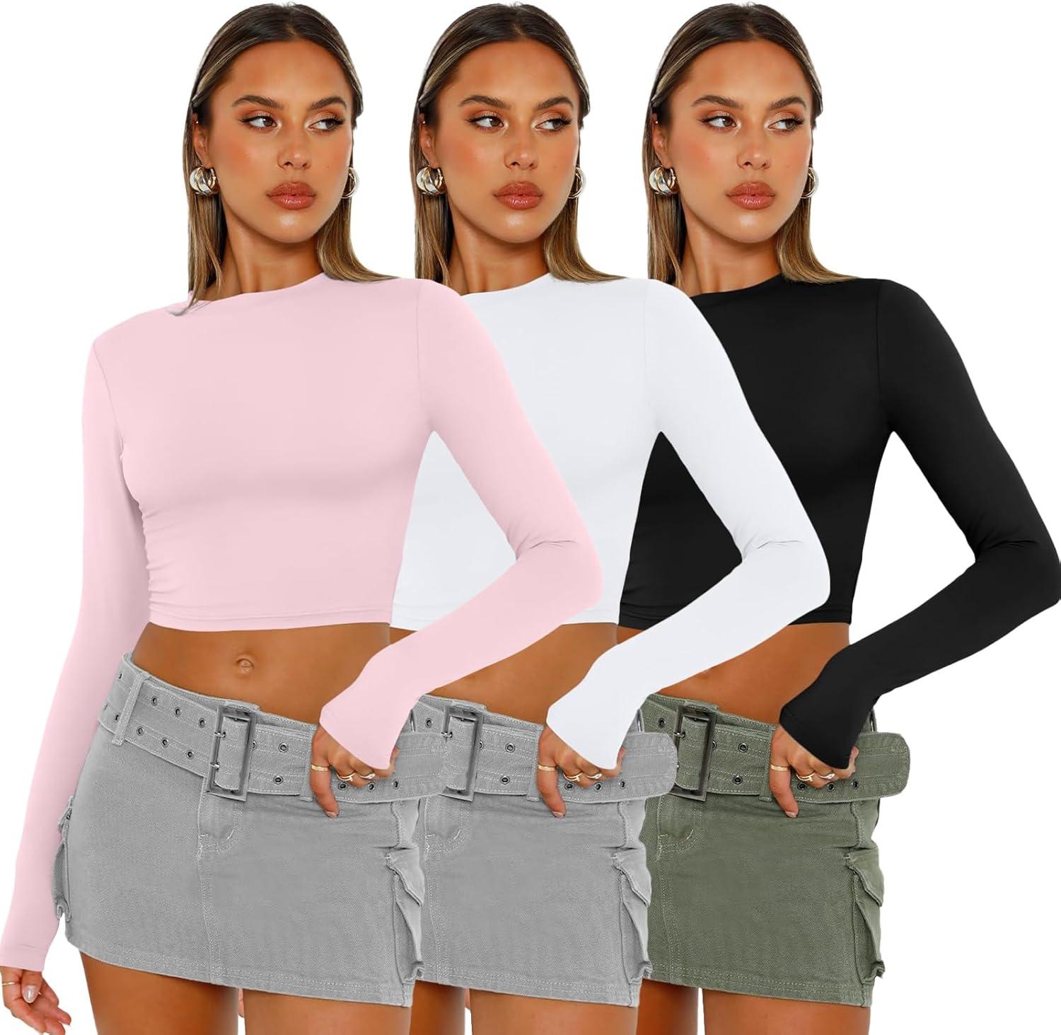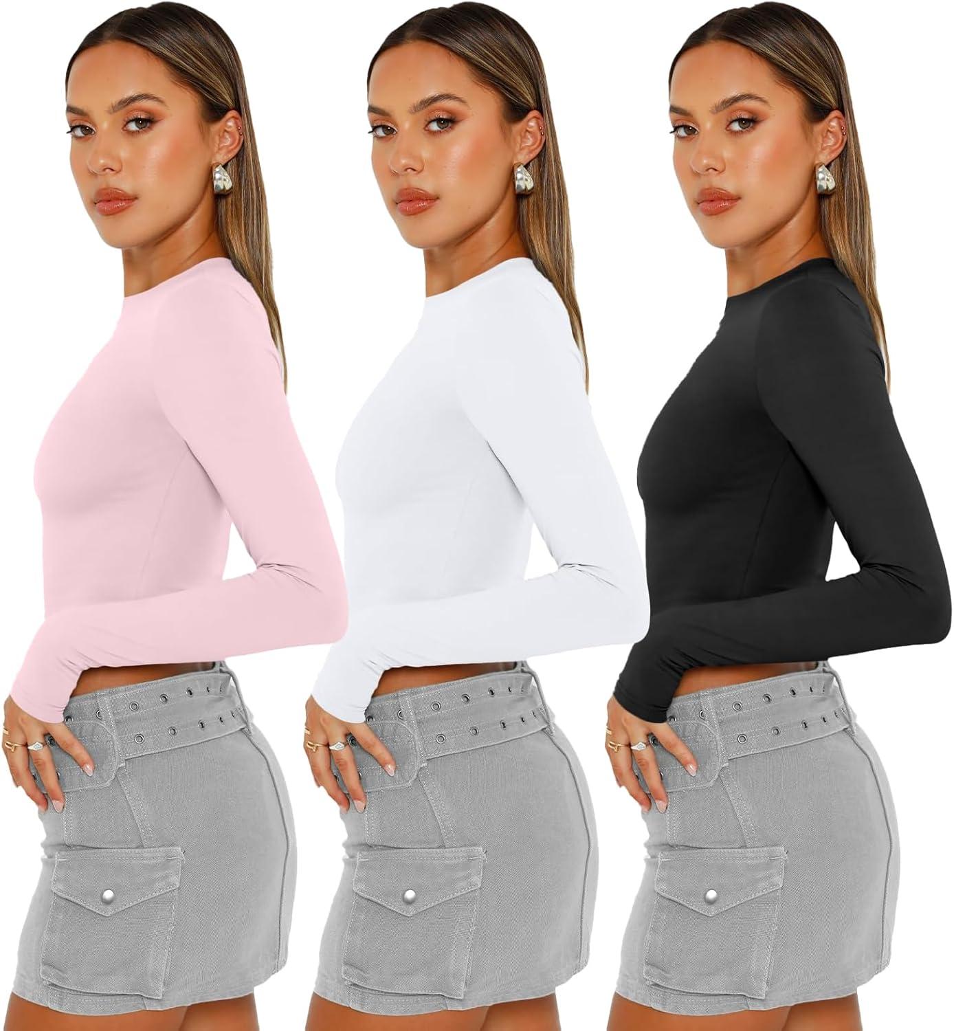 AUTOMET 3 Pack Womens Long Sleeve Shirts Y2K Going Out Crop Tops Cute Basic Slim Fitted Fall Fashion Outfits 2025 Clothes(Pinkwhiteblack)