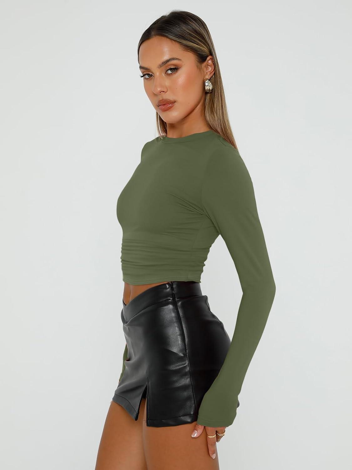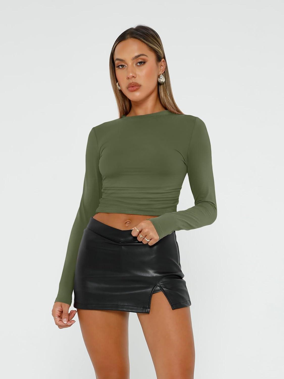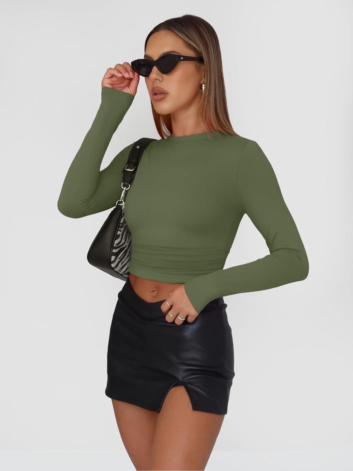 AUTOMET 3 Pack Womens Long Sleeve T Shirts Fall Fashion Basic Going Out Crop Tops Slim Fitted Winter Clothes 2025(Black white armygreen)