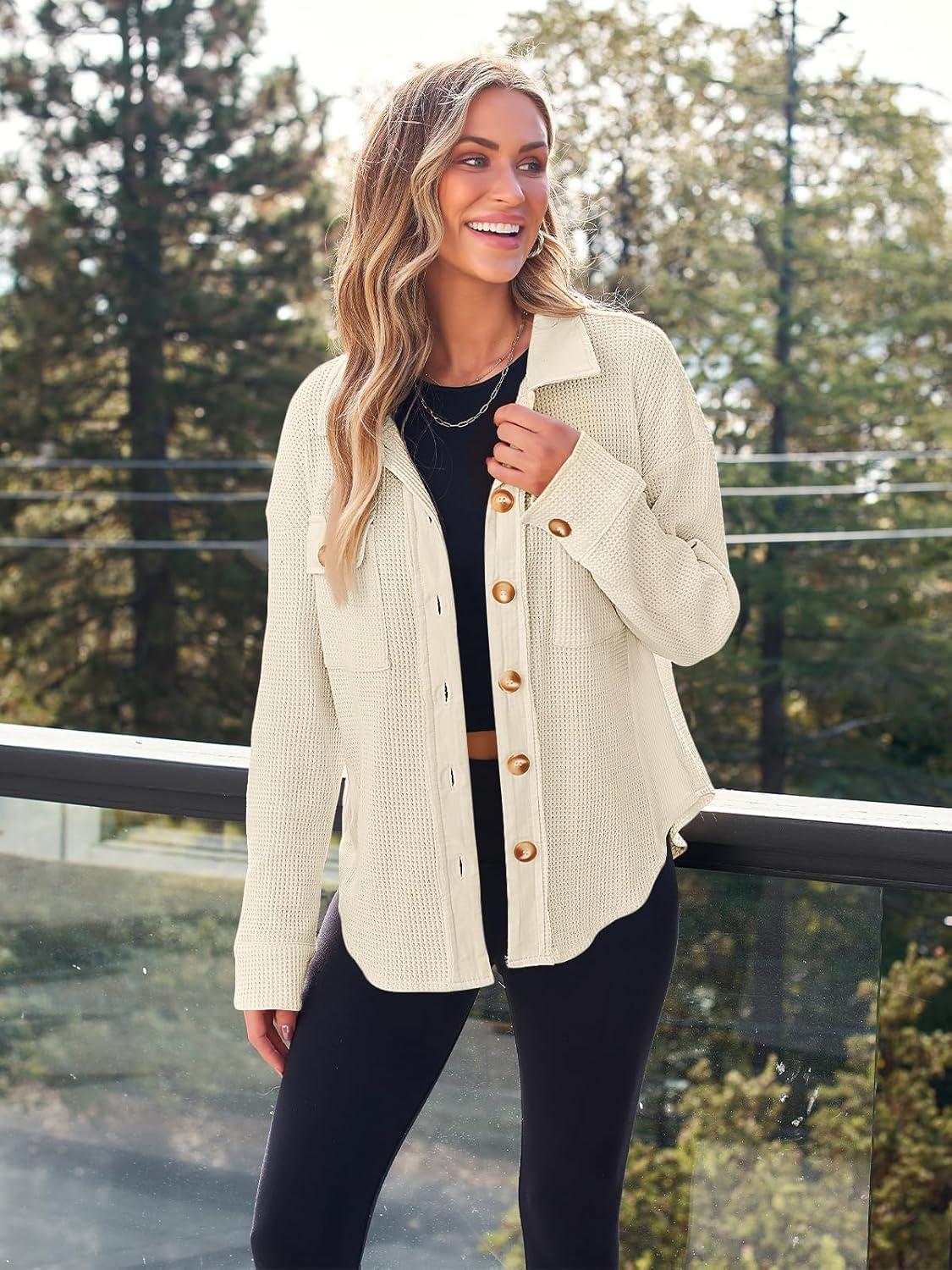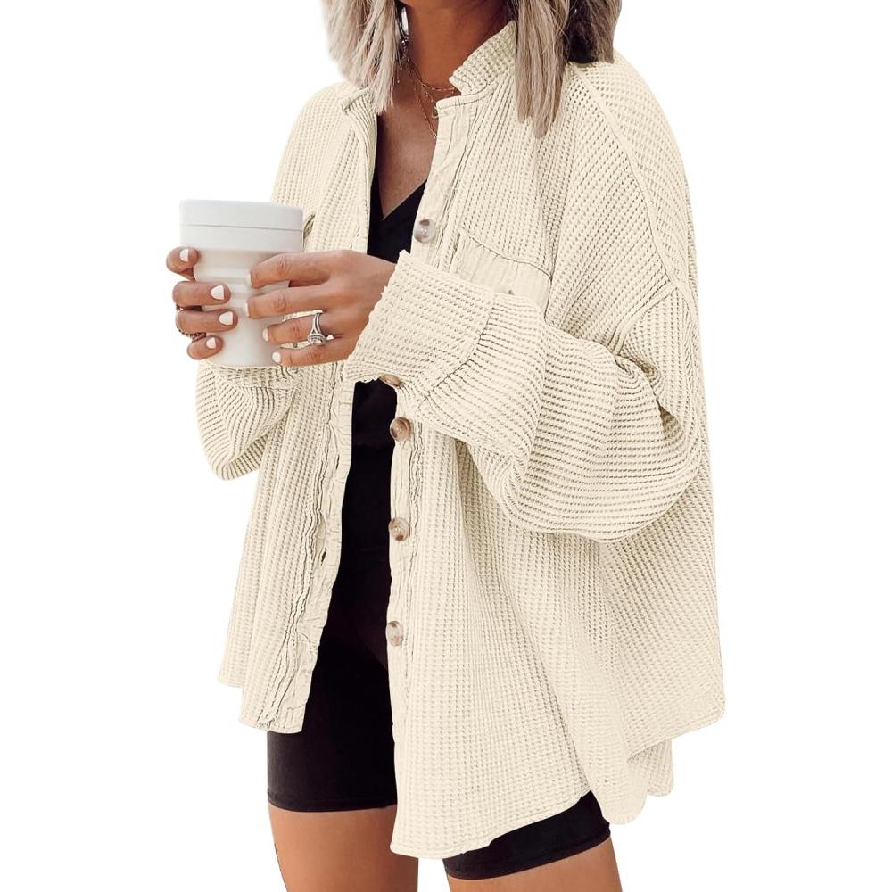 AUTOMET Fall Outfits for Women 2025 Fashion Clothes Winter Waffle Knit Clothing Oversized Button Down Shirt(Apricot)