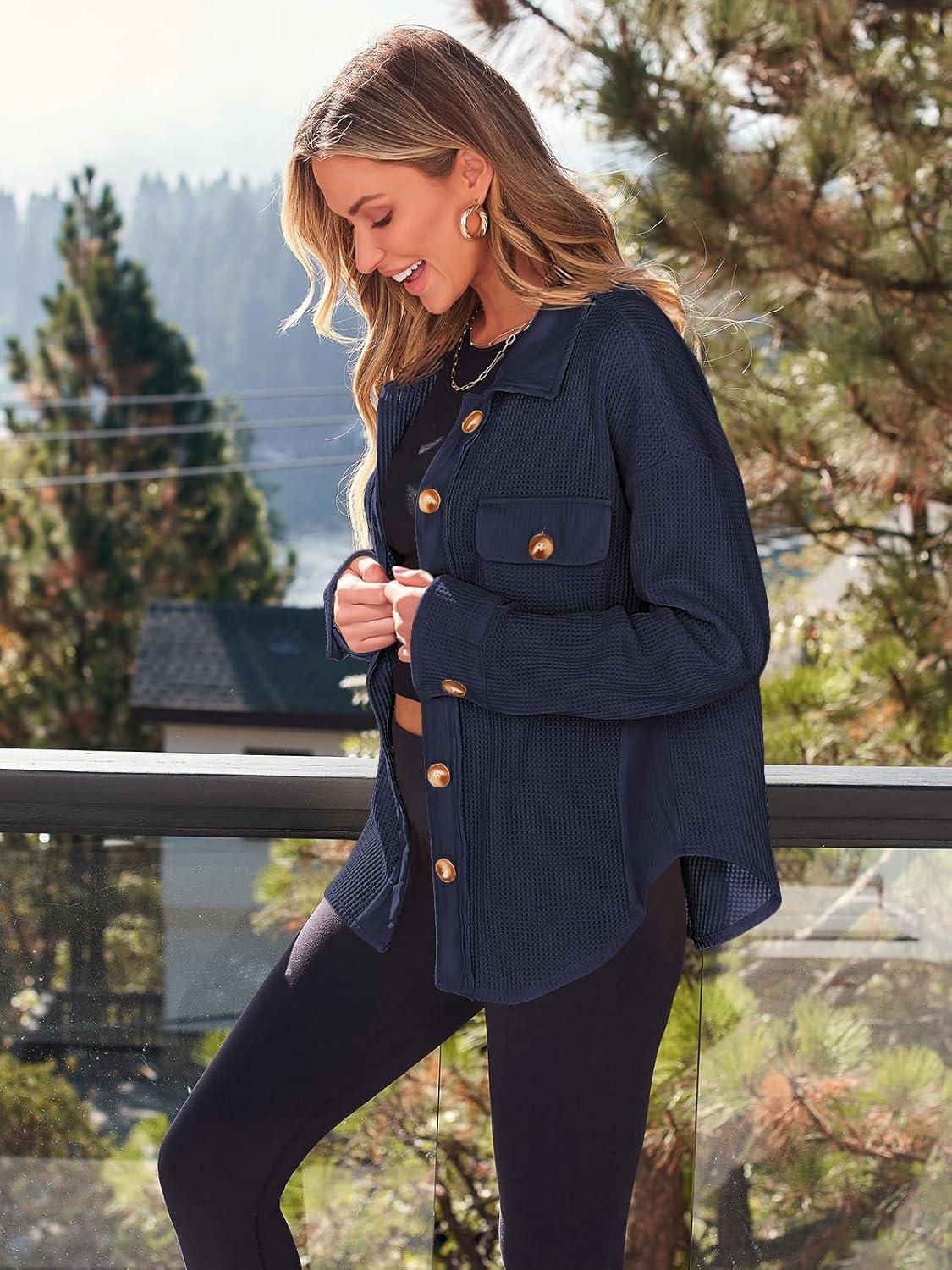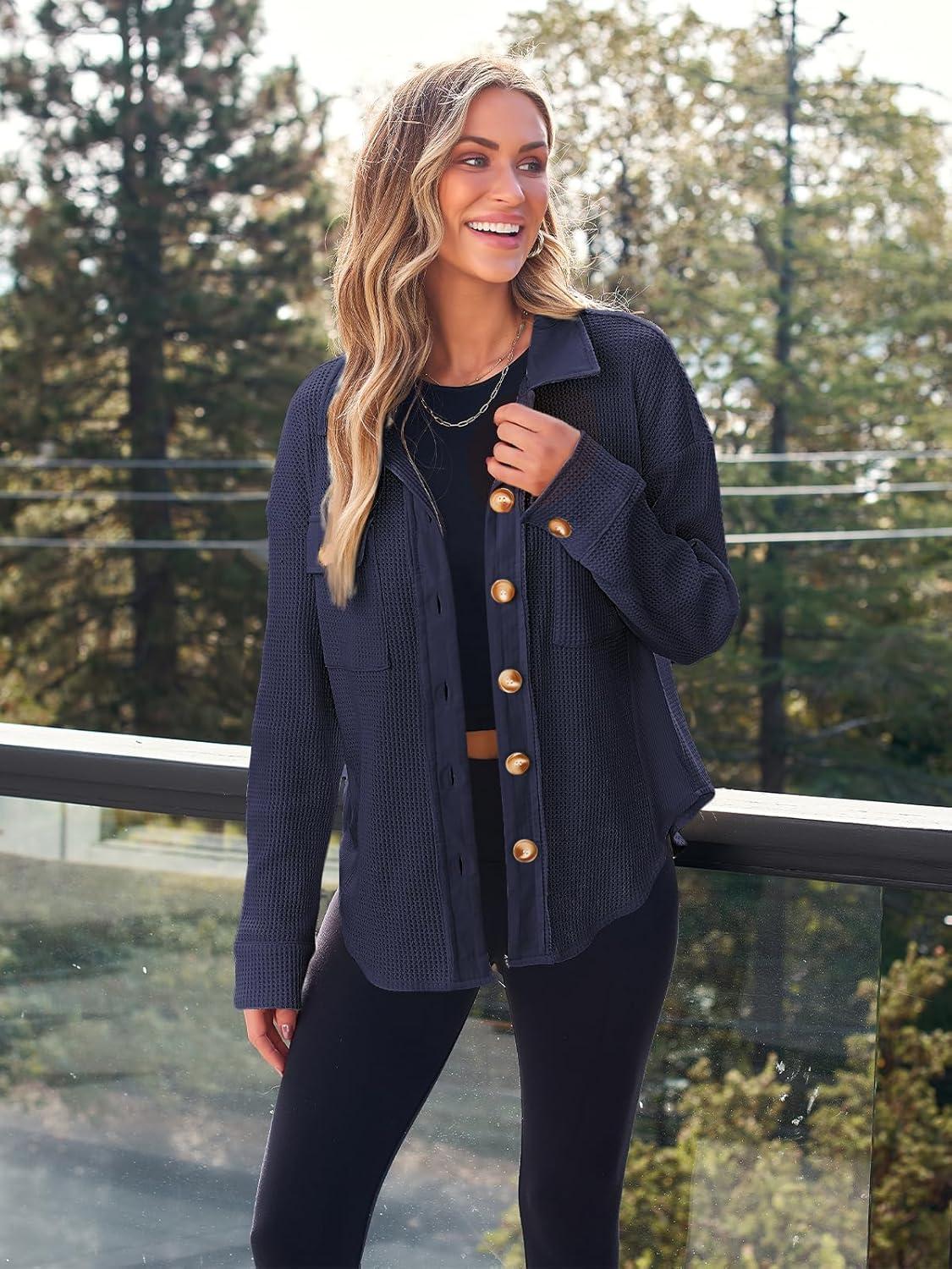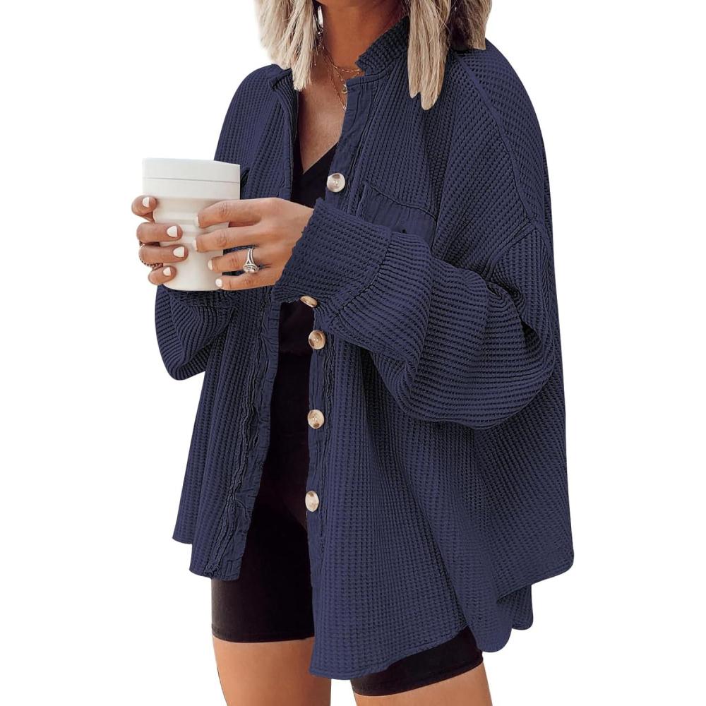AUTOMET Fall Outfits for Women 2025 Fashion Clothes Winter Waffle Knit Clothing Oversized Button Down Shirt(Navyblue)