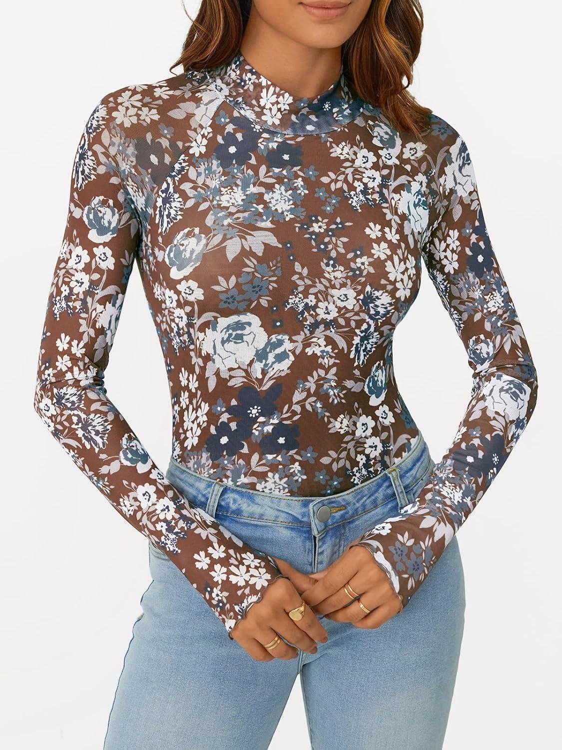 AUTOMET Lace Long Sleeve Floral Mesh Mockneck Going Out Tops for Women Fall Fashion Outfits 2025(Floralbrown)
