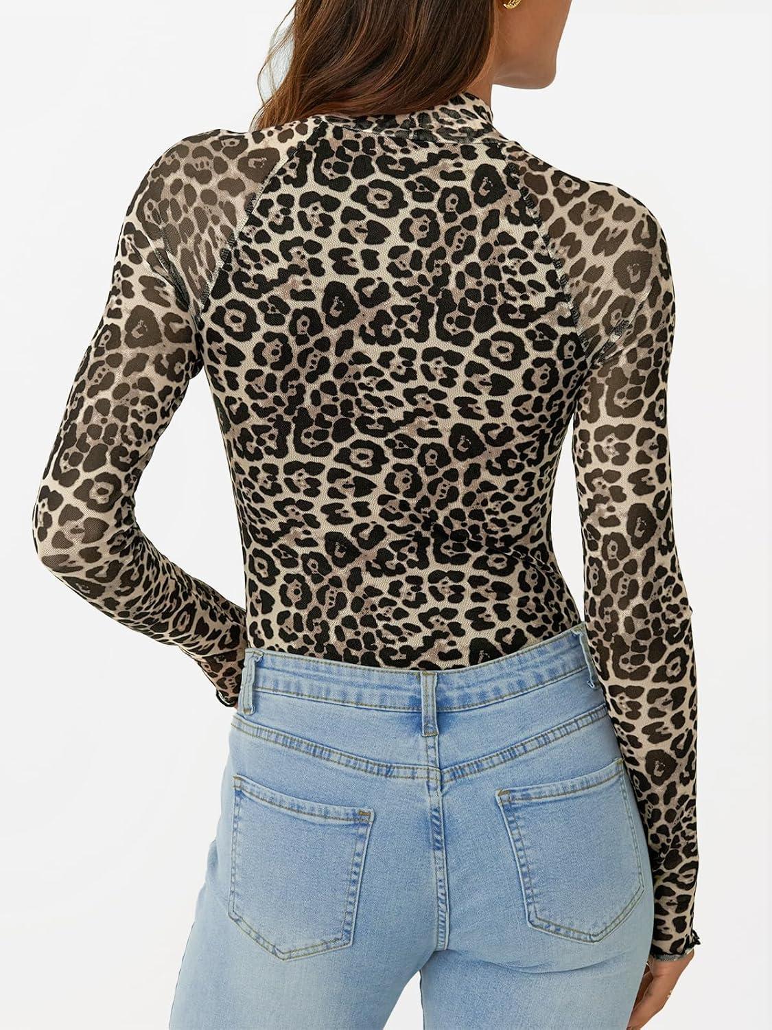 AUTOMET Lace Long Sleeve Floral Mesh Mockneck Going Out Tops for Women Fall Fashion Outfits 2025(Leopardprint)