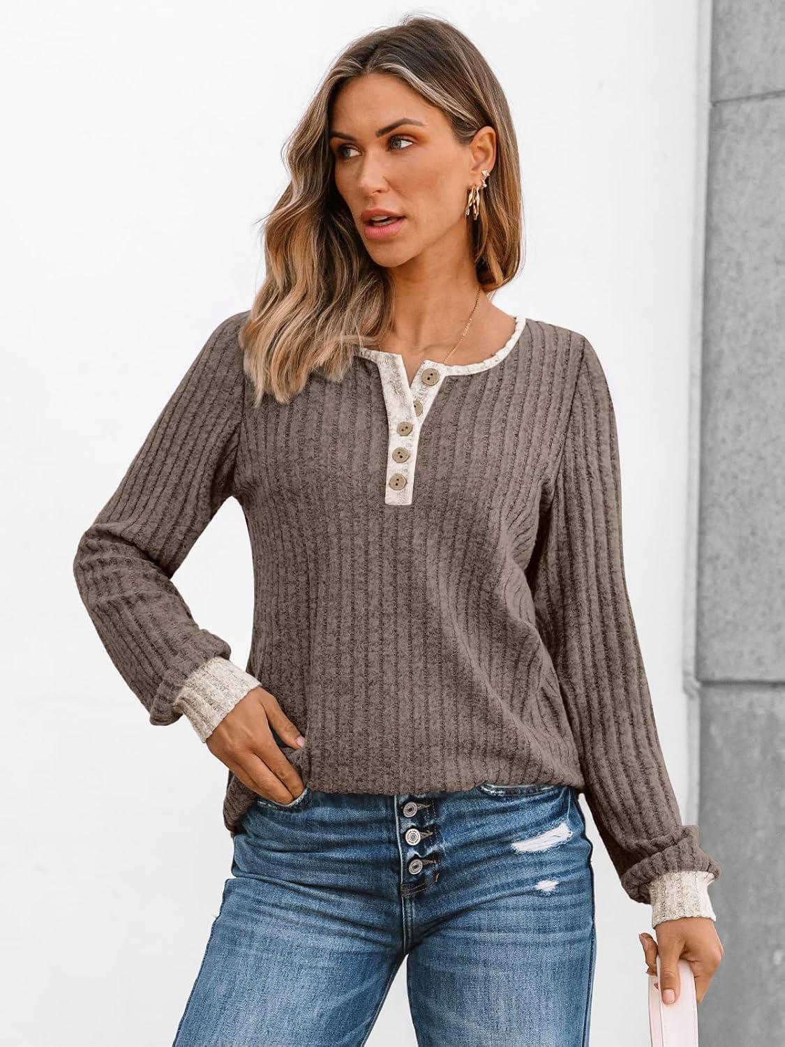 AUTOMET Long Sleeve Henley Shirts Women’s Business Casual Lightweight Tunic Sweater Tops(Coffee Almond)