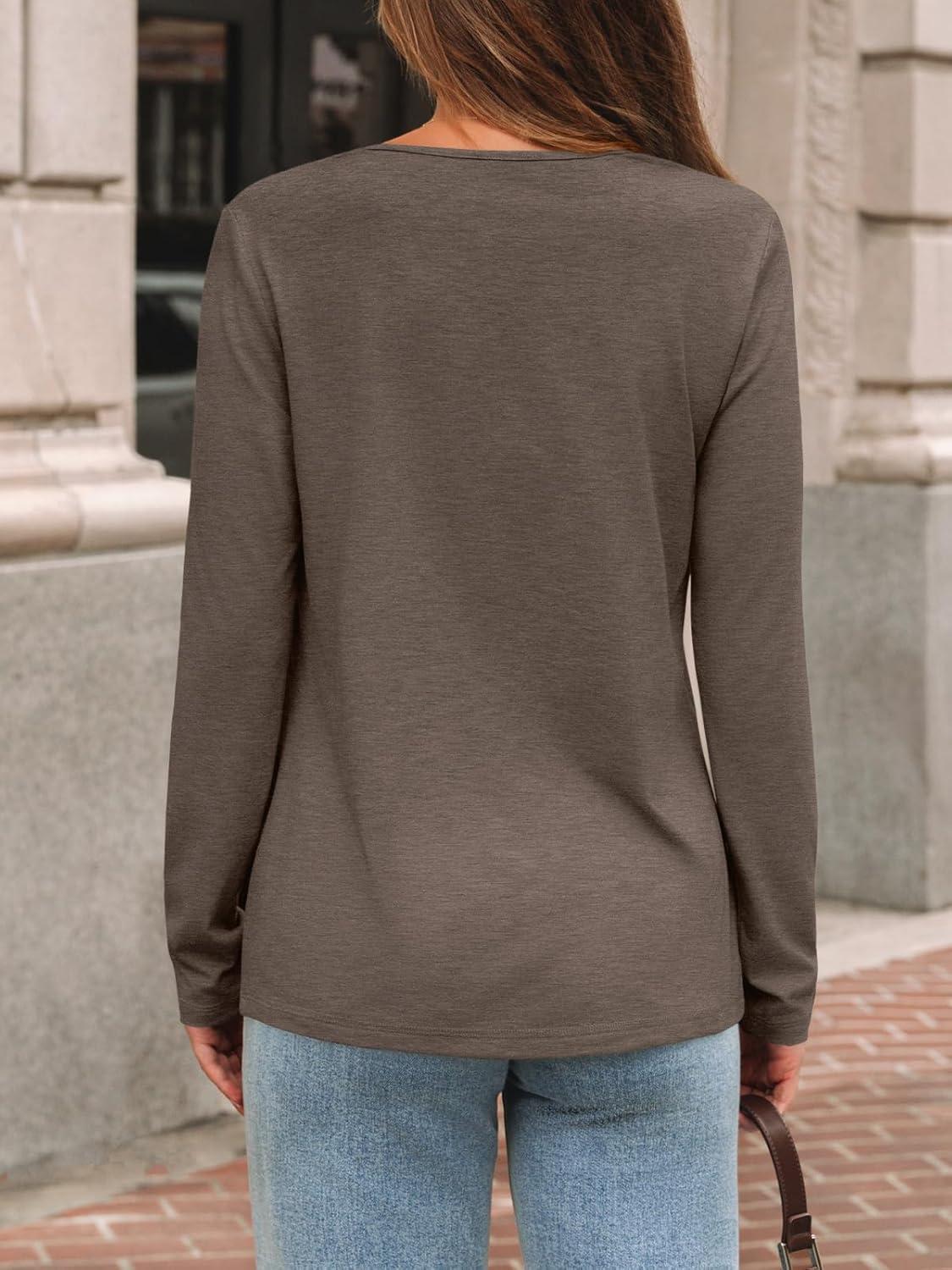AUTOMET Long Sleeve Shirts for Women Tops V Neck Casual Top Comfortable Shirt Soft Basic Tees Women Blouses(Coffee Grey)