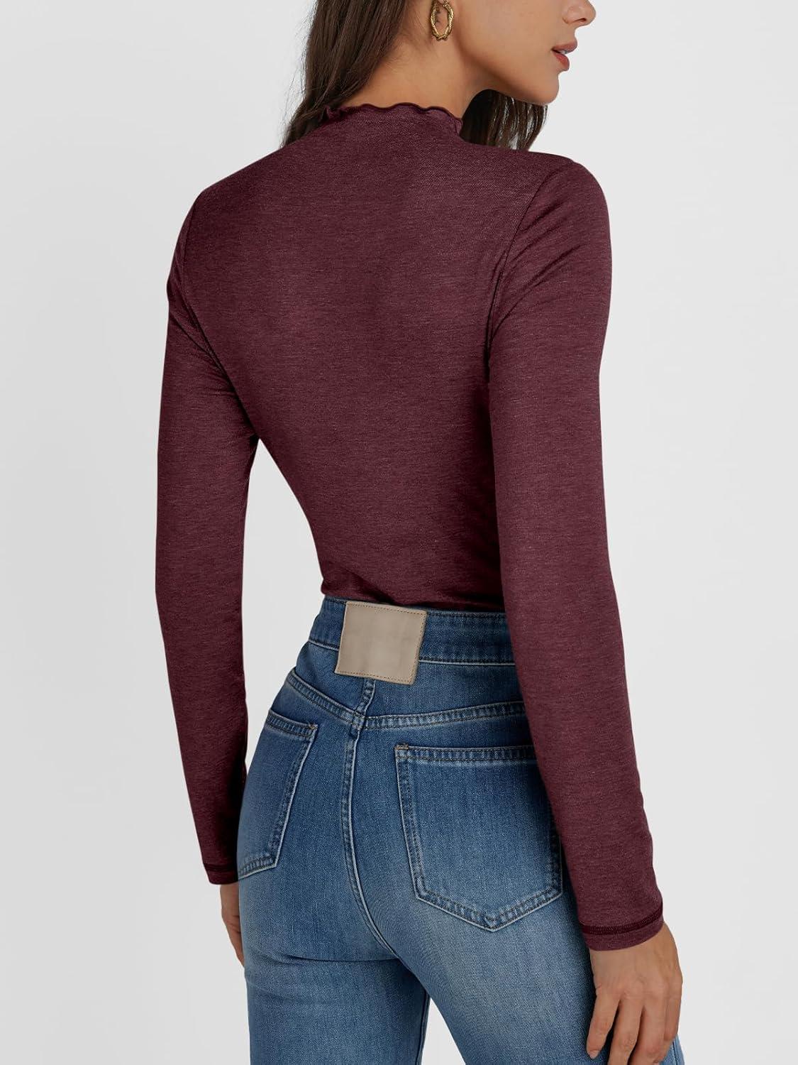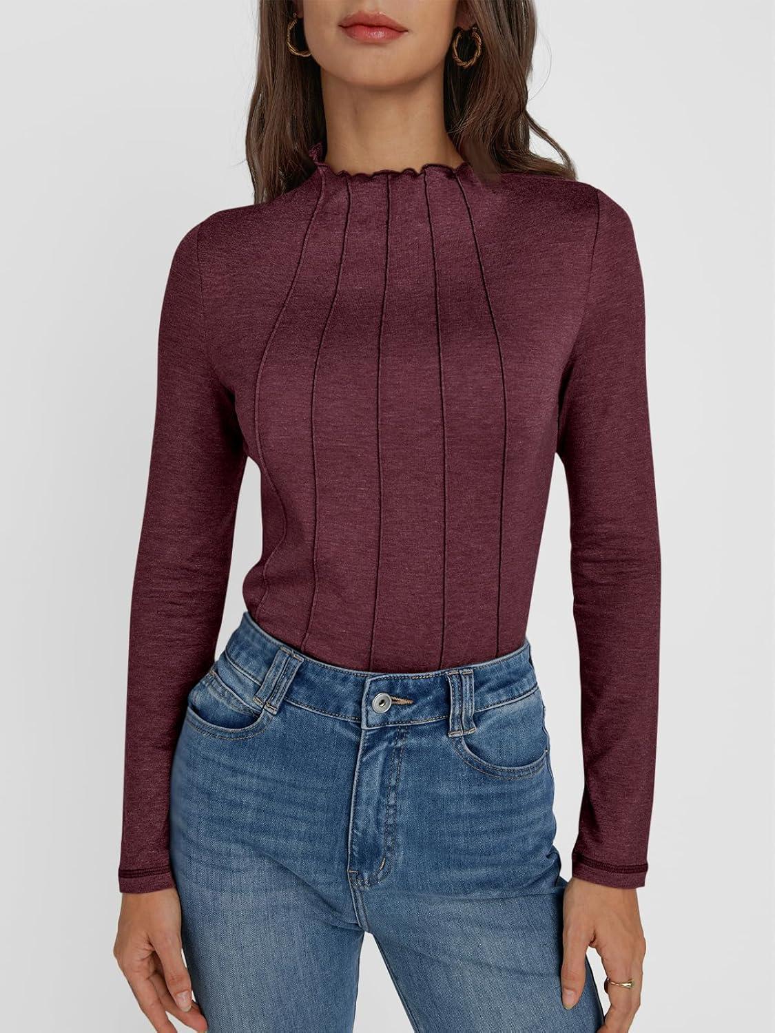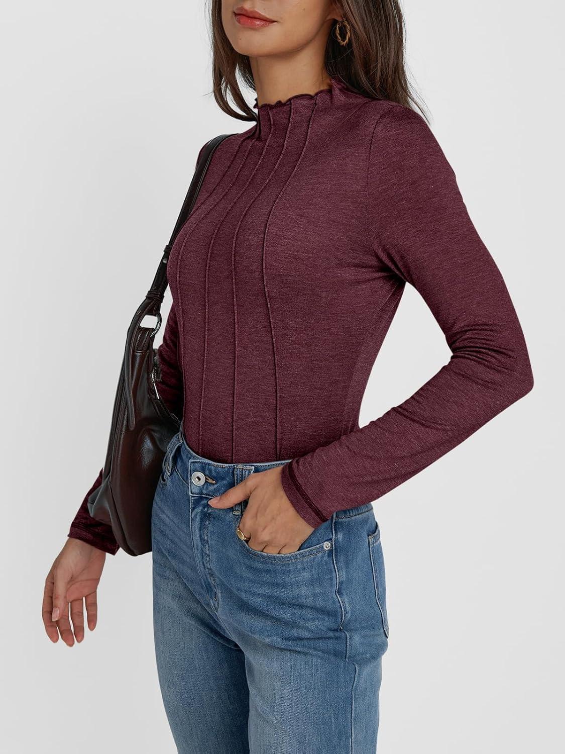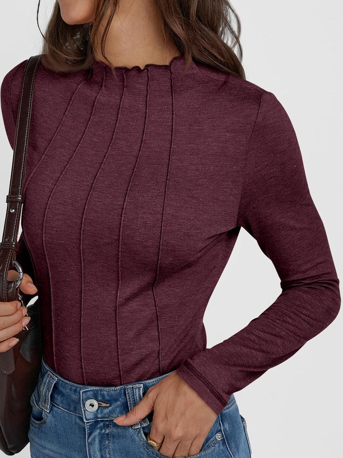AUTOMET Long Sleeve Shirts Tops Womens Business Casual Work Blouses 2024 Fall Dressy Tunic Mock Neck Turtleneck Trendy Ladies Tee Tshirts Fashion Outfits Cute Clothes Fitted Clothing Wine Red L