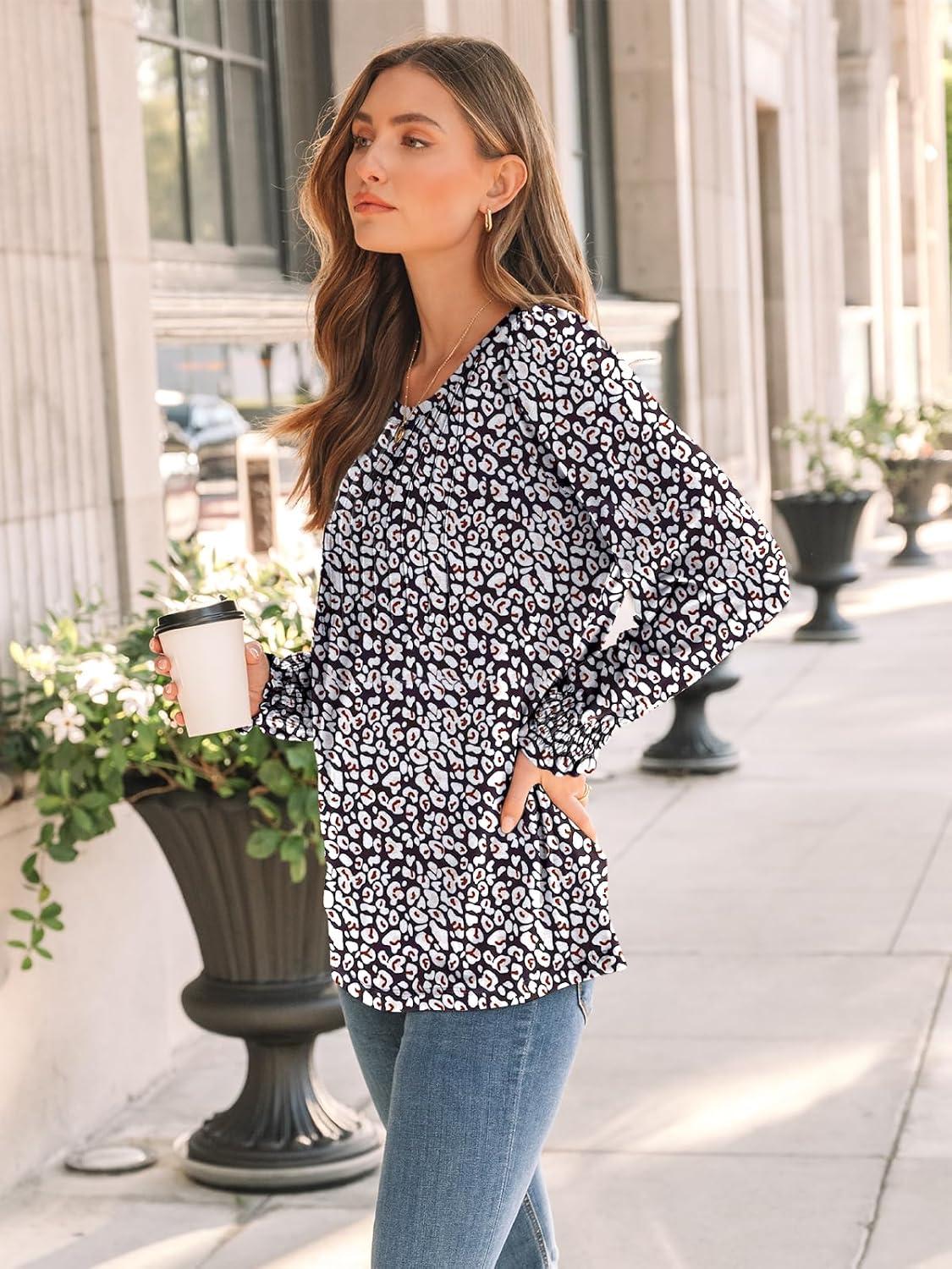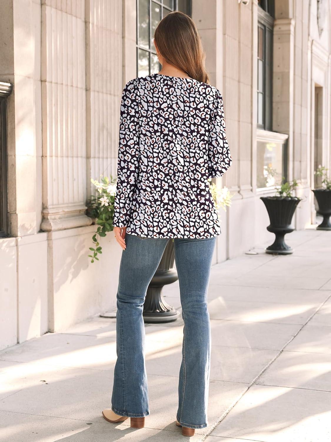 AUTOMET Long Sleeve Shirts Womens Pleated Business Casual Blouses with Smocked Cuffs(Leopard Black)