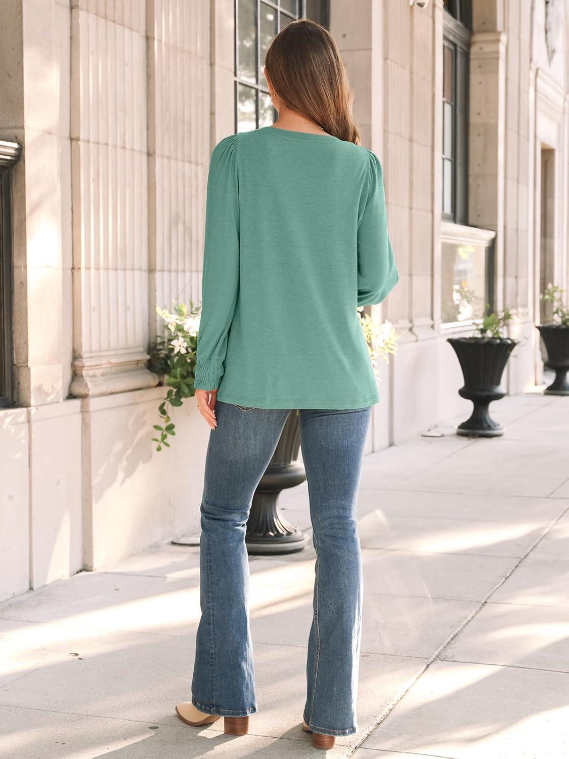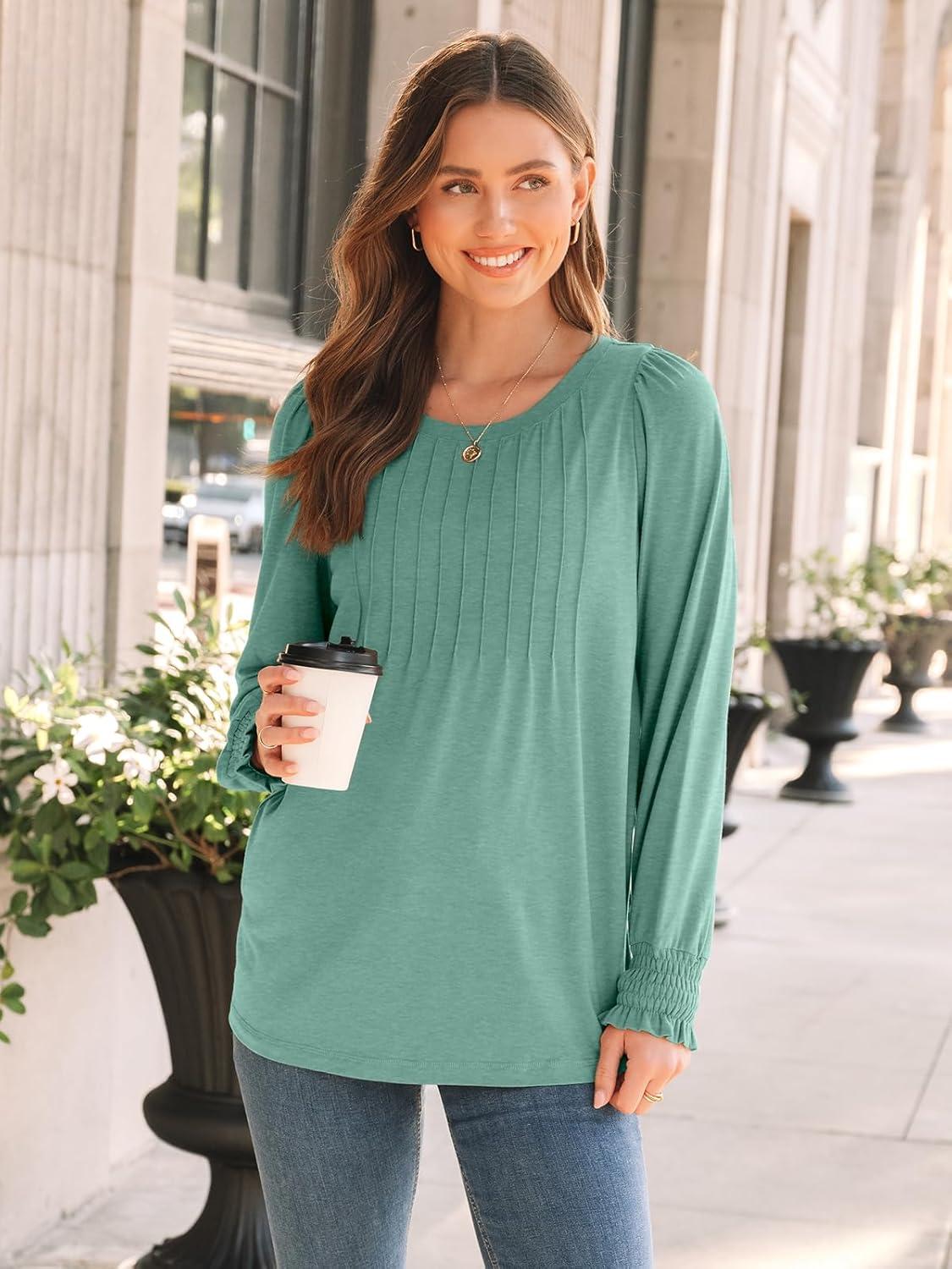 AUTOMET Long Sleeve Shirts Womens Pleated Business Casual Blouses with Smocked Cuffs(Sage Green)