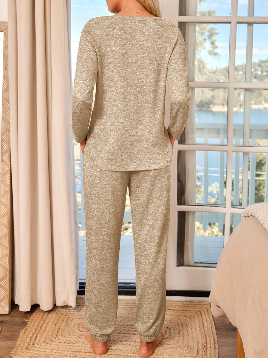 AUTOMET Lounge Sets for Women Comfy 2 Piece Pajamas Sets Fall Loungewear Pjs Outfits Sweatsuits with Sweatpants 2025(Light Khaki)