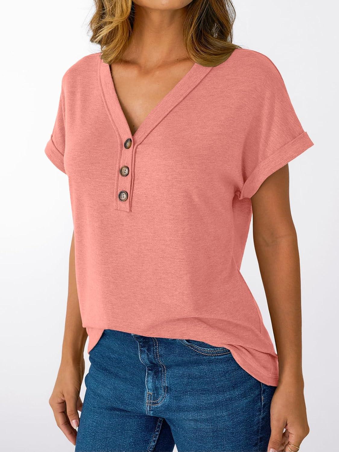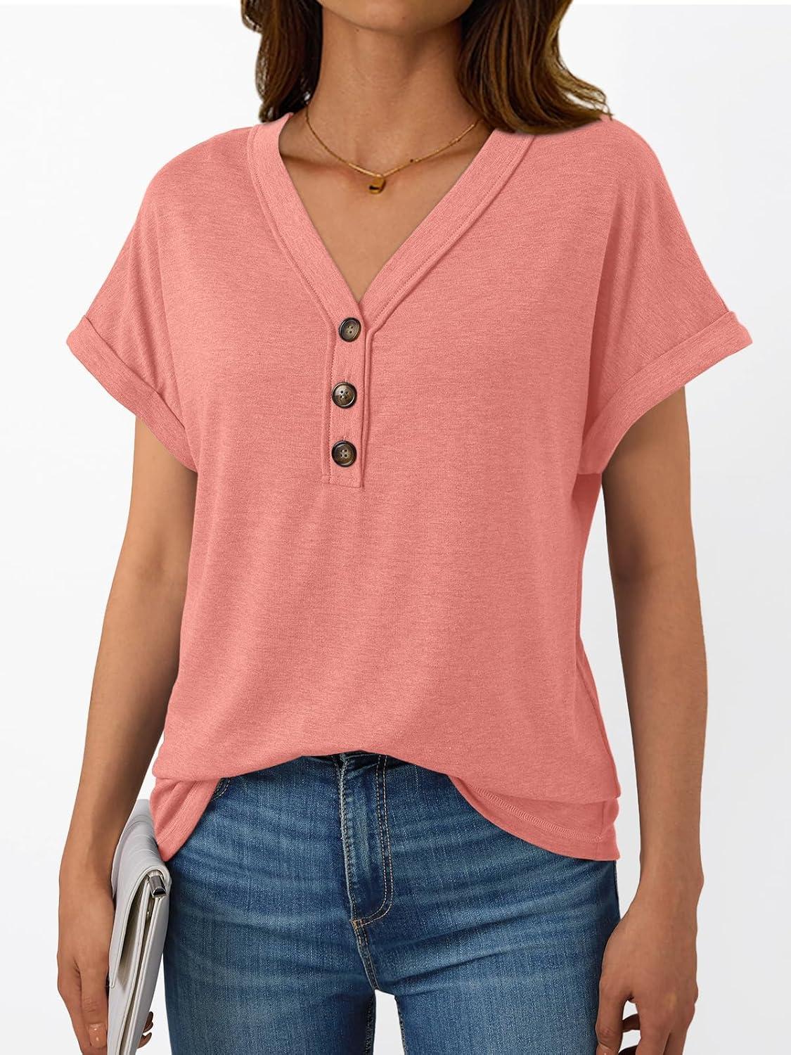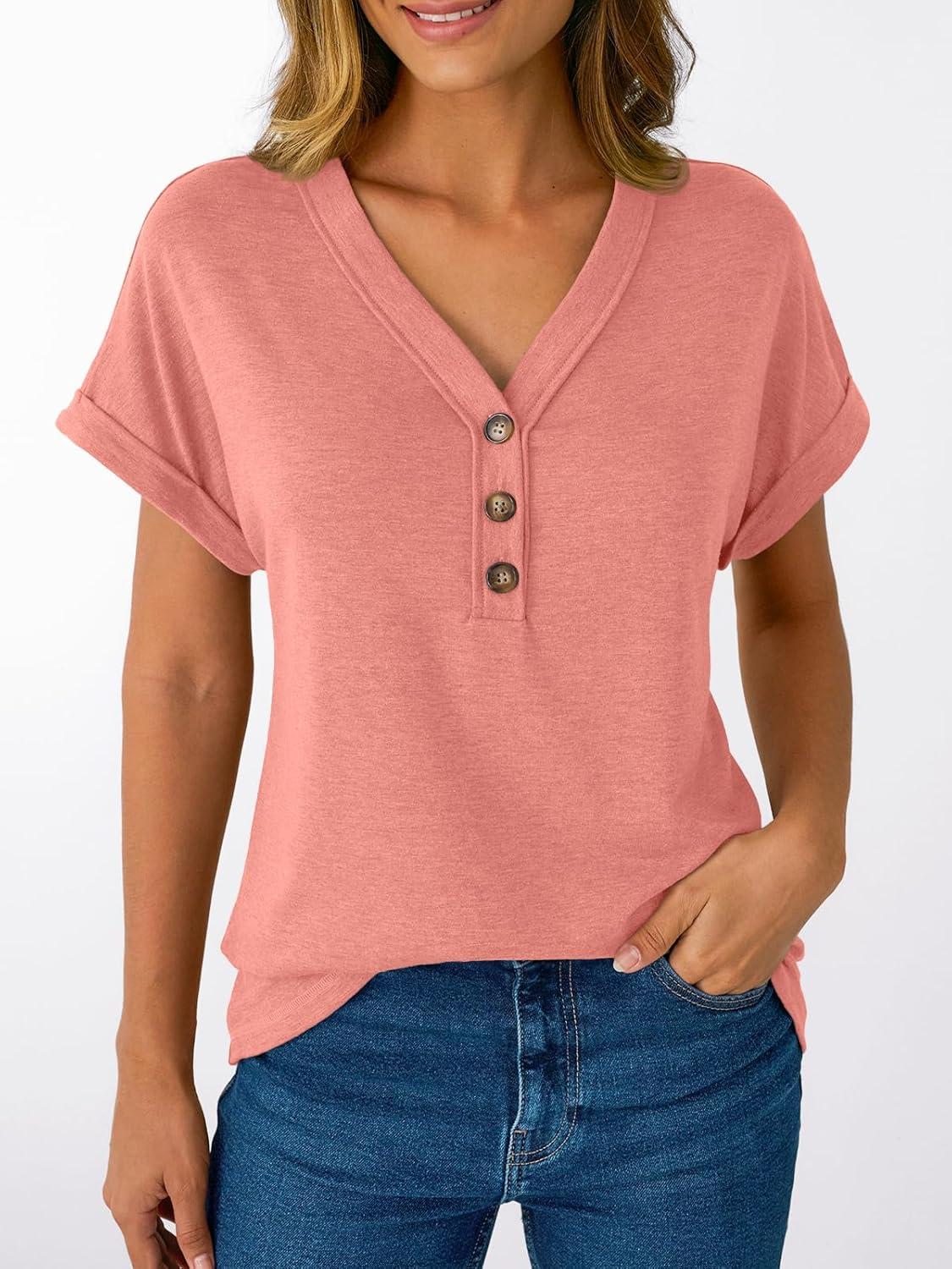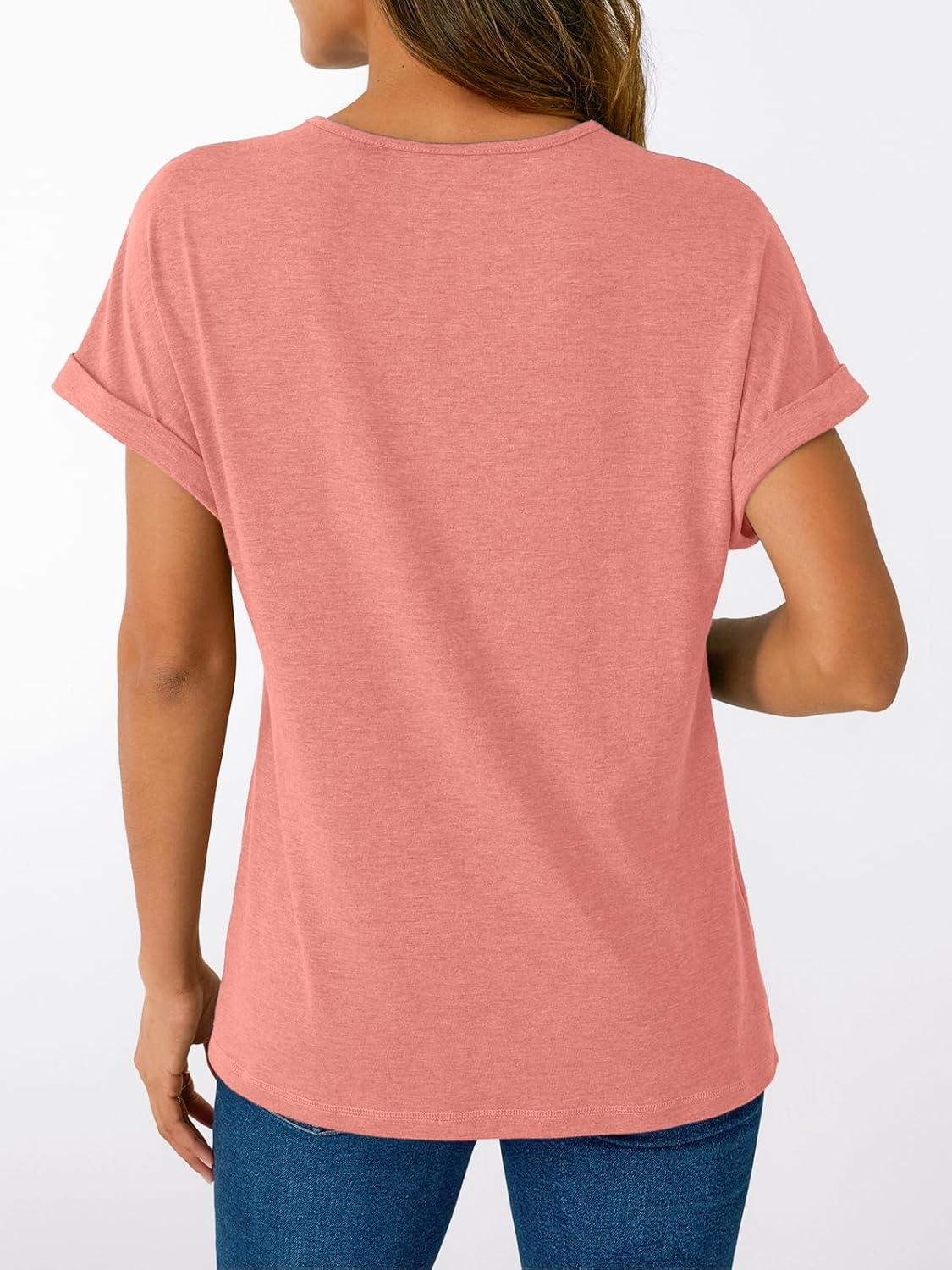 AUTOMET Short Sleeve V Neck T Shirts Womens Cap Sleeve Summer Casual Dressy Tops(Coral)