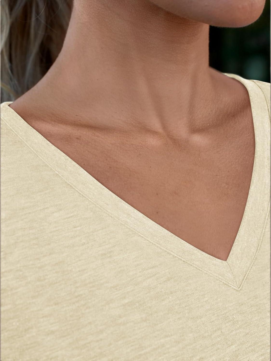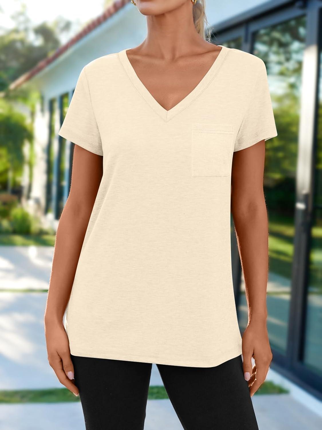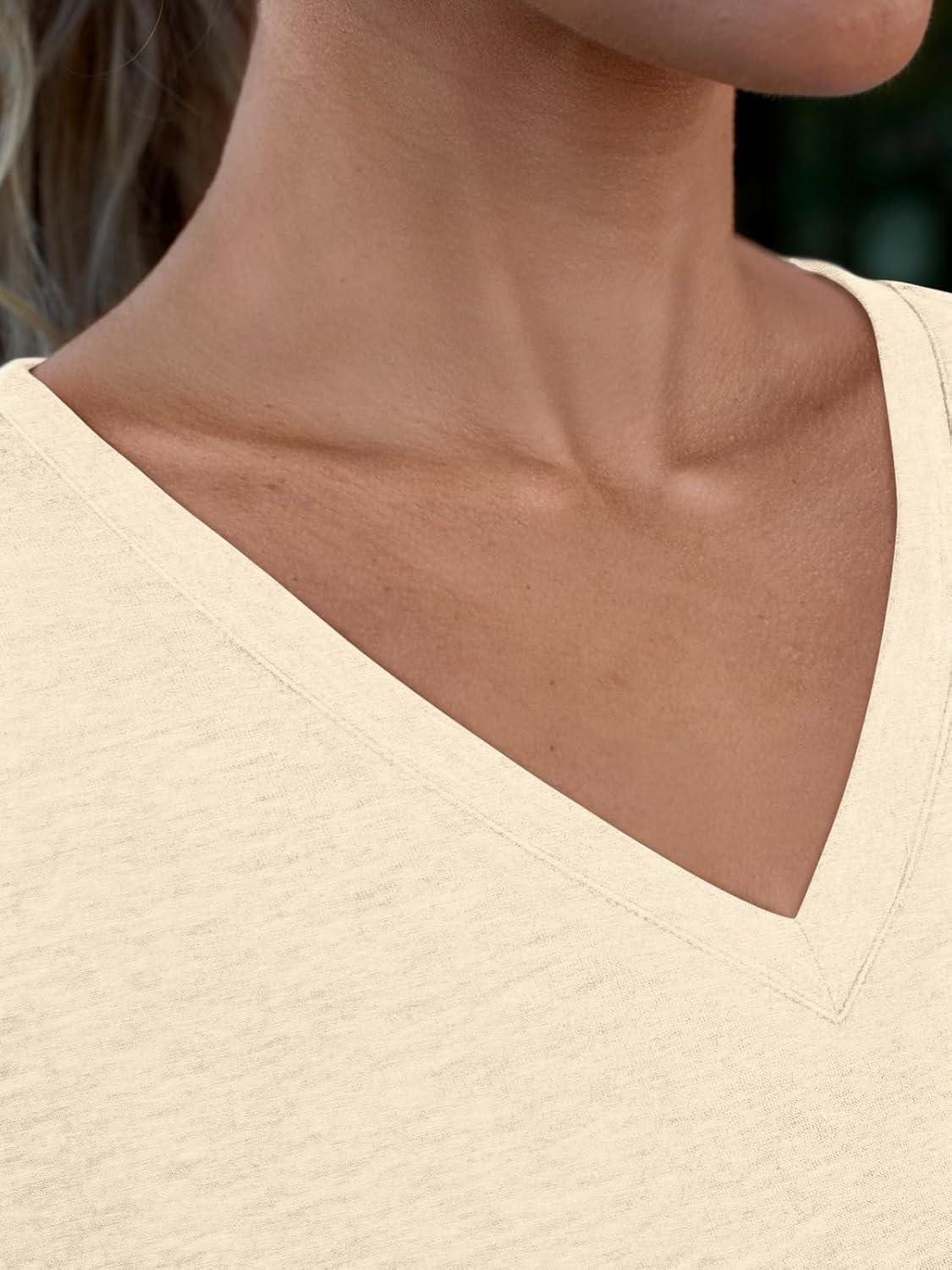 AUTOMET T Shirts for Women Short Sleeve Shirts V Neck Plus Size Summer Tops Casual Beach Vacation Outfits Clothes 2025(Cream)