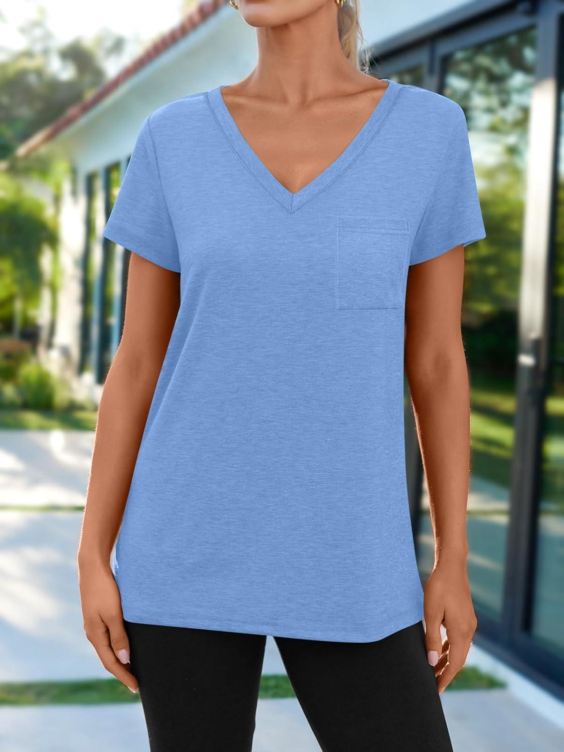 AUTOMET T Shirts for Women Short Sleeve Shirts V Neck Plus Size Summer Tops Casual Beach Vacation Outfits Clothes 2025(Skyblue)