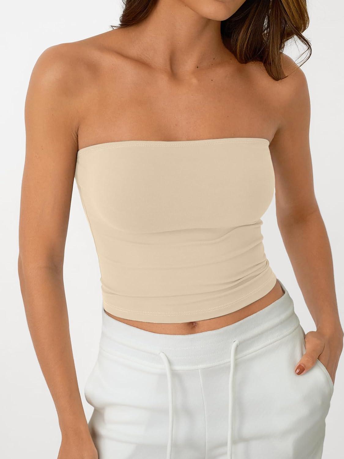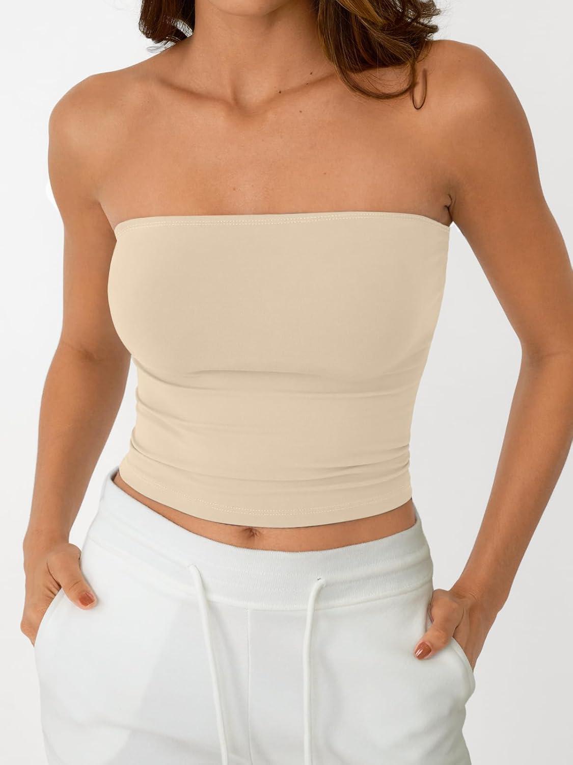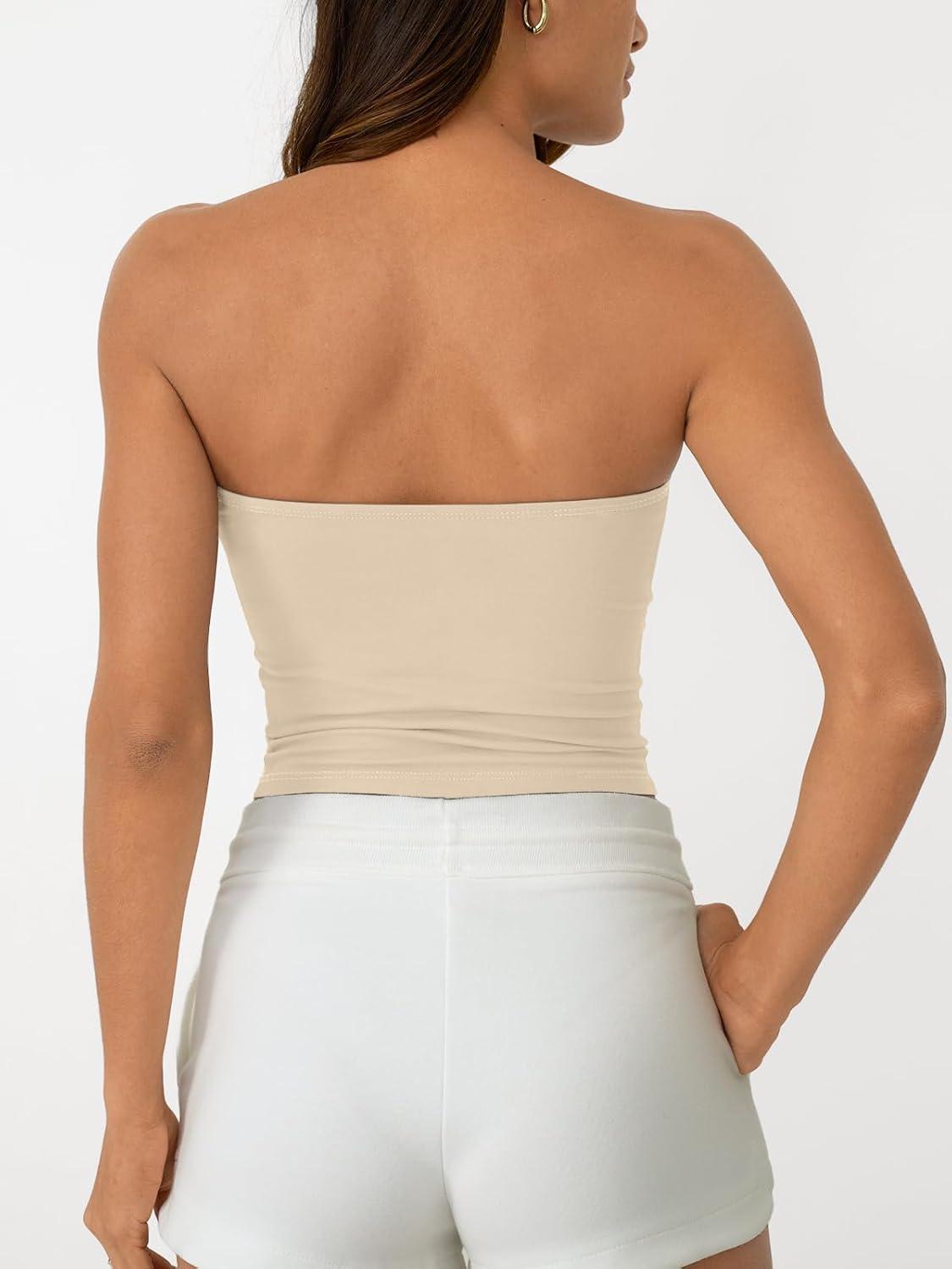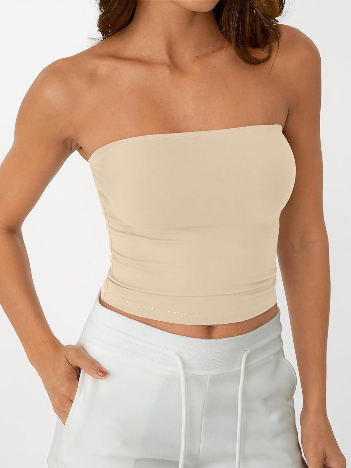 AUTOMET Tube Tops Strapless Crop Tops Basic Backless Sleeveless Bandeau Going Out Cute 2025 Summer Clothes(Khaki)