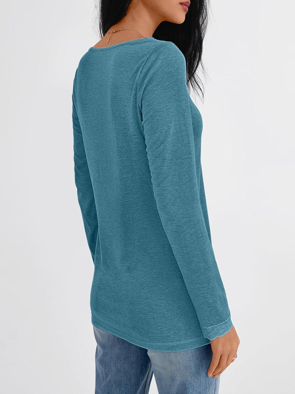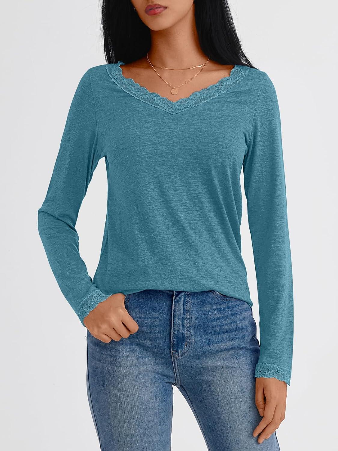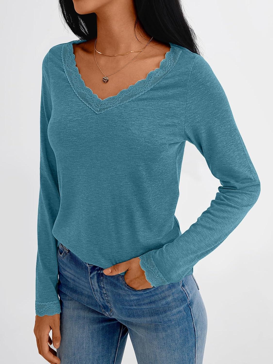 AUTOMET V Neck T Shirts for Women Lace Long Sleeve Cute Tops Fall Winter Dressy Business Casual Blouses Trendy Basic Tees(Bluegreen)