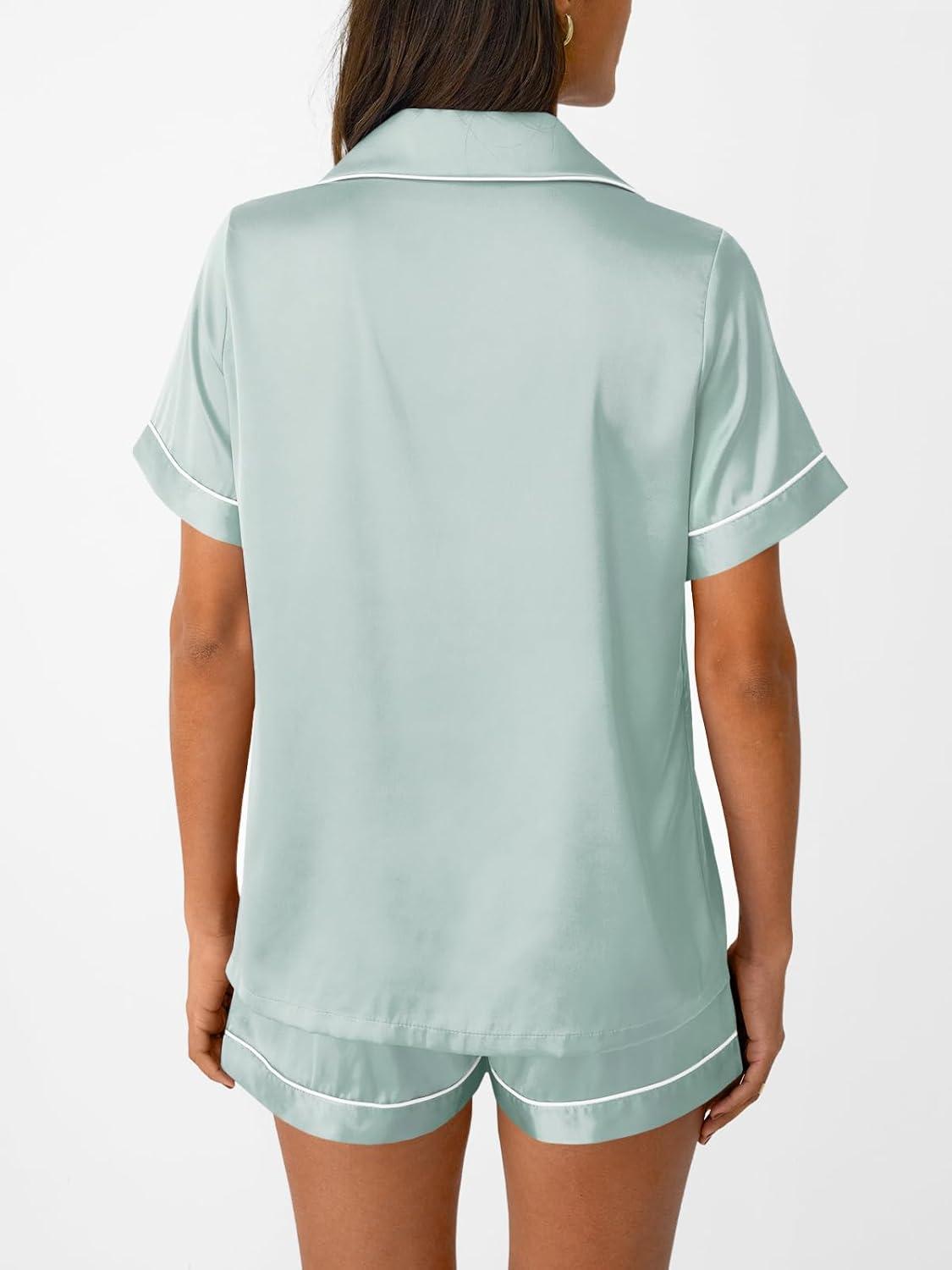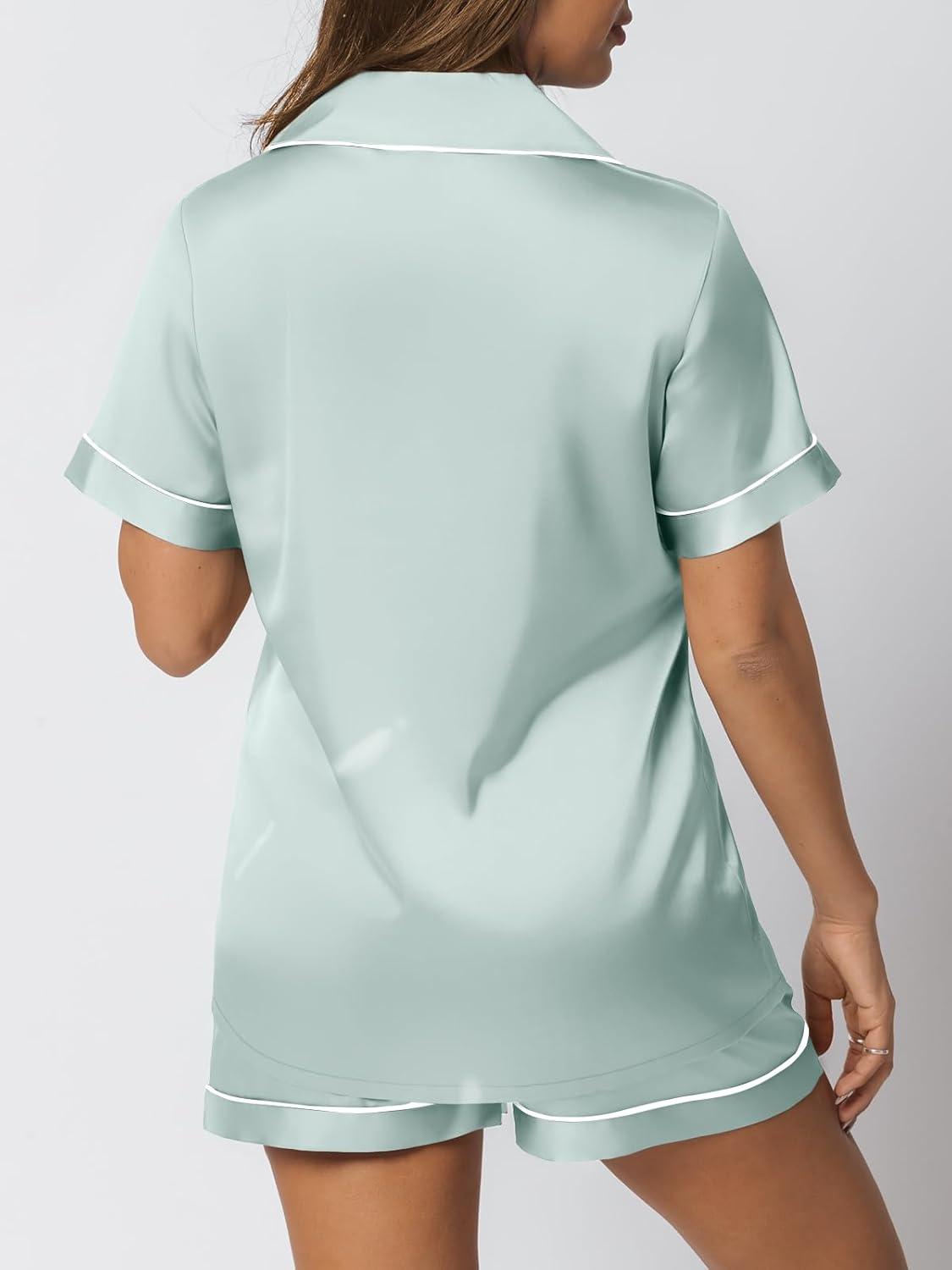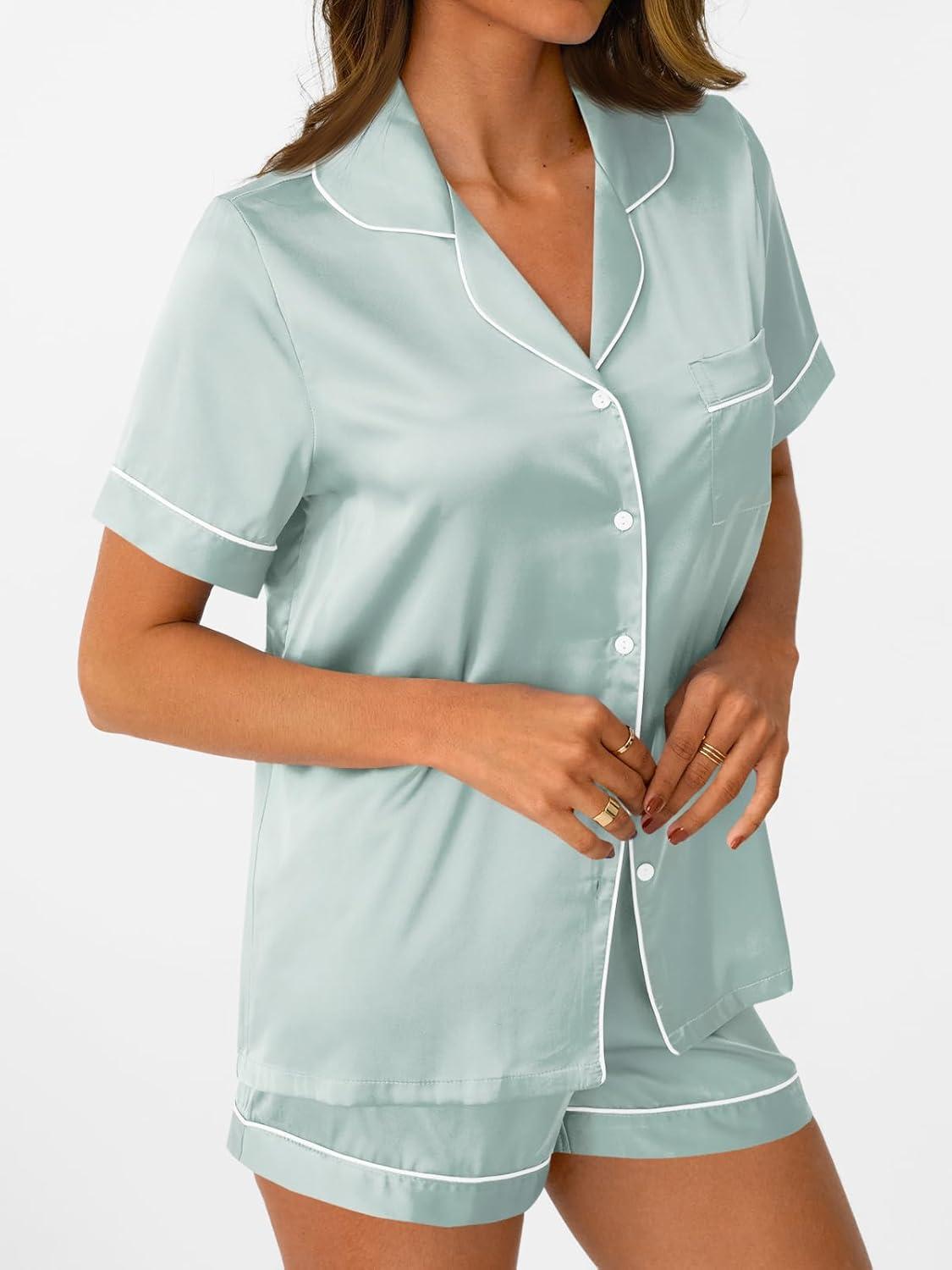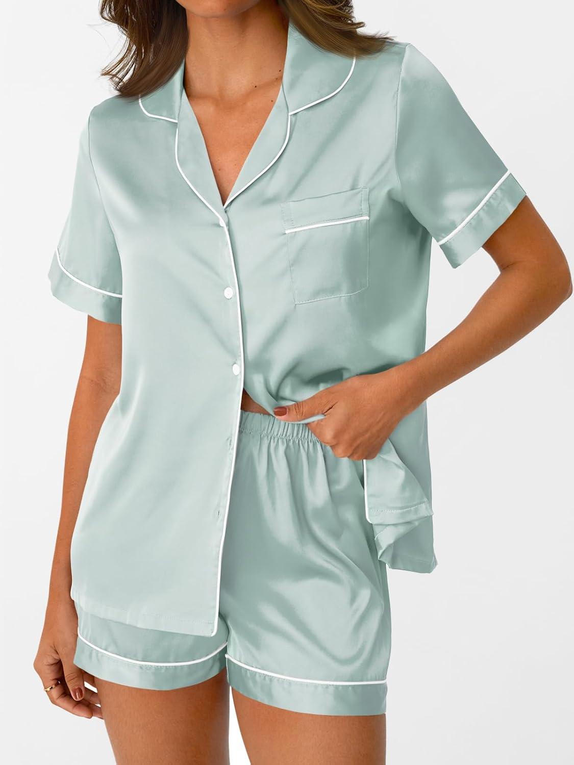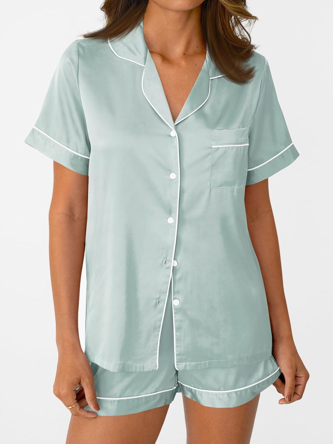 AUTOMET Women Silk Satin Fall Pajama Set Matching Lounge Pjs Button Up Soft 2 Piece Suit Ladies Tops and Shorts(Lightgreen)