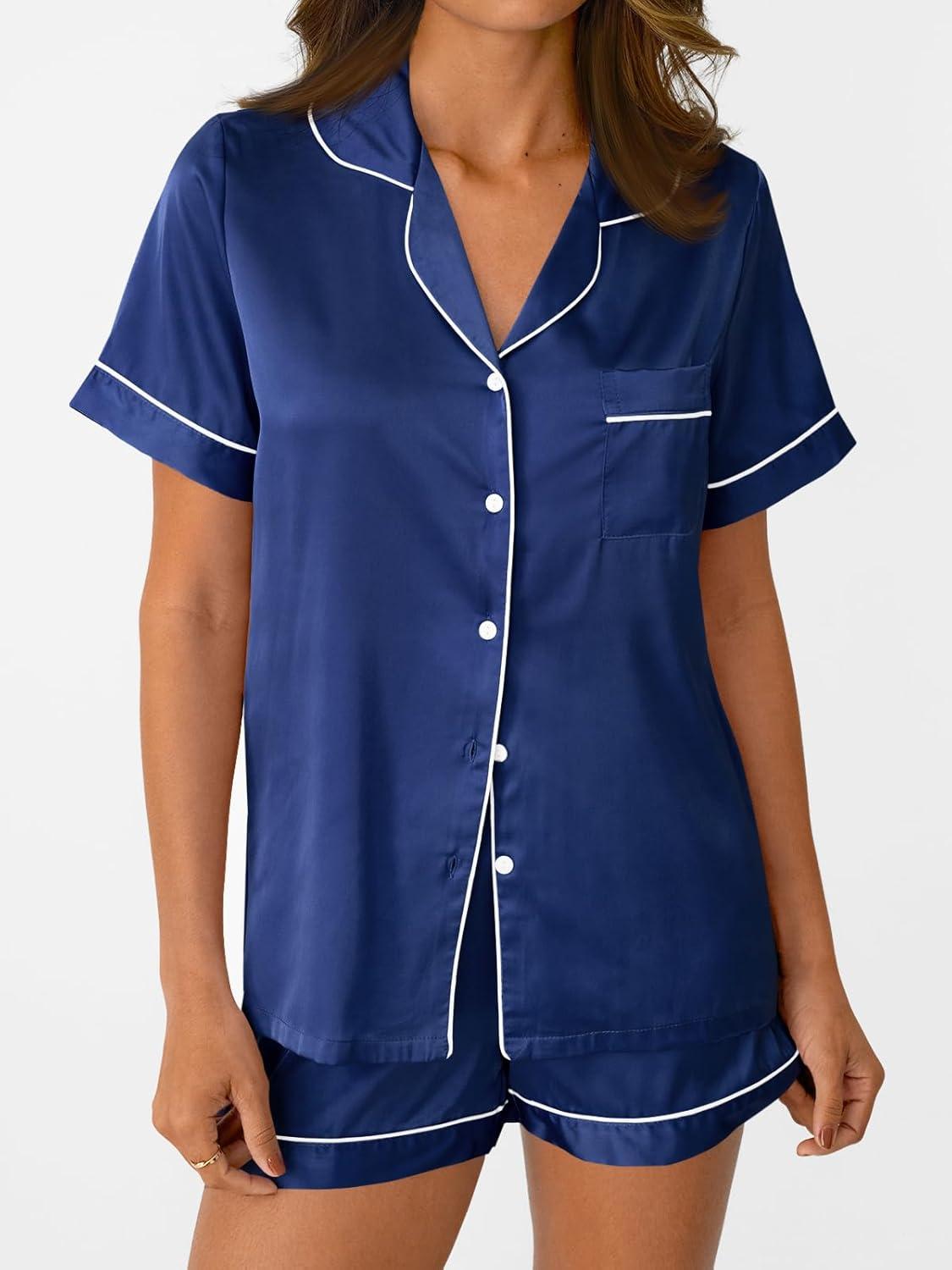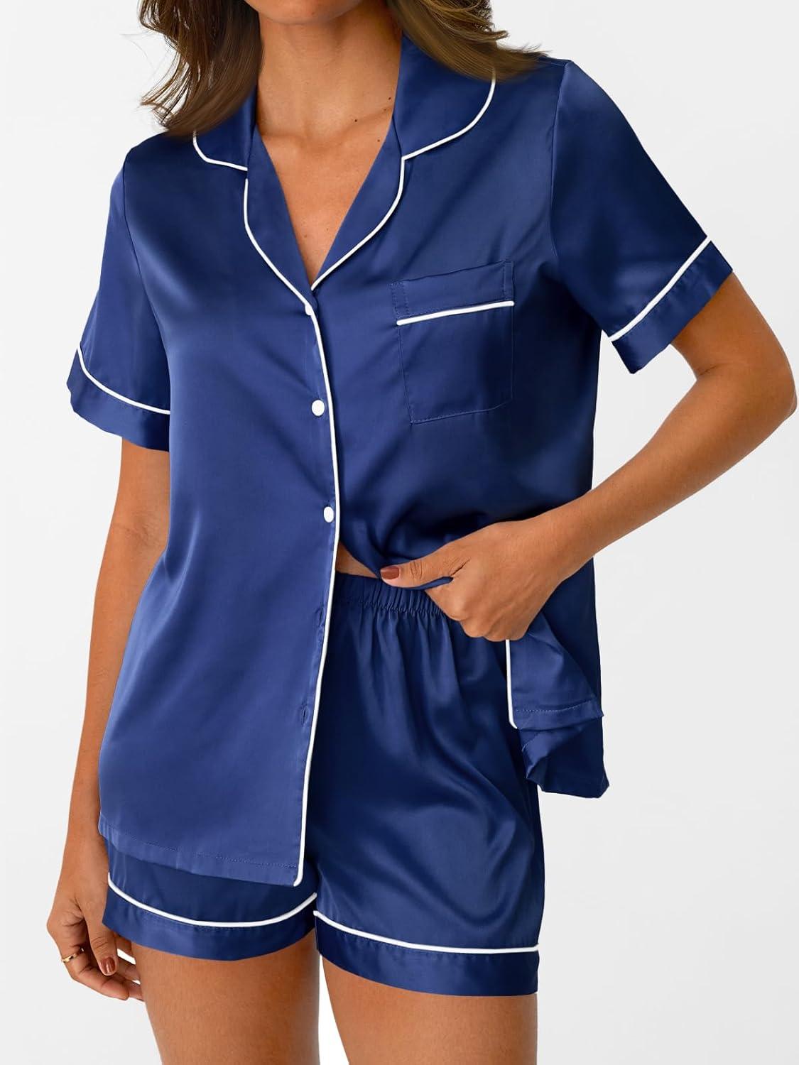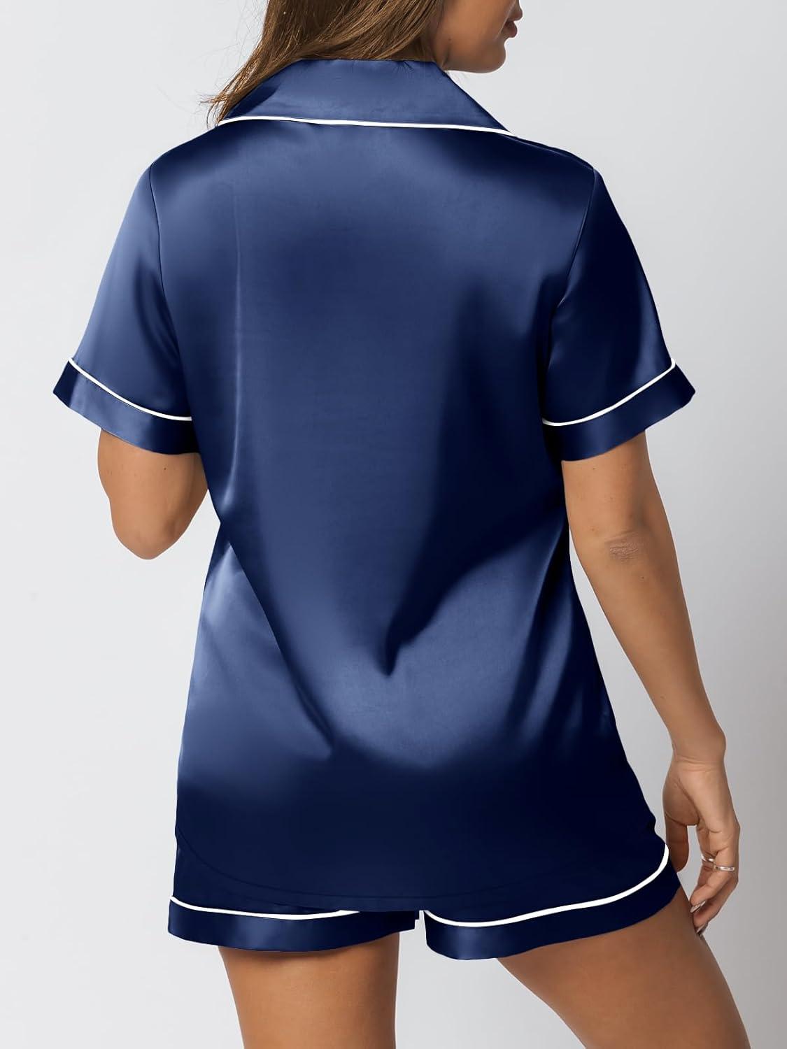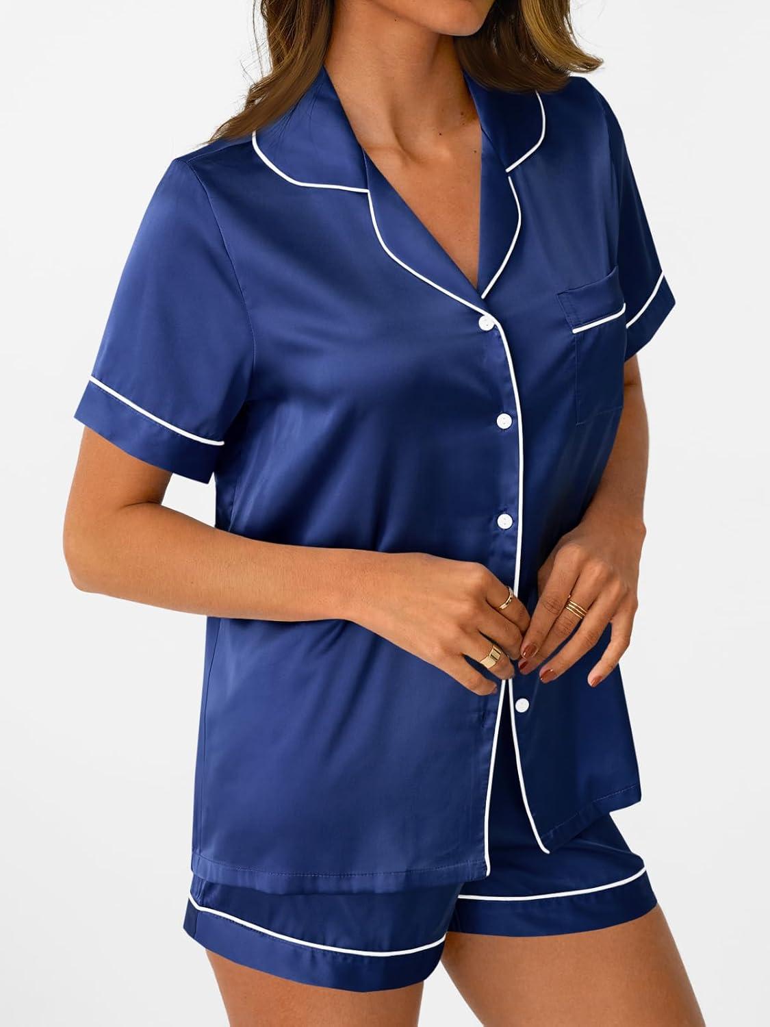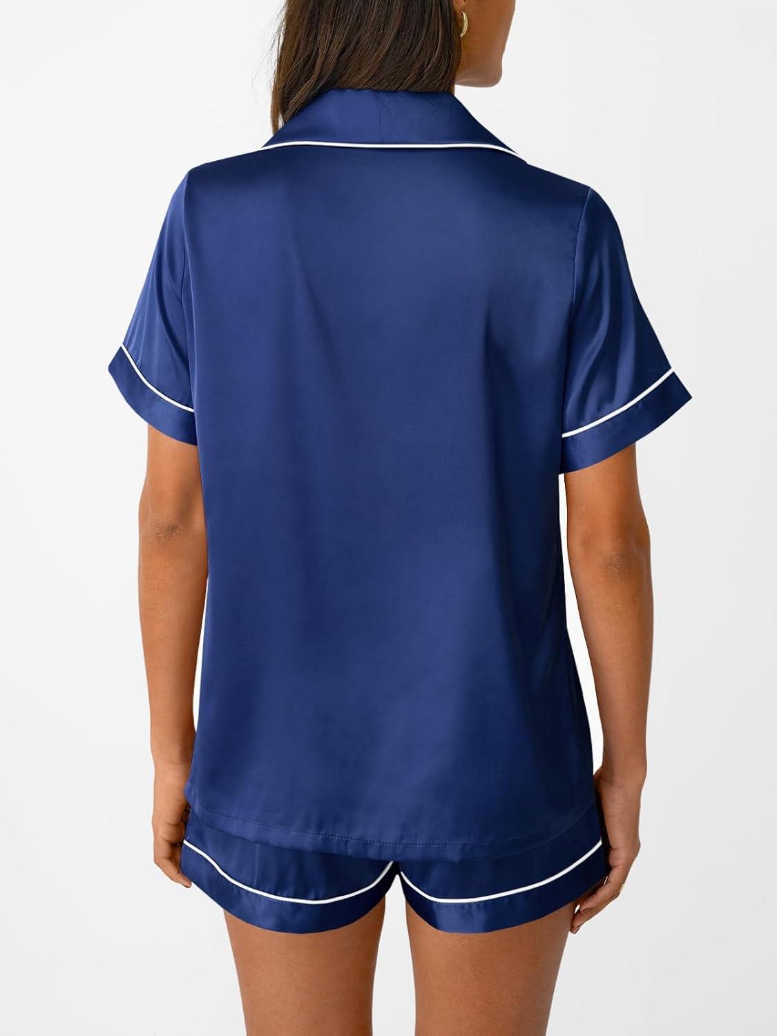 AUTOMET Women Silk Satin Fall Pajama Set Matching Lounge Pjs Button Up Soft 2 Piece Suit Ladies Tops and Shorts(Navy)
