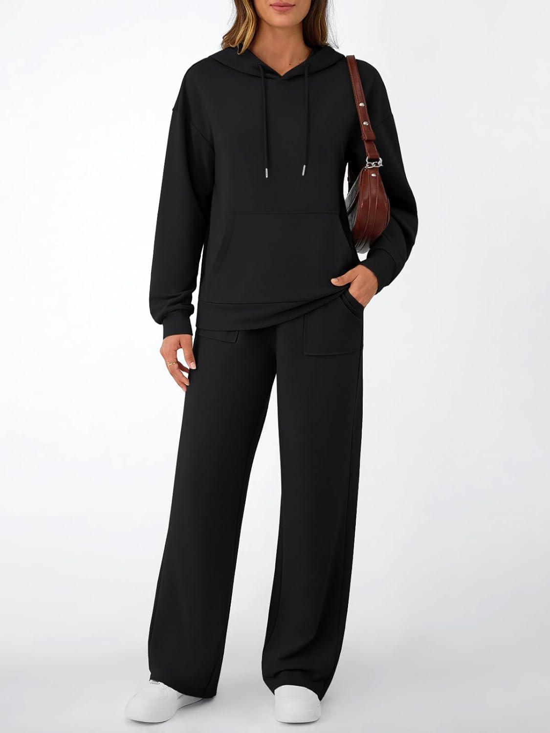 AUTOMET Womens 2 Piece Outfits Sweatsuits Lounge Matching Fall Sets Jogging Suit Oversized Hoodie Wide Leg Sweatpant Clothes(Black)