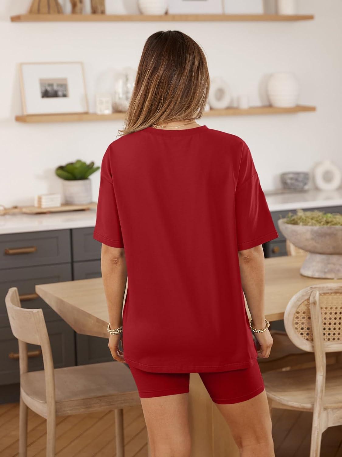 AUTOMET Womens 2 Piece Sets Summer Outfits 2025 Two Piece Lounge Set Matching Clothing Oversized Tshirts Biker Short Fashion(Red)