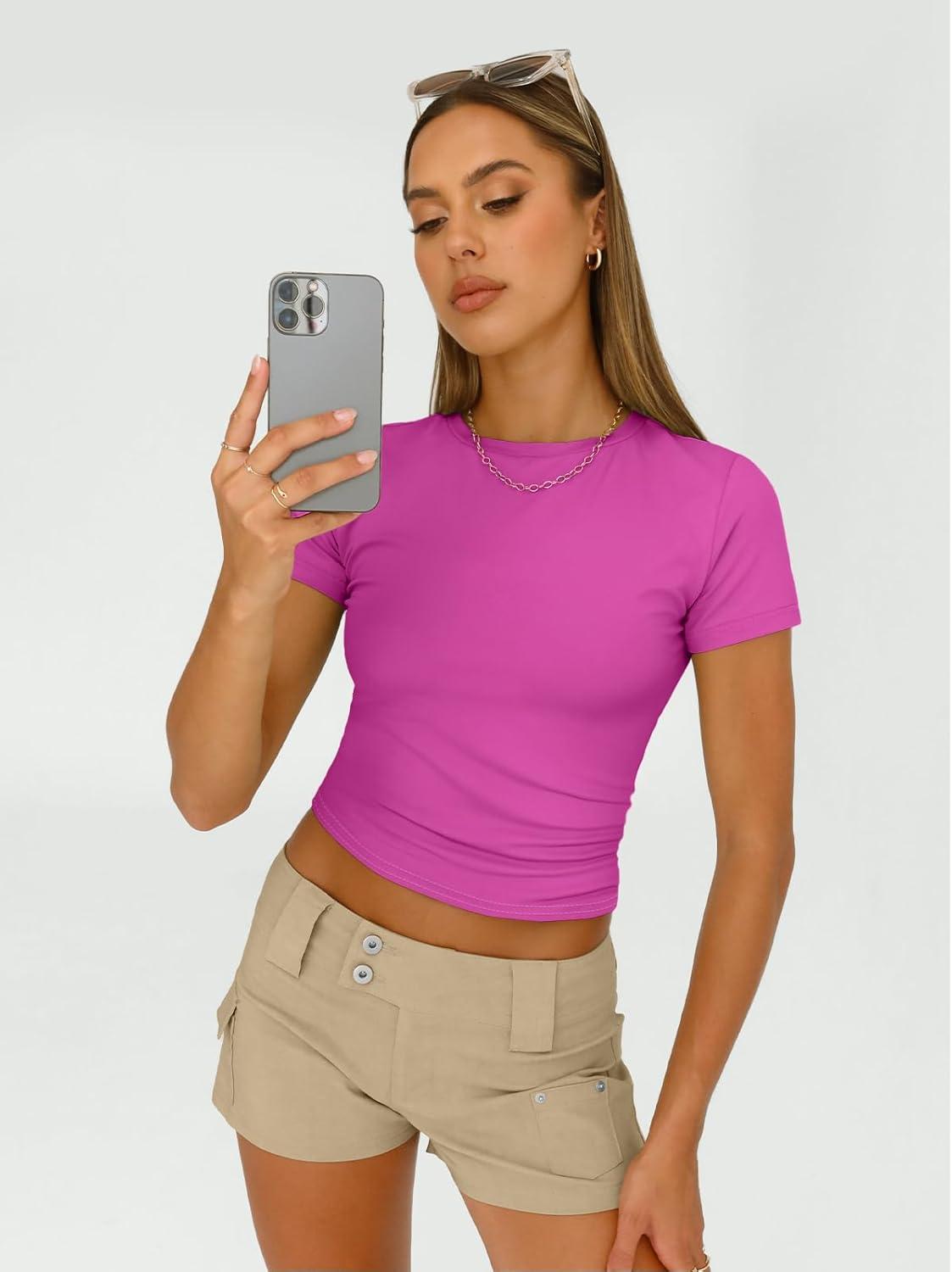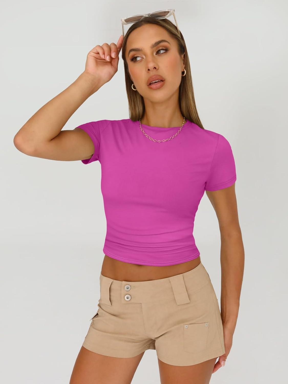 AUTOMET Womens 3 Piece Short Sleeve Shirts Basic Going Out Slim Fitted Crop Tops 2025 Summer Y2k Clothes(Black white hotpink)