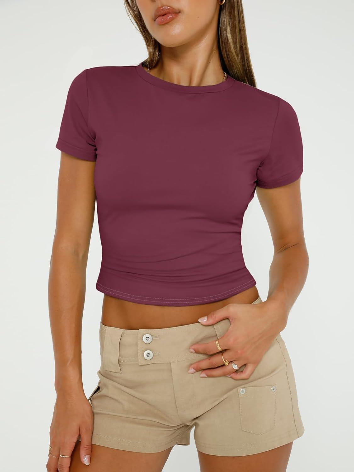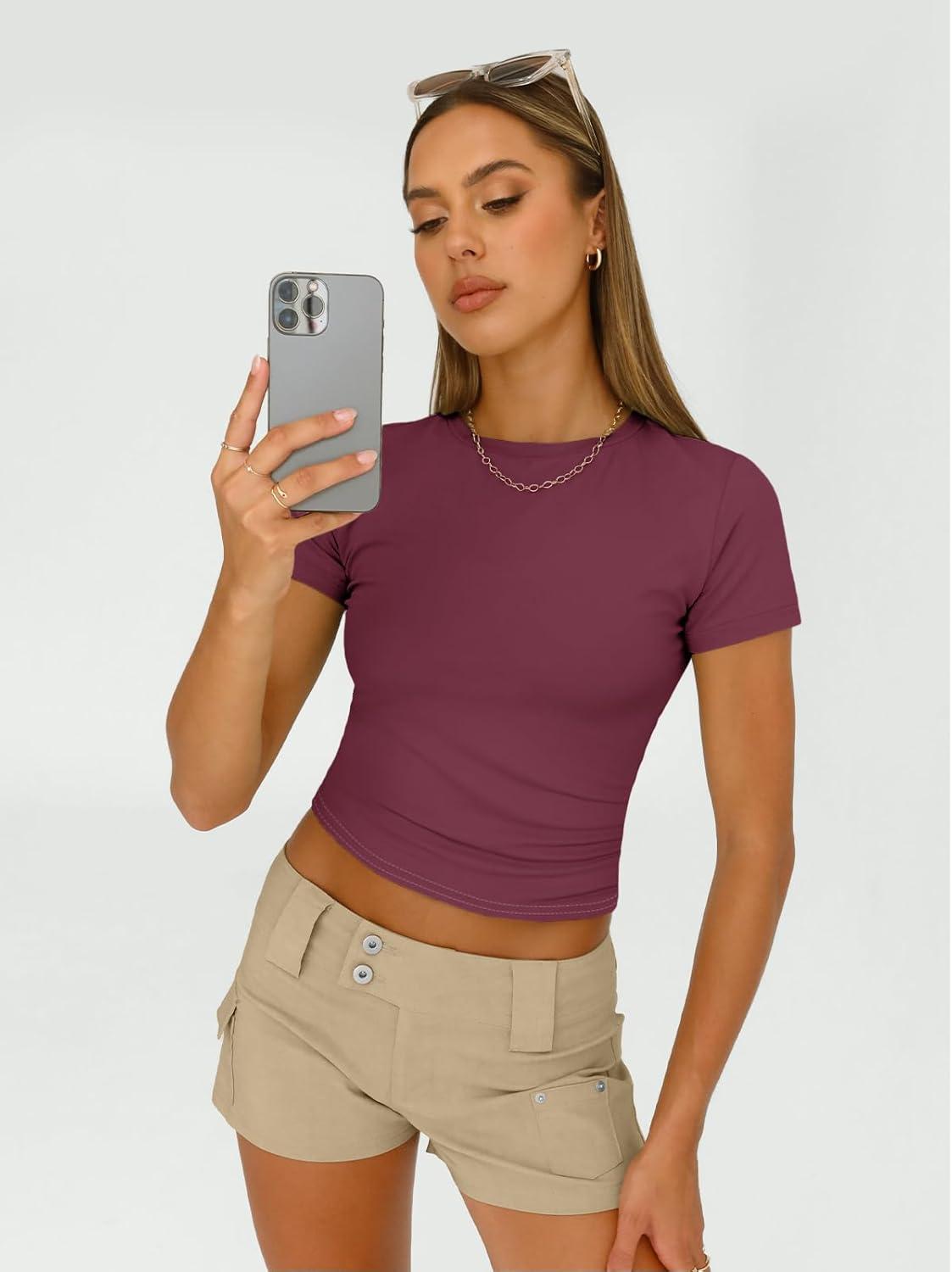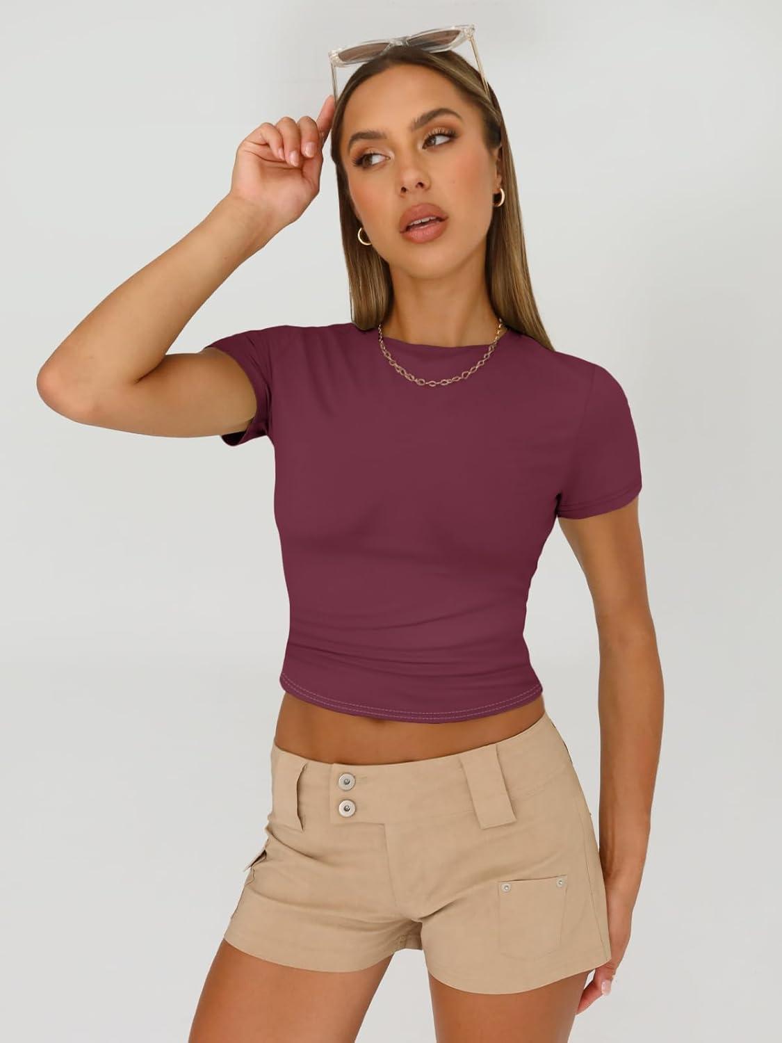 AUTOMET Womens 3 Piece Short Sleeve Shirts Basic Going Out Slim Fitted Crop Tops 2025 Summer Y2k Clothes(Black white winered)