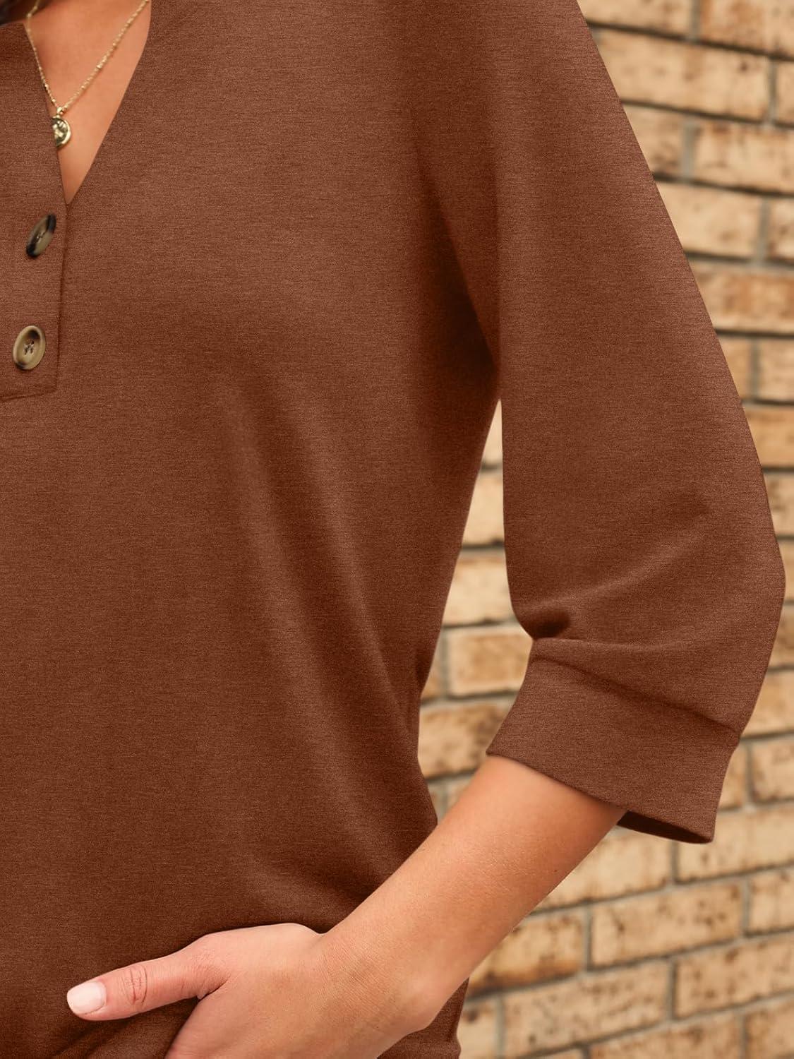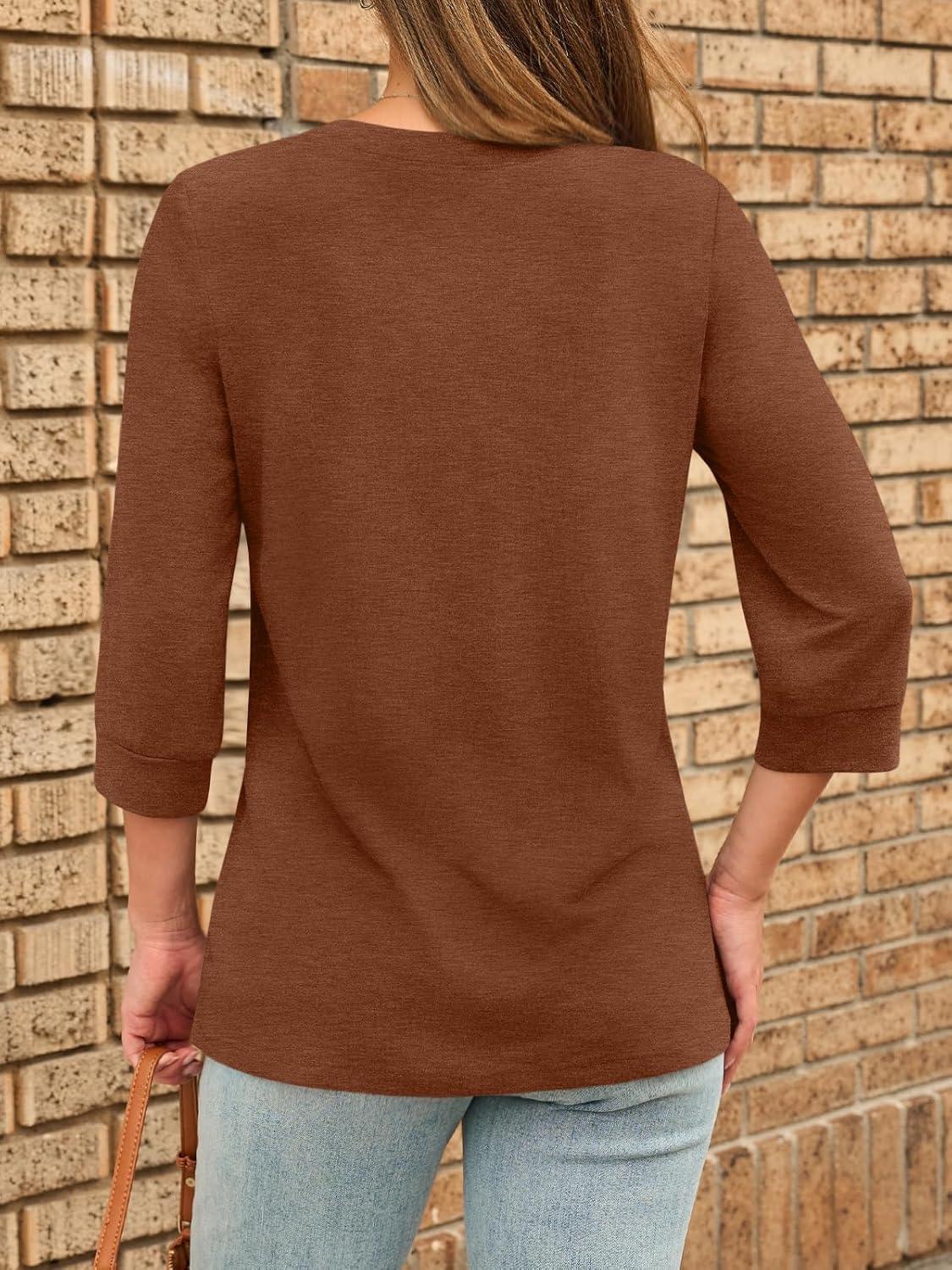AUTOMET Womens Blouses Henley V Neck Shirts 3/4 Length Sleeve Summer Tops(Maple)