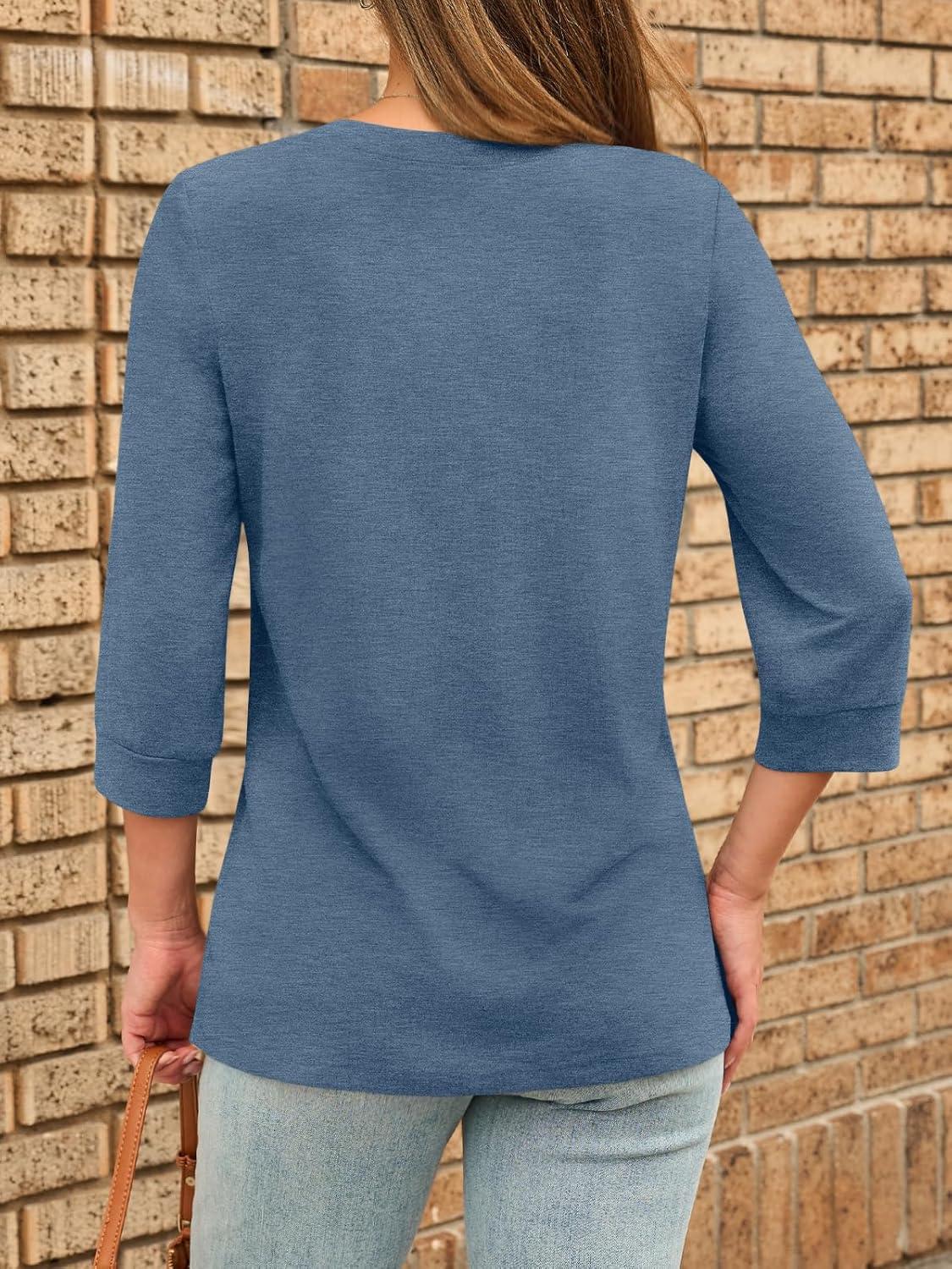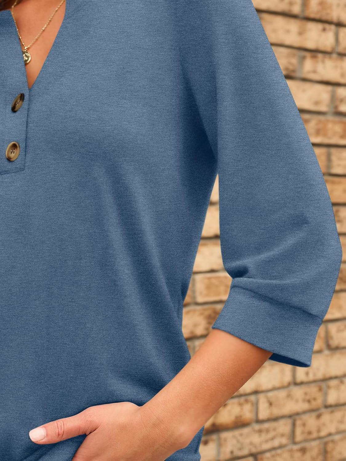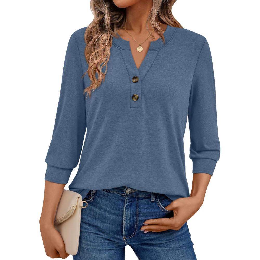 AUTOMET Womens Blouses Henley V Neck Shirts 3/4 Length Sleeve Summer Tops(Navy)
