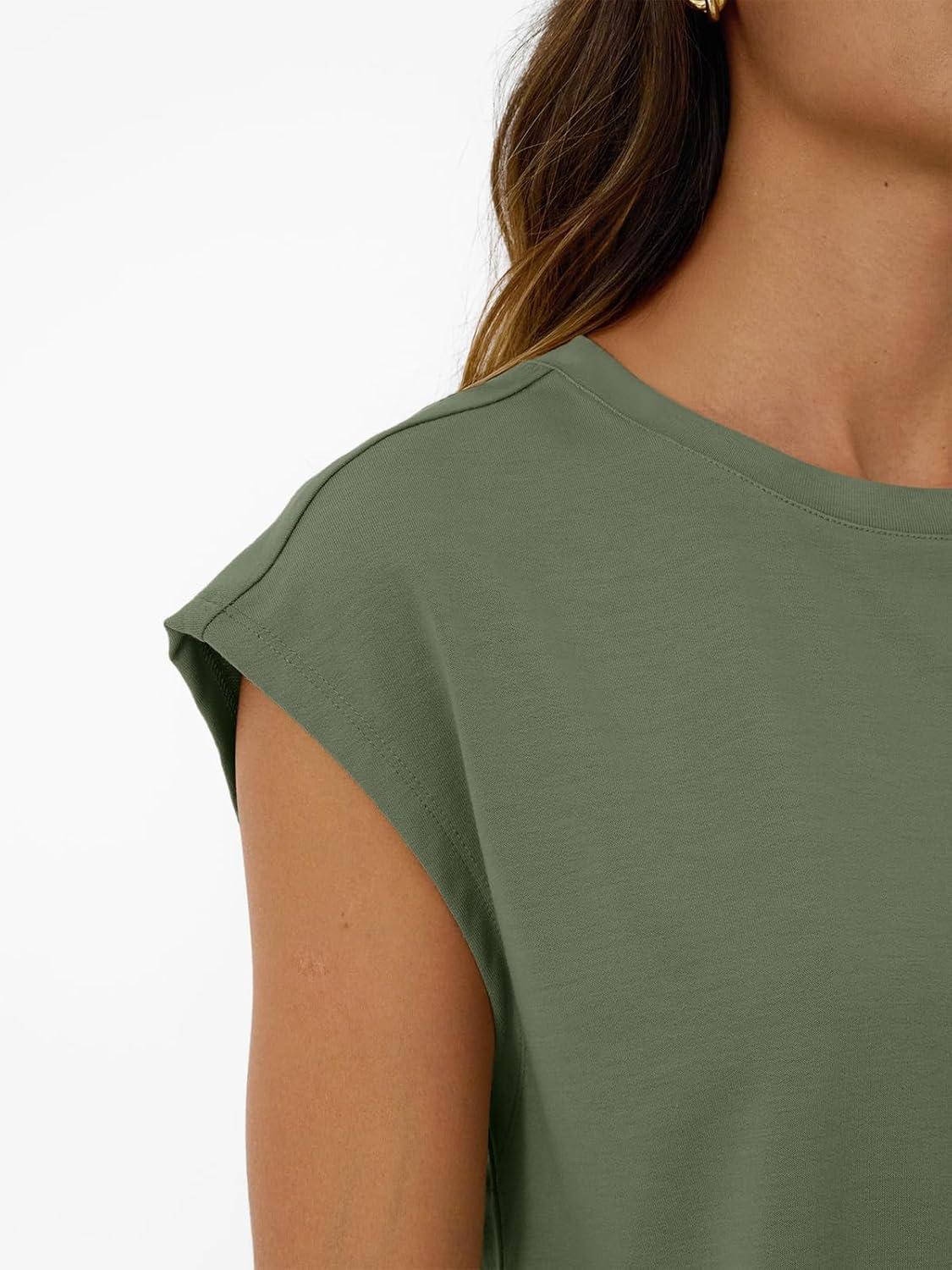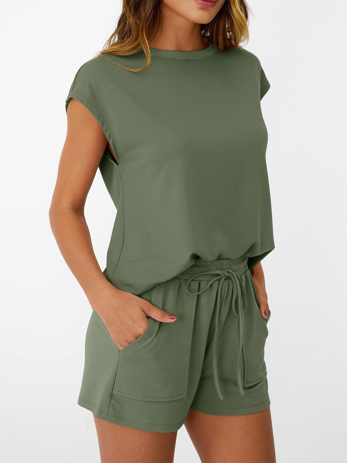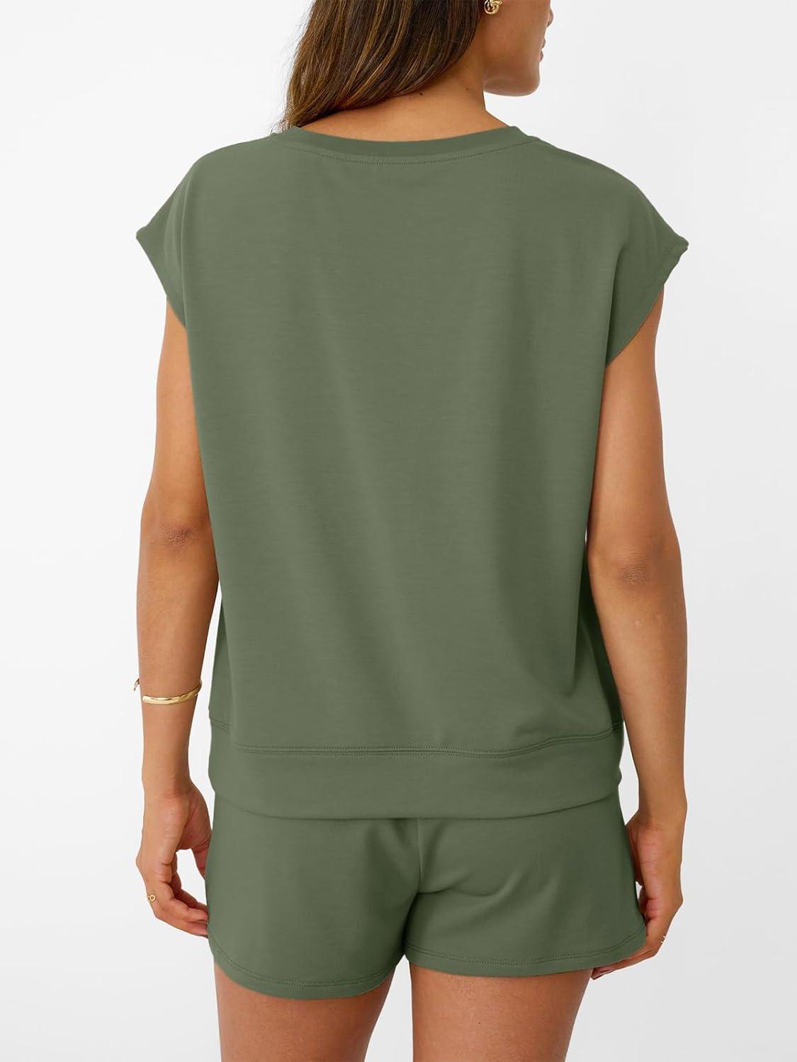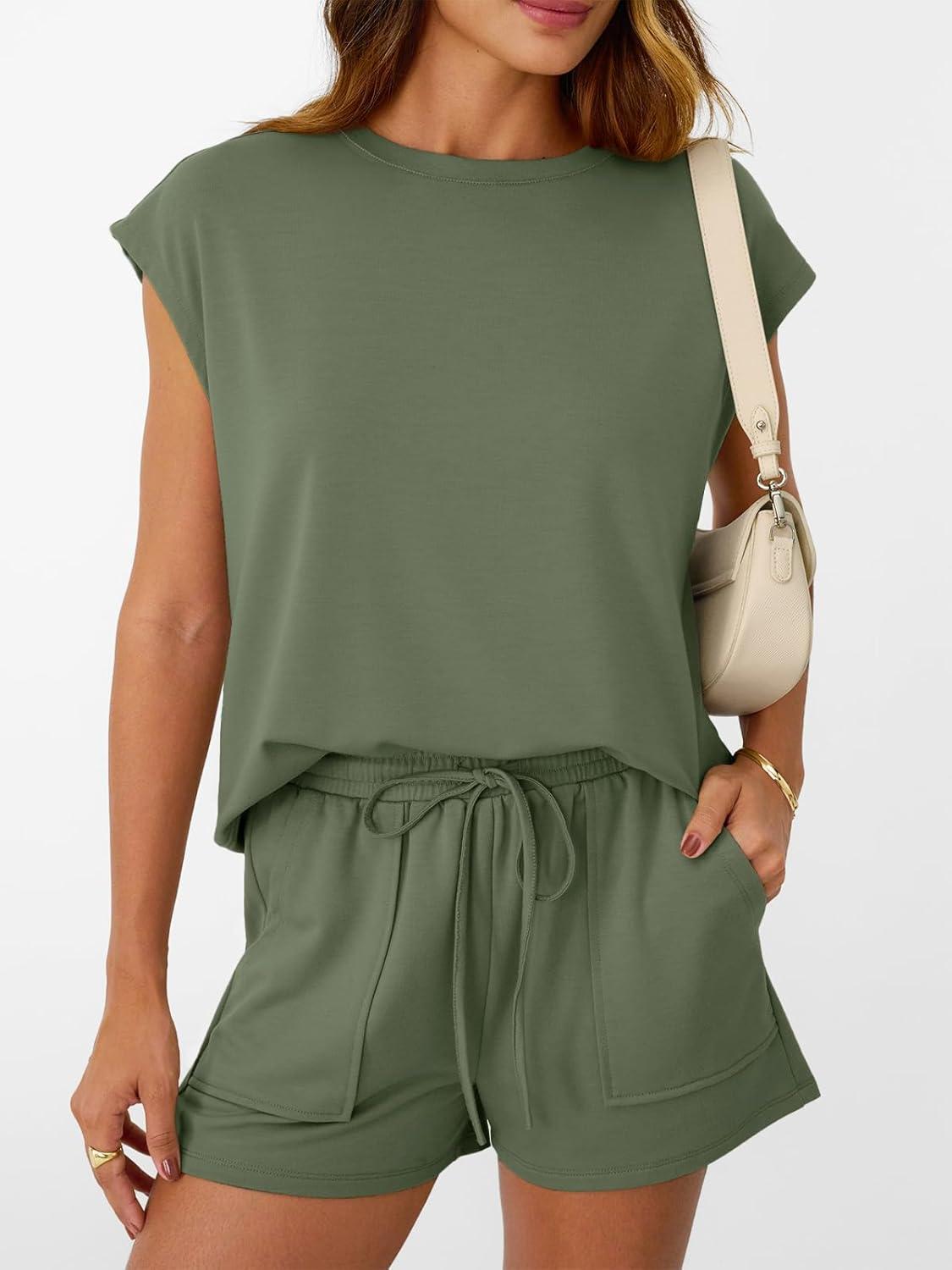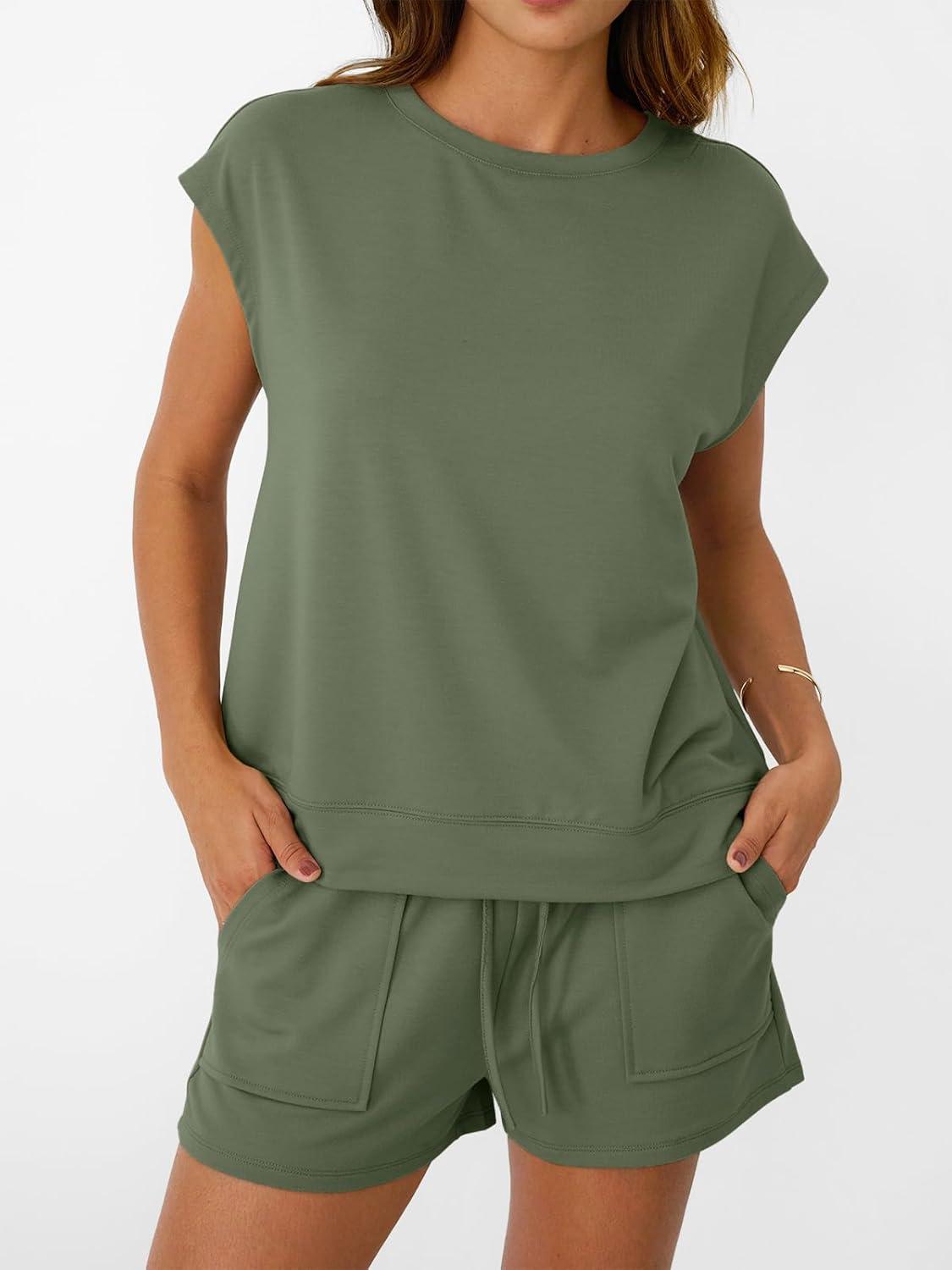 AUTOMET Womens Crew Neck Two Piece short Sets Cap Sleeve Drawstring Summer Sweatsuit with Pocket(Army Green)