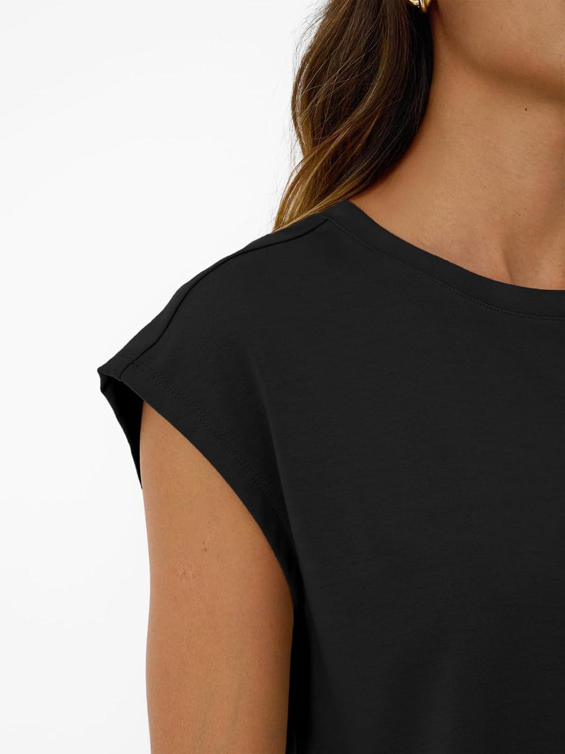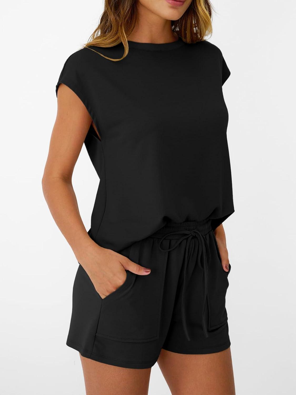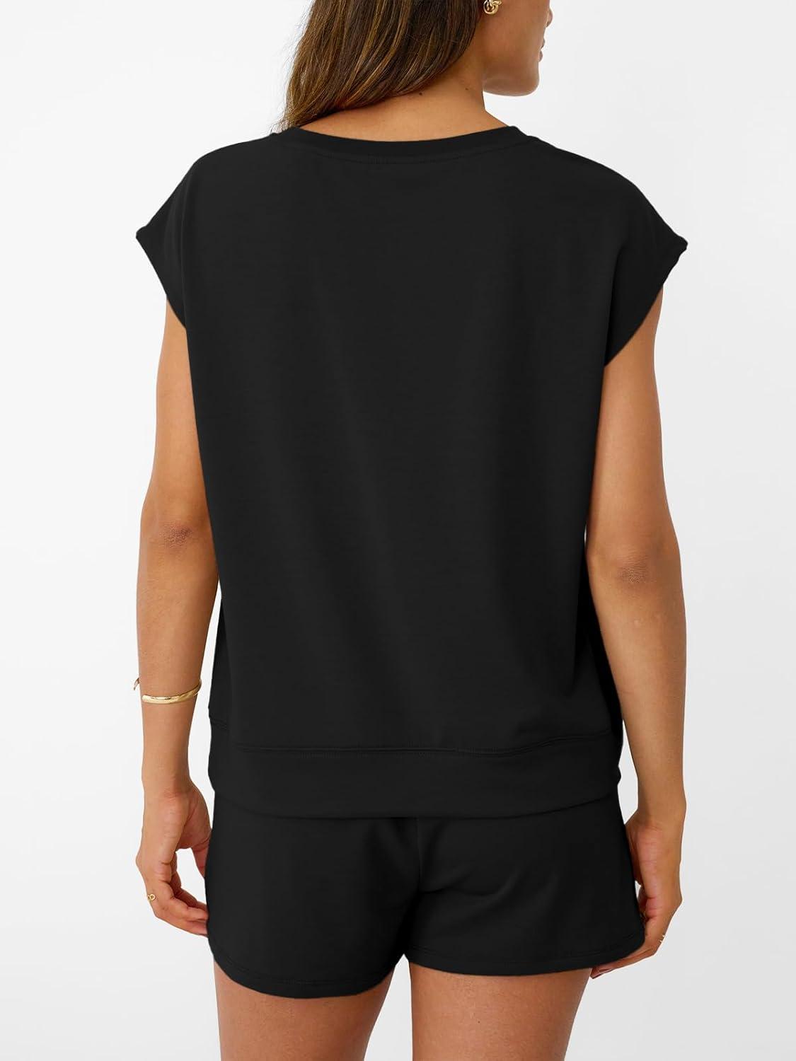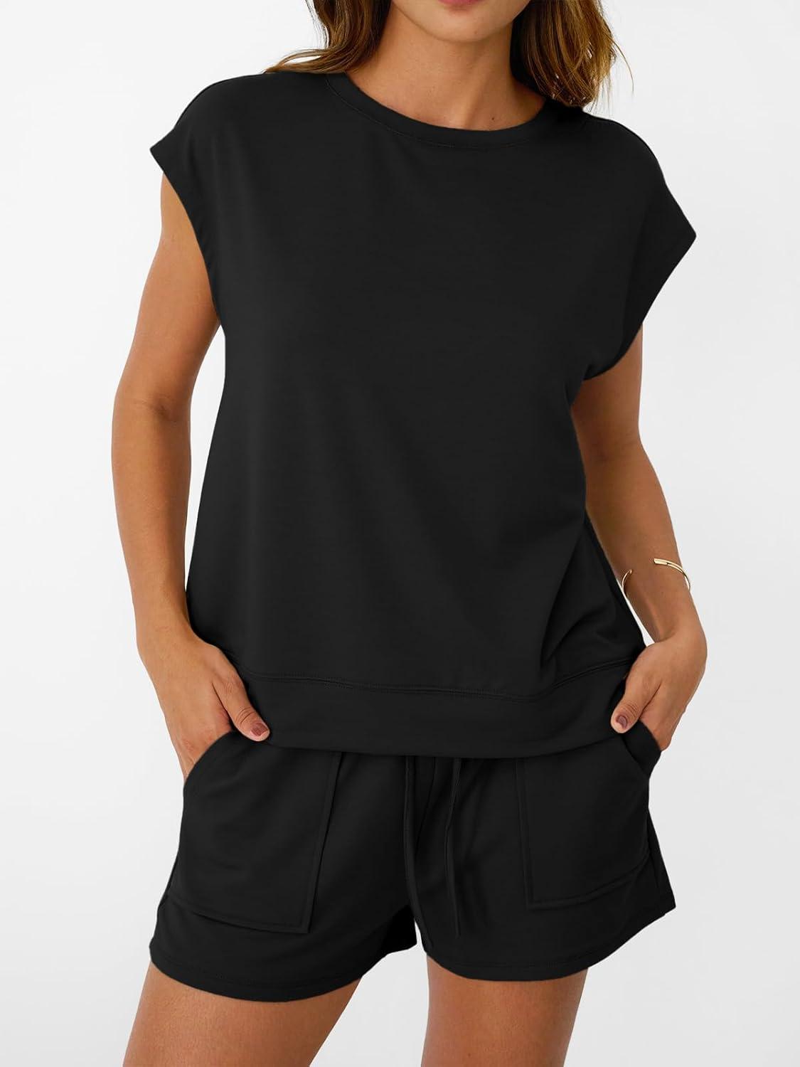AUTOMET Womens Crew Neck Two Piece short Sets Cap Sleeve Drawstring Summer Sweatsuit with Pocket(Black)