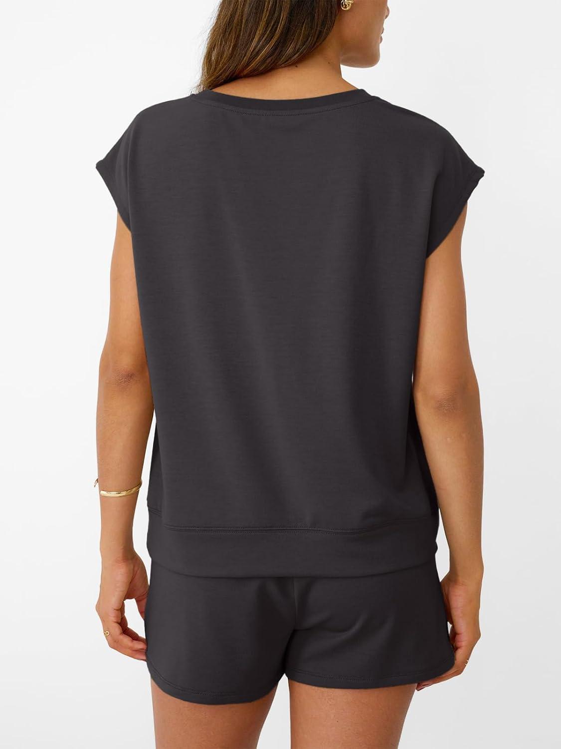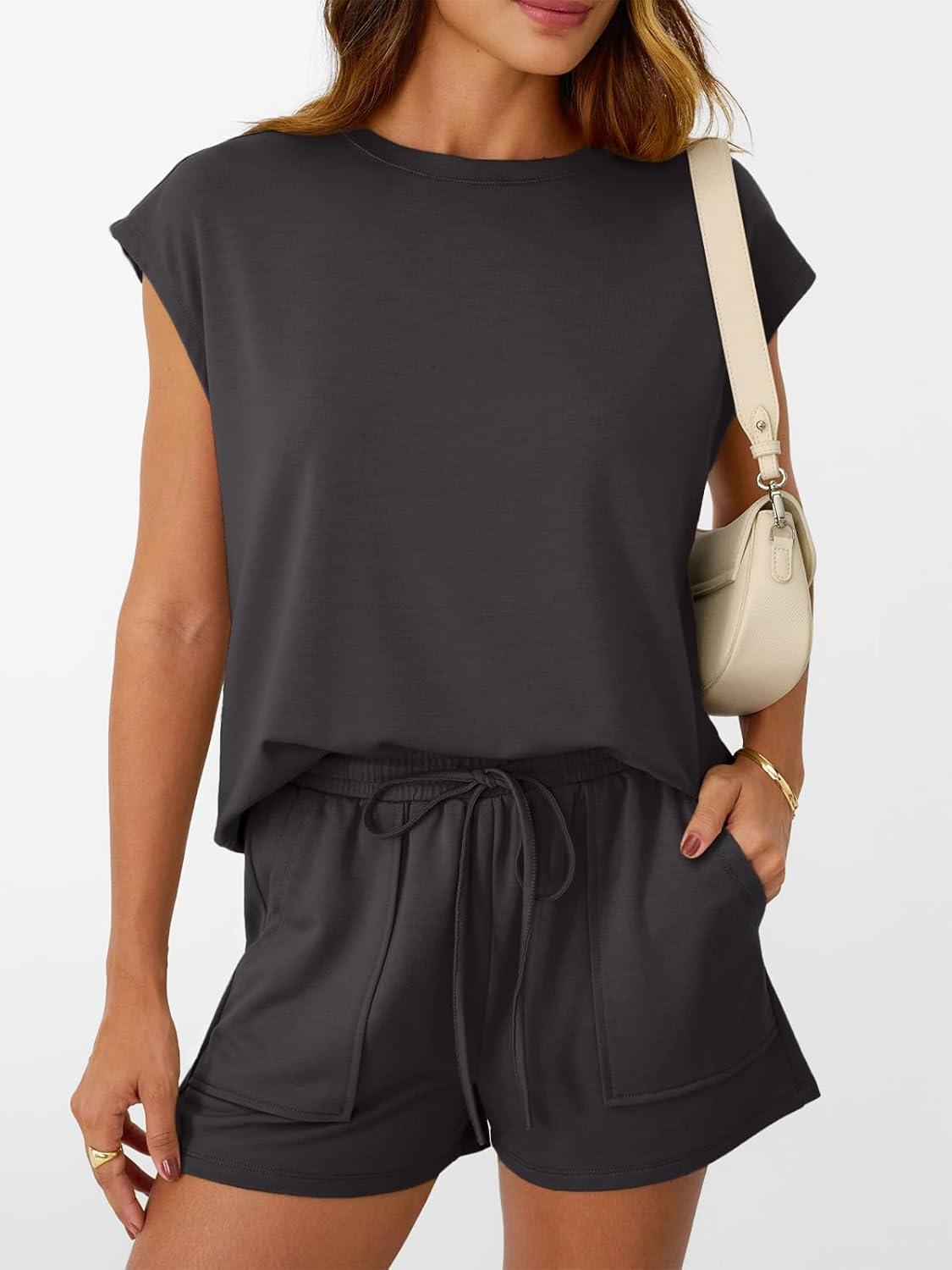 AUTOMET Womens Crew Neck Two Piece short Sets Cap Sleeve Drawstring Summer Sweatsuit with Pocket(Brown)