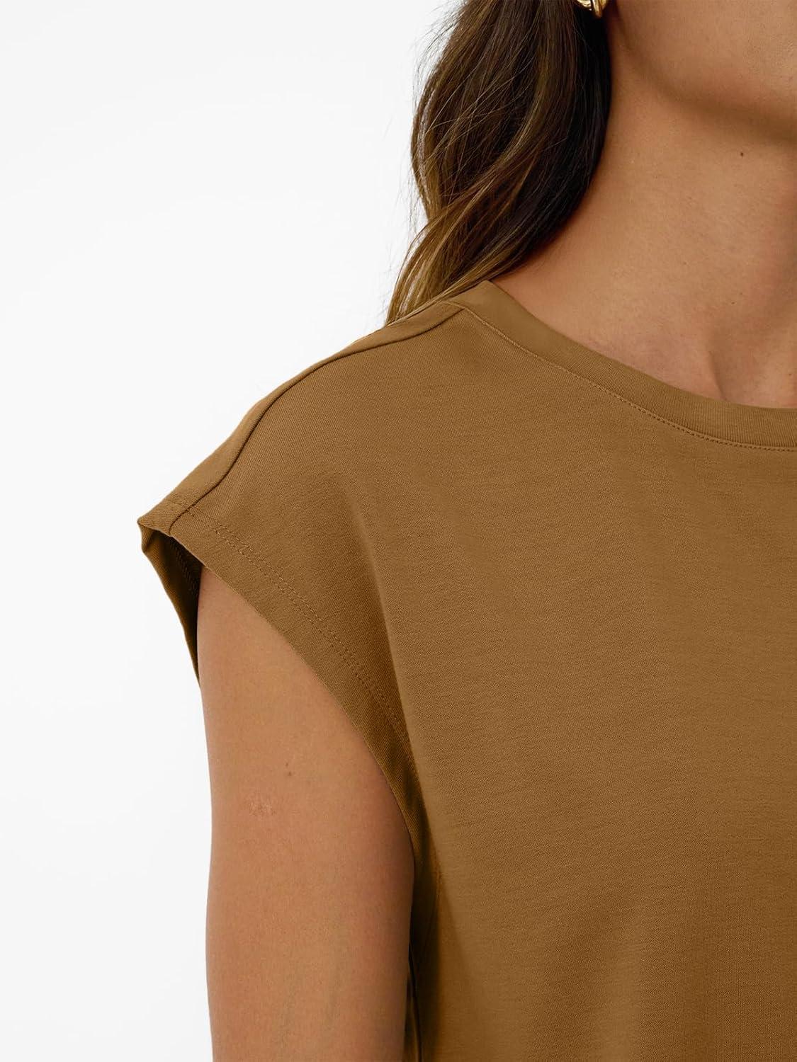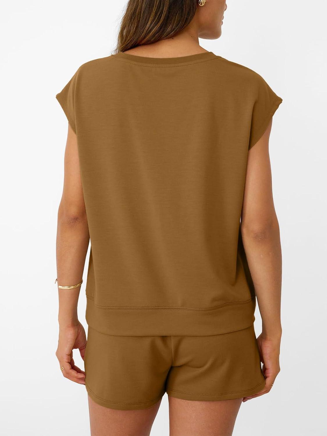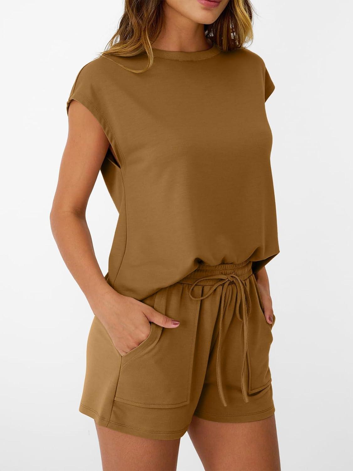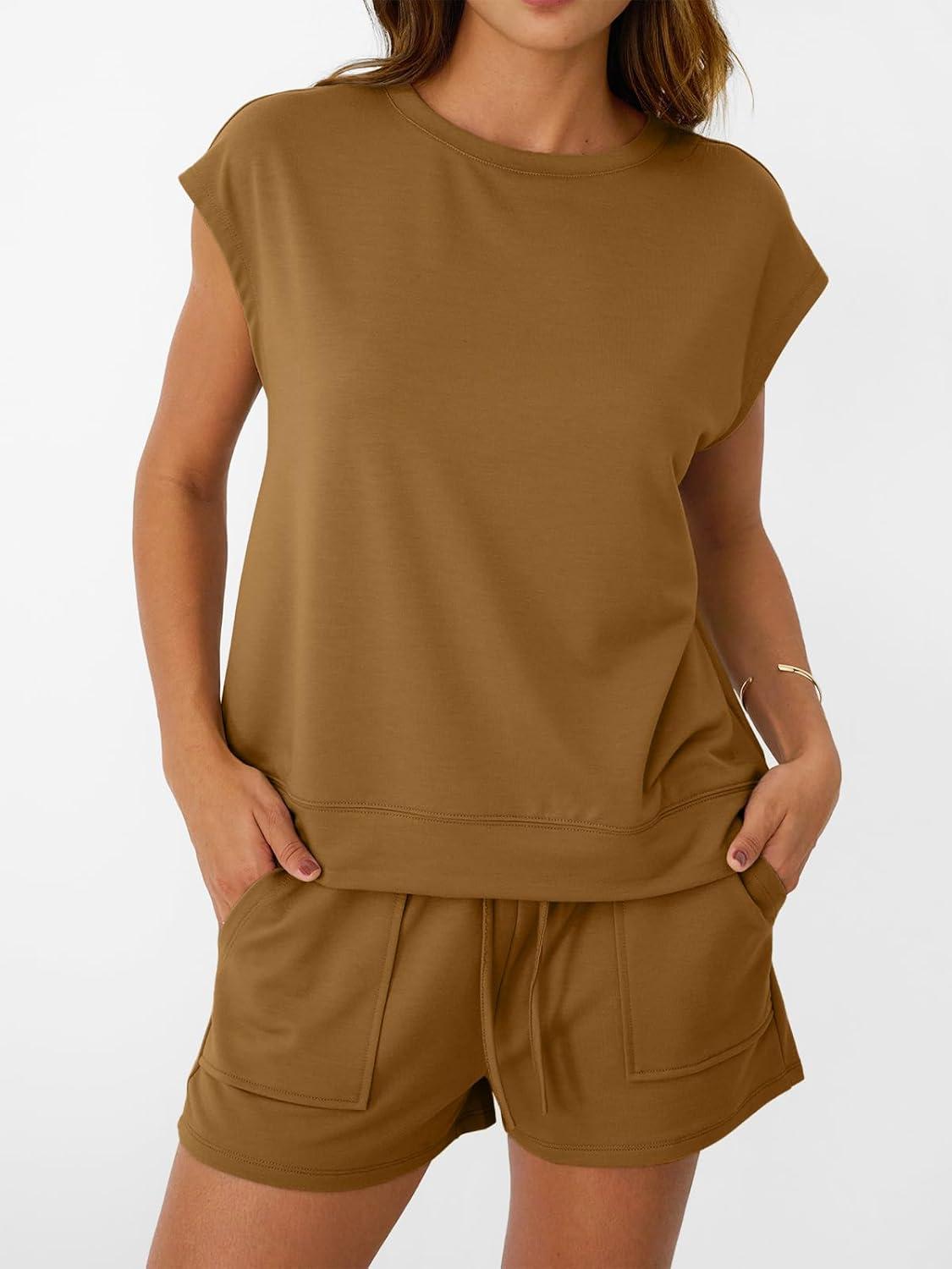 AUTOMET Womens Crew Neck Two Piece short Sets Cap Sleeve Drawstring Summer Sweatsuit with Pocket(Camel)
