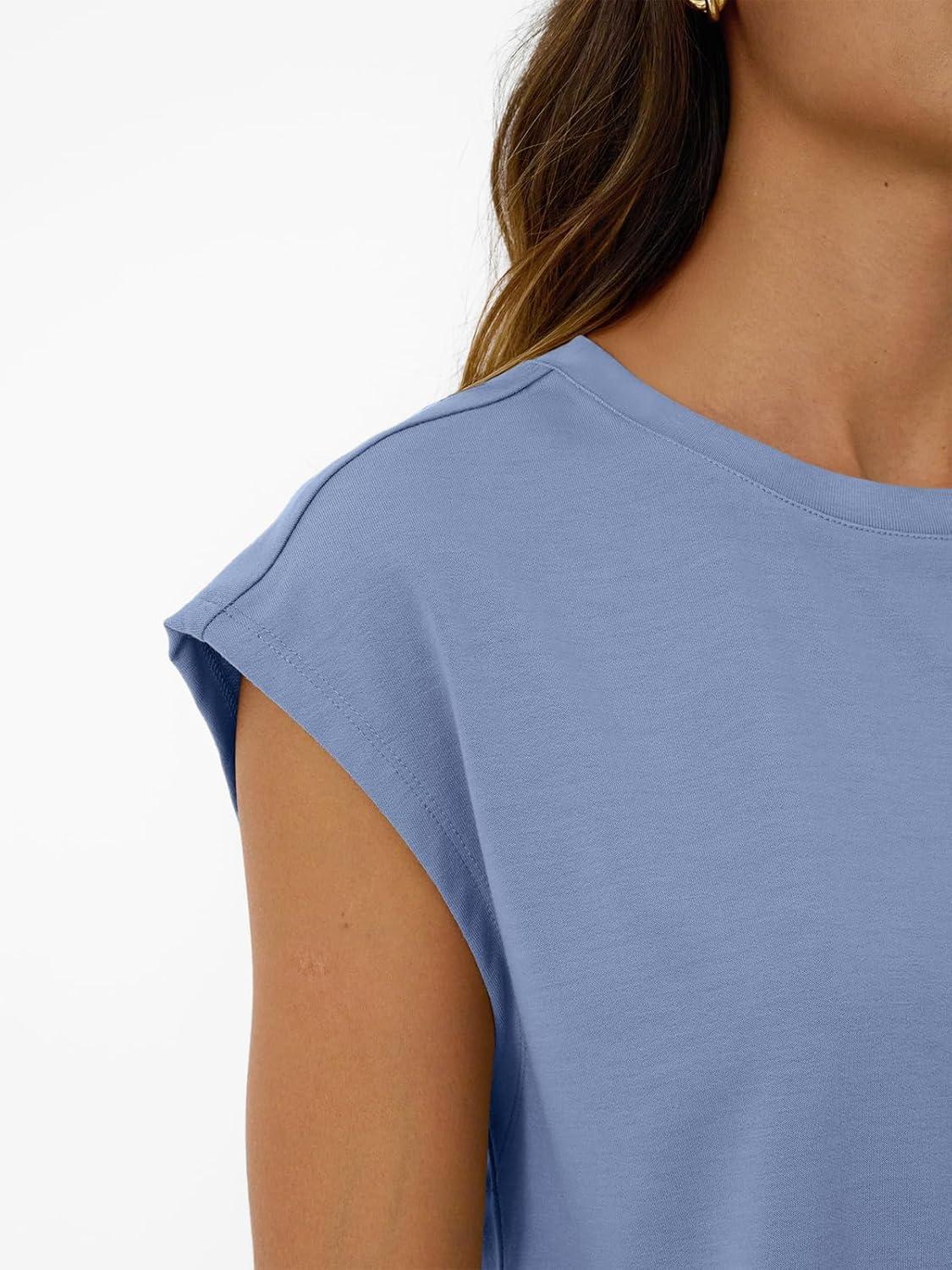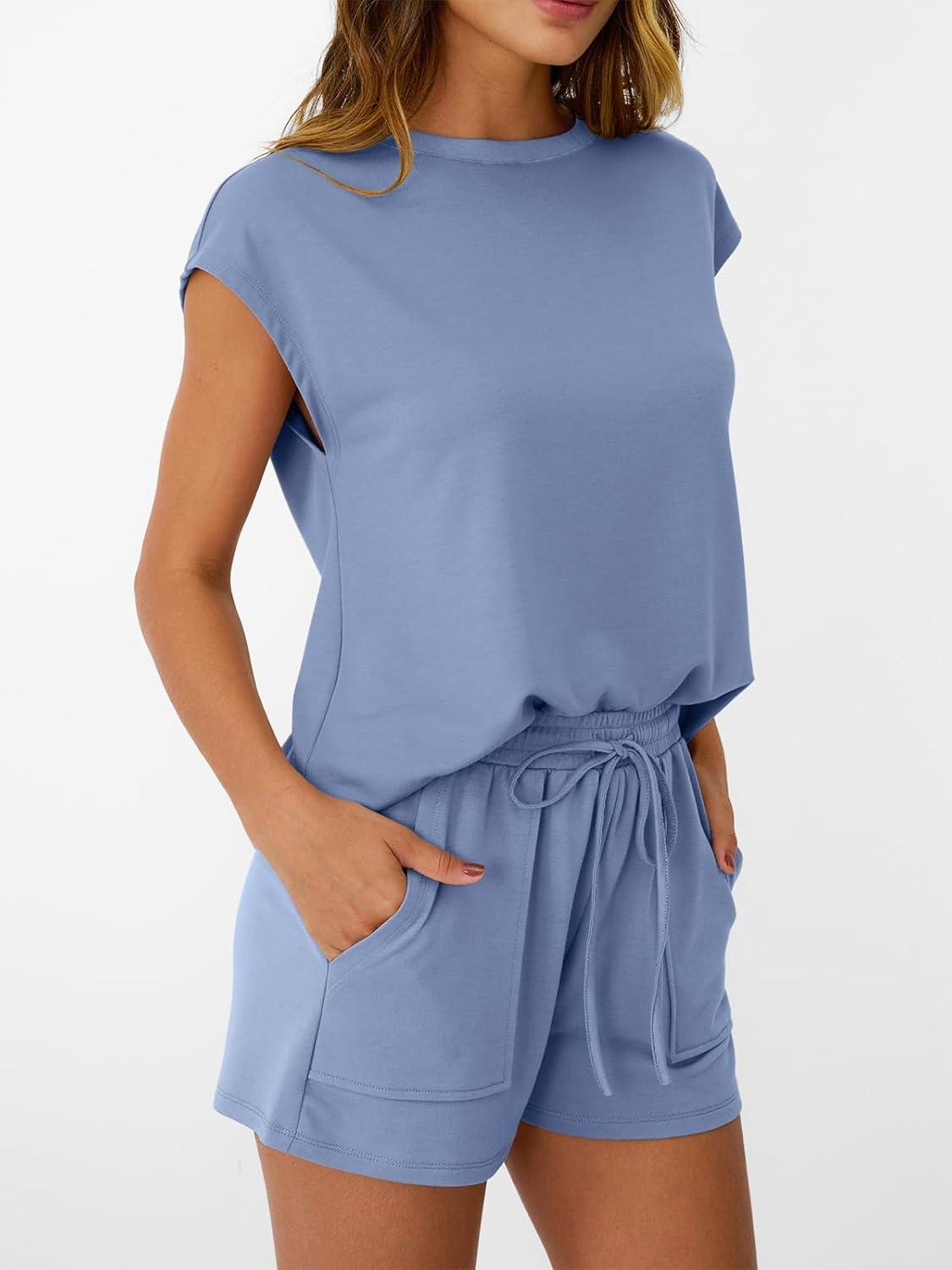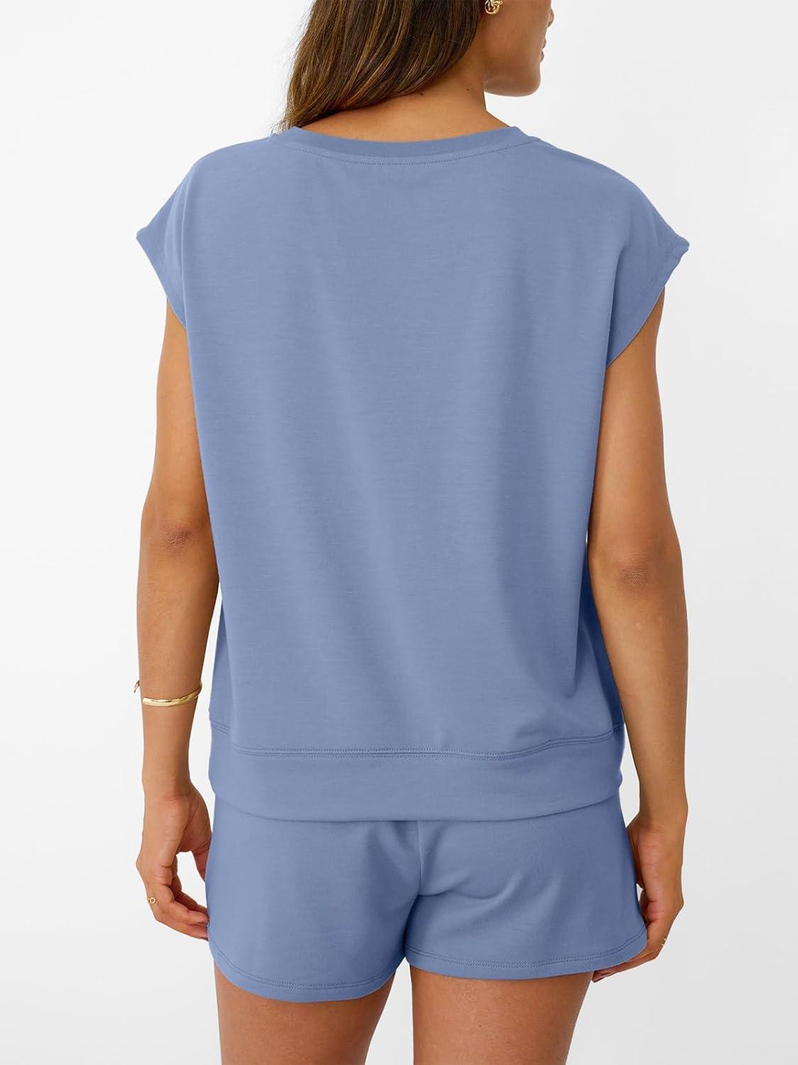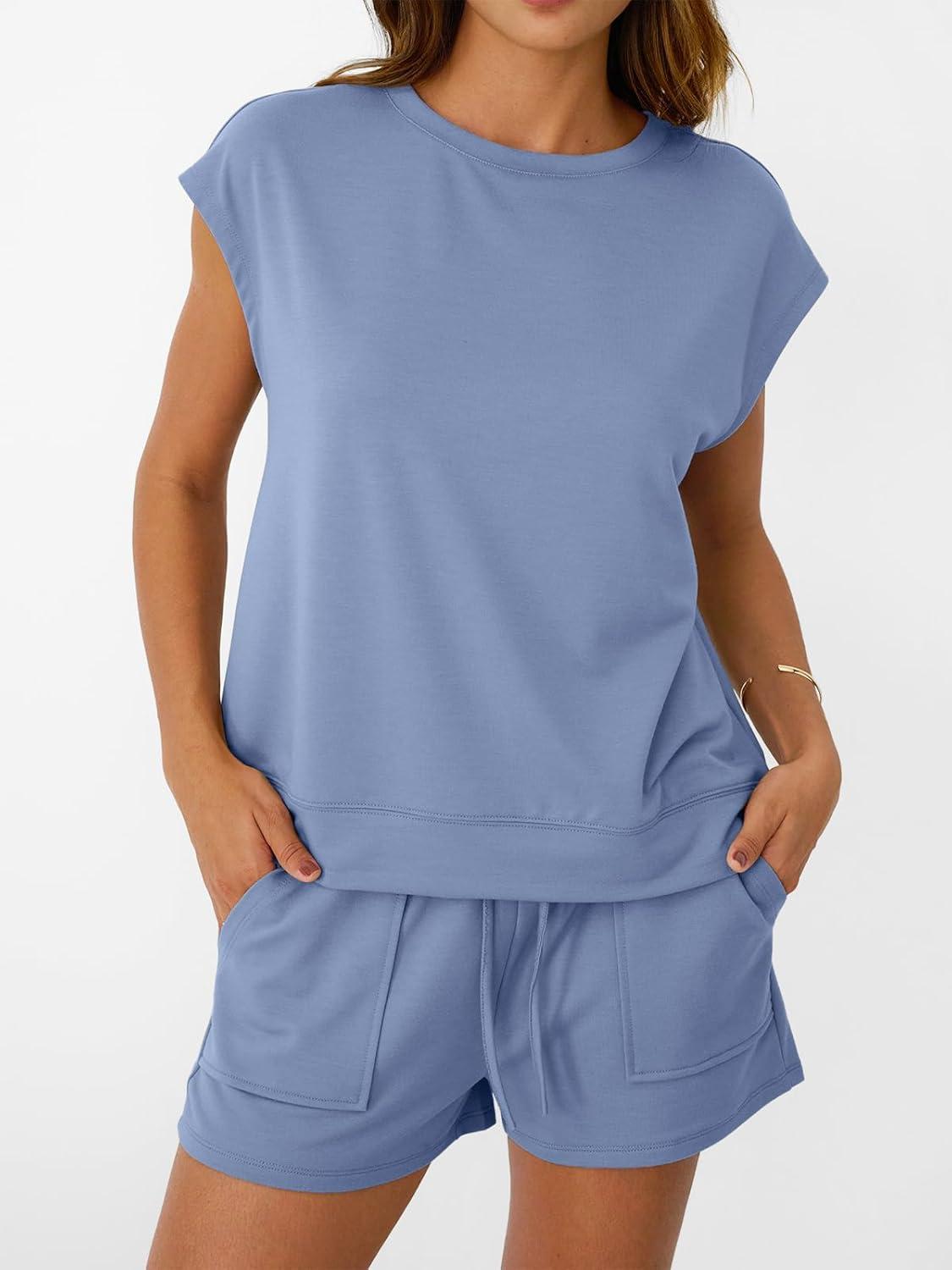 AUTOMET Womens Crew Neck Two Piece short Sets Cap Sleeve Drawstring Summer Sweatsuit with Pocket(Dusty Blue)