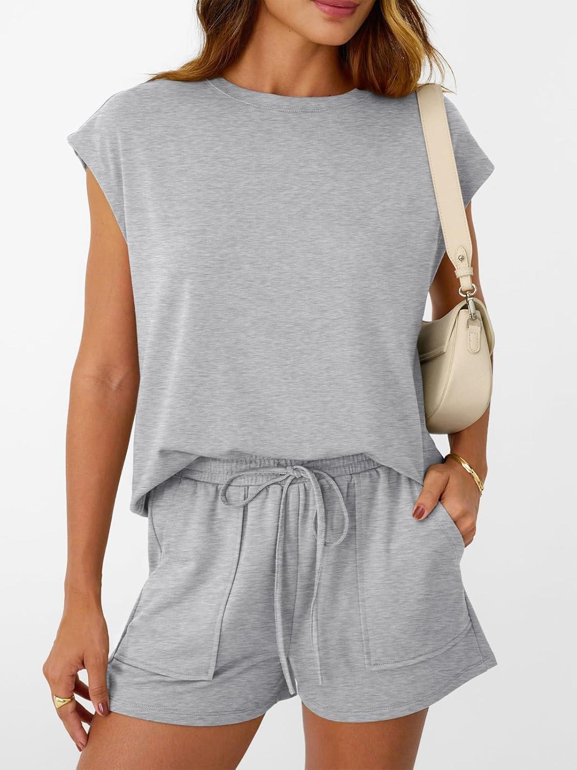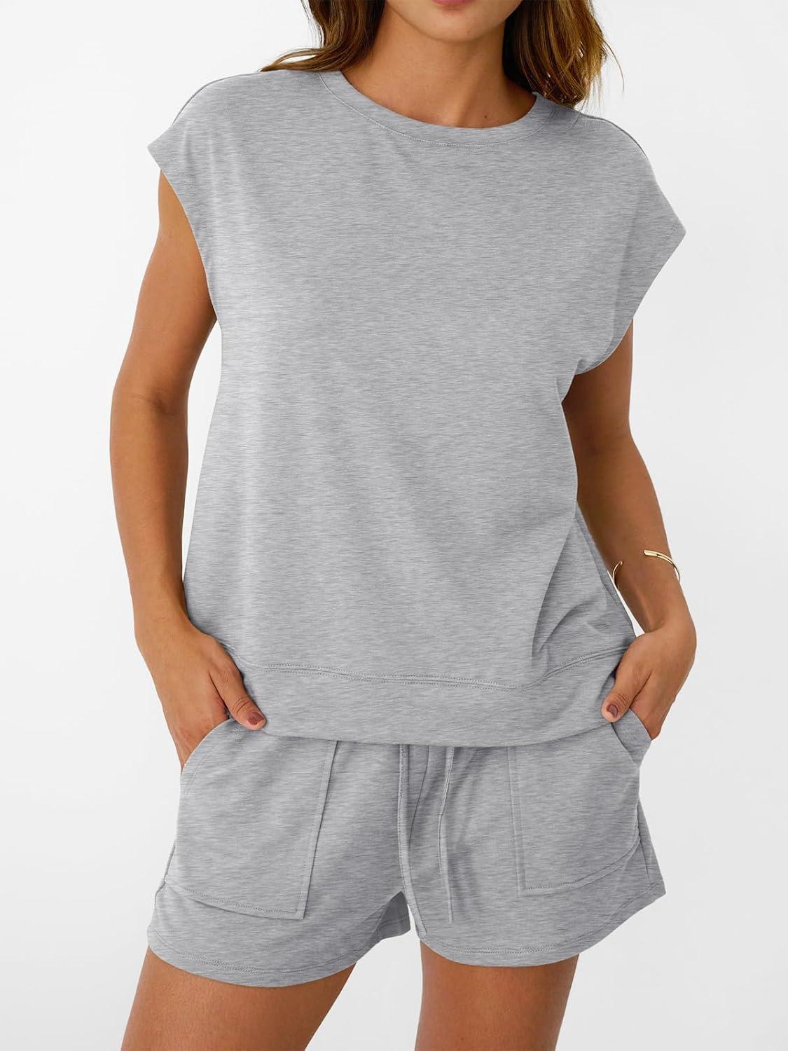 AUTOMET Womens Crew Neck Two Piece short Sets Cap Sleeve Drawstring Summer Sweatsuit with Pocket(Heather Grey)