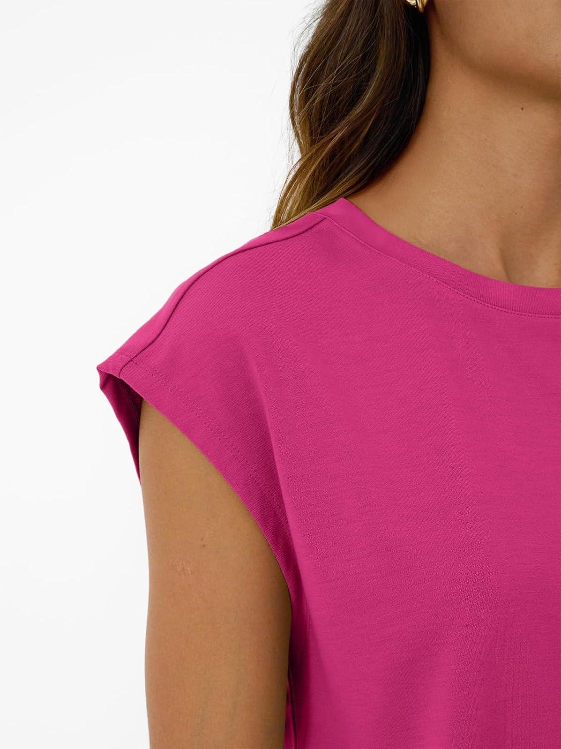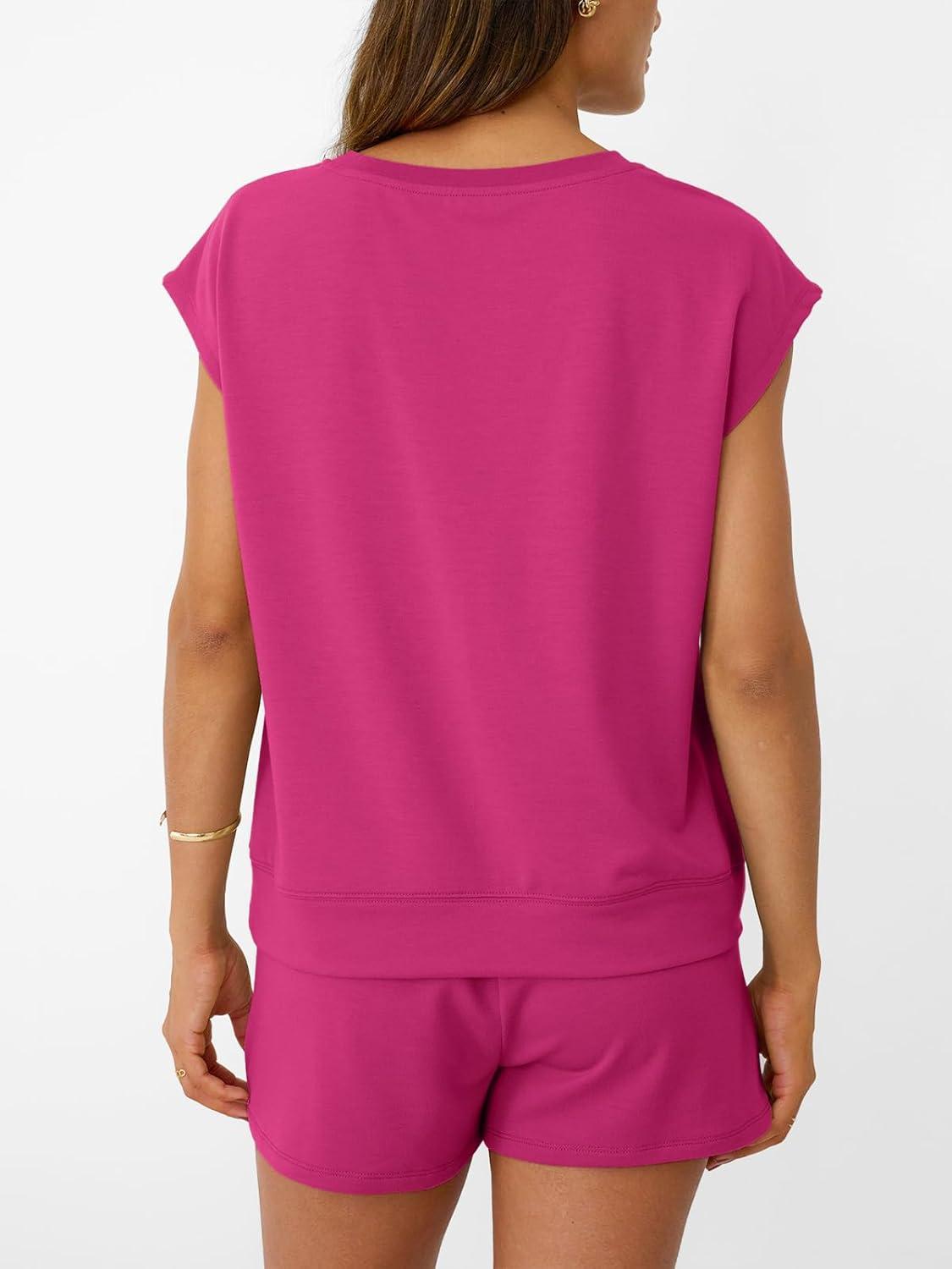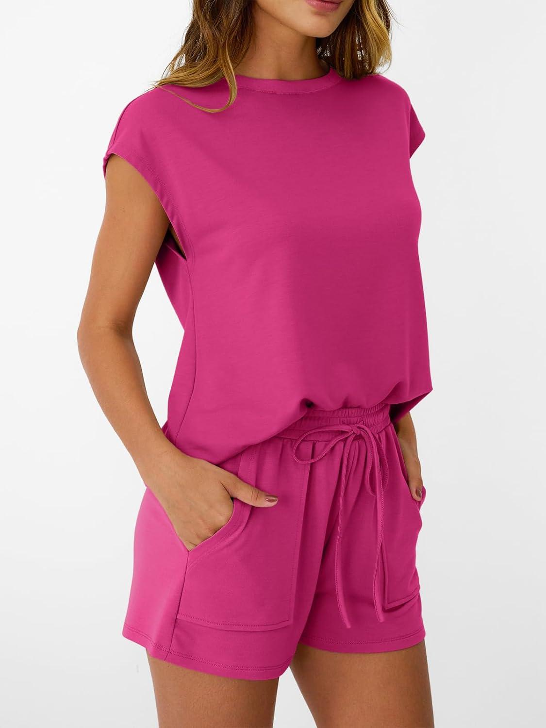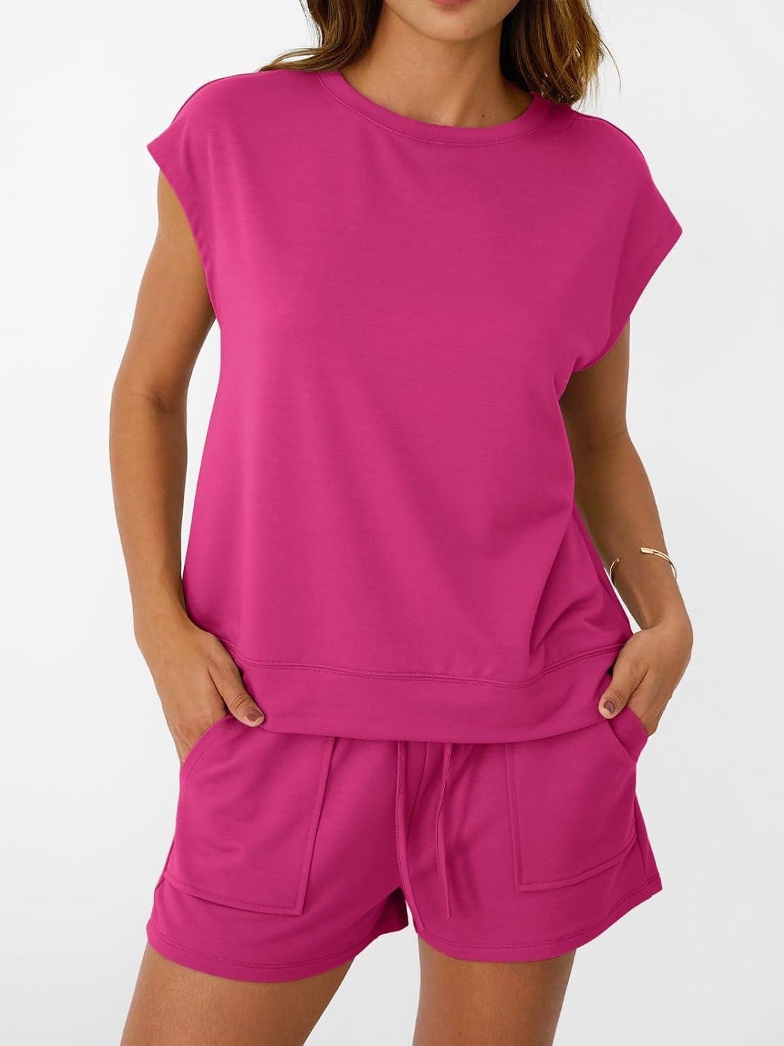 AUTOMET Womens Crew Neck Two Piece short Sets Cap Sleeve Drawstring Summer Sweatsuit with Pocket(Hot Pink)