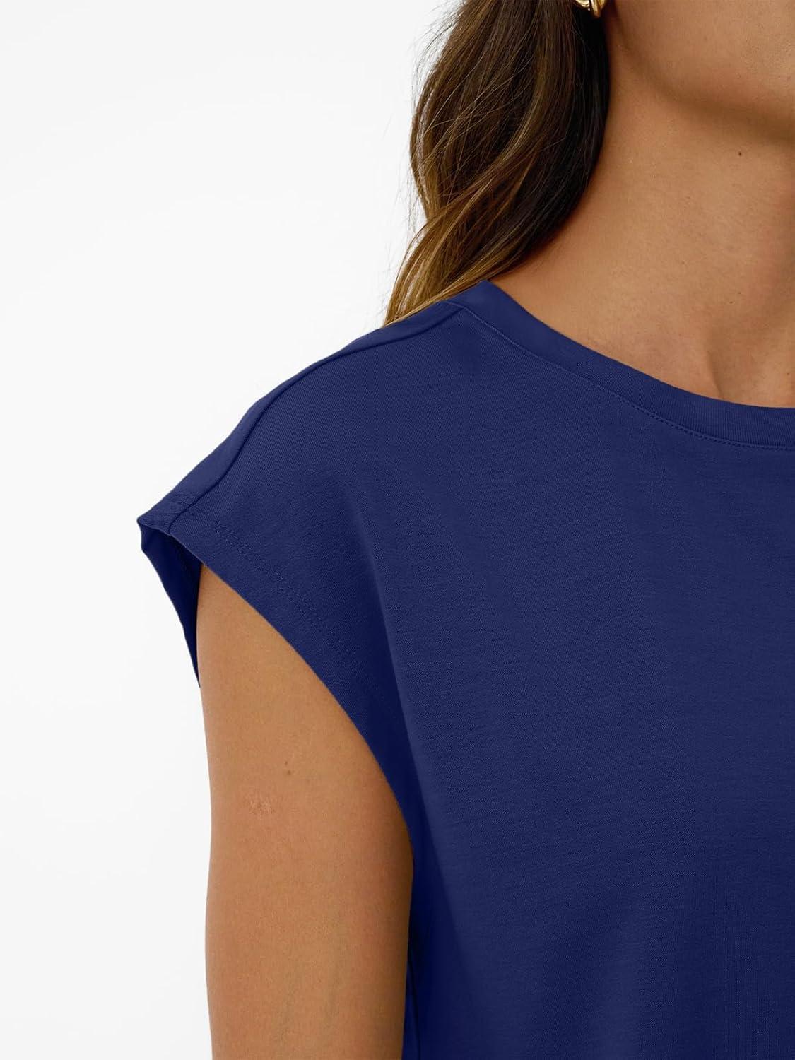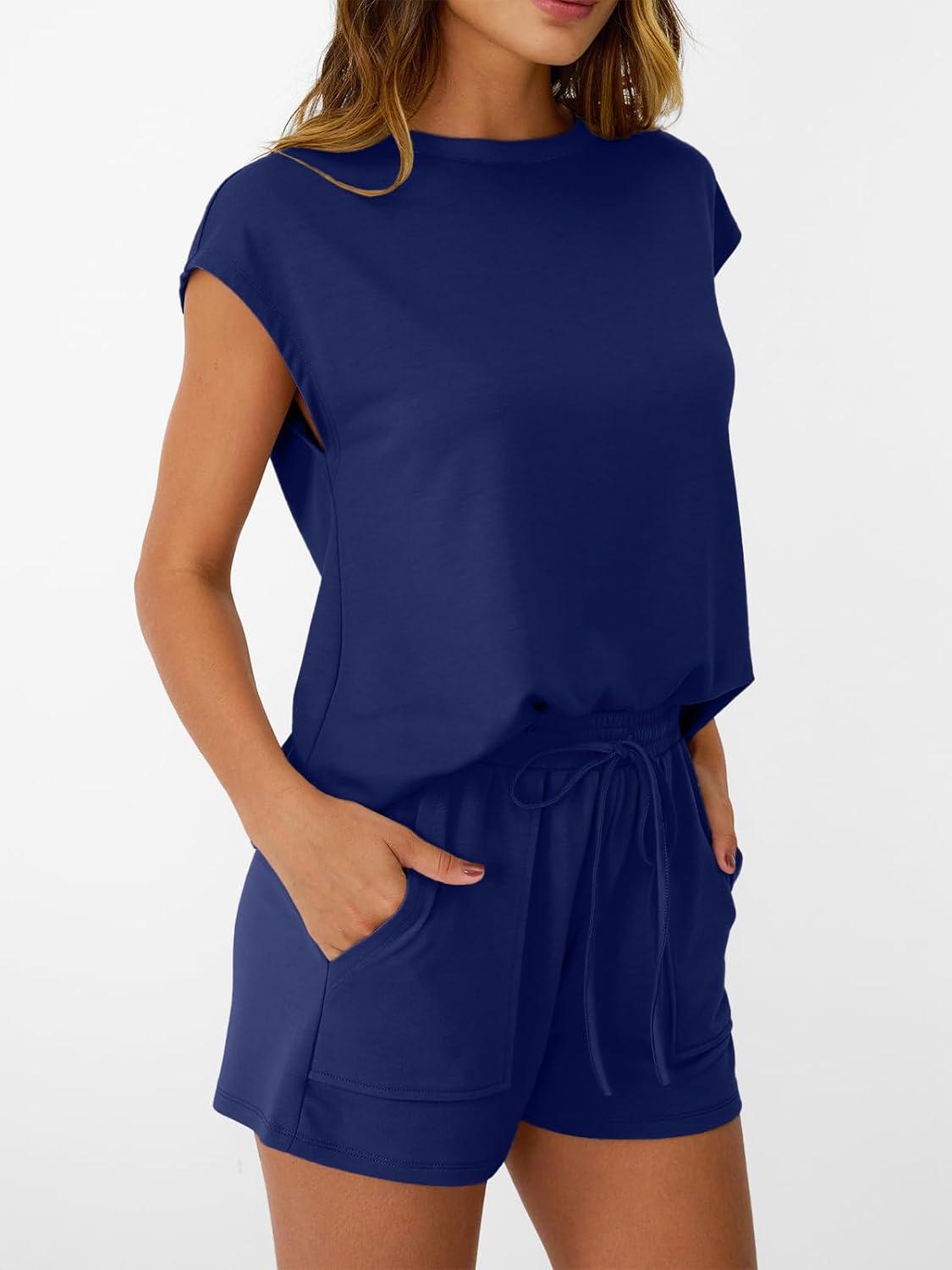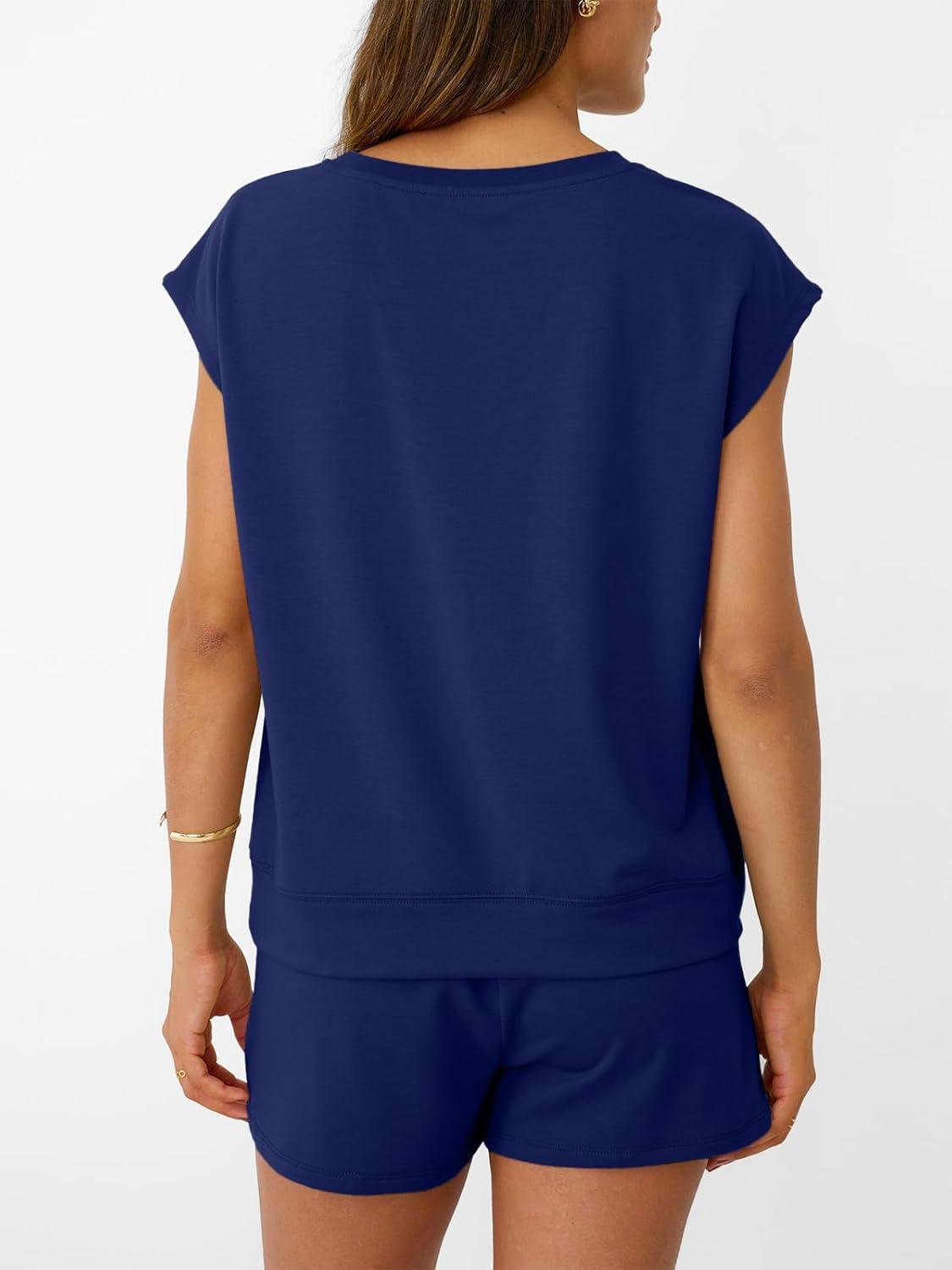 AUTOMET Womens Crew Neck Two Piece short Sets Cap Sleeve Drawstring Summer Sweatsuit with Pocket(Navy Blue)