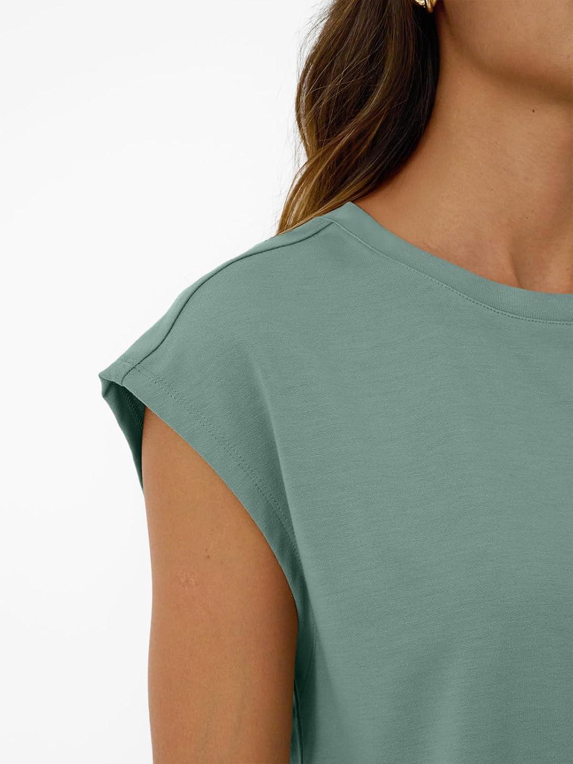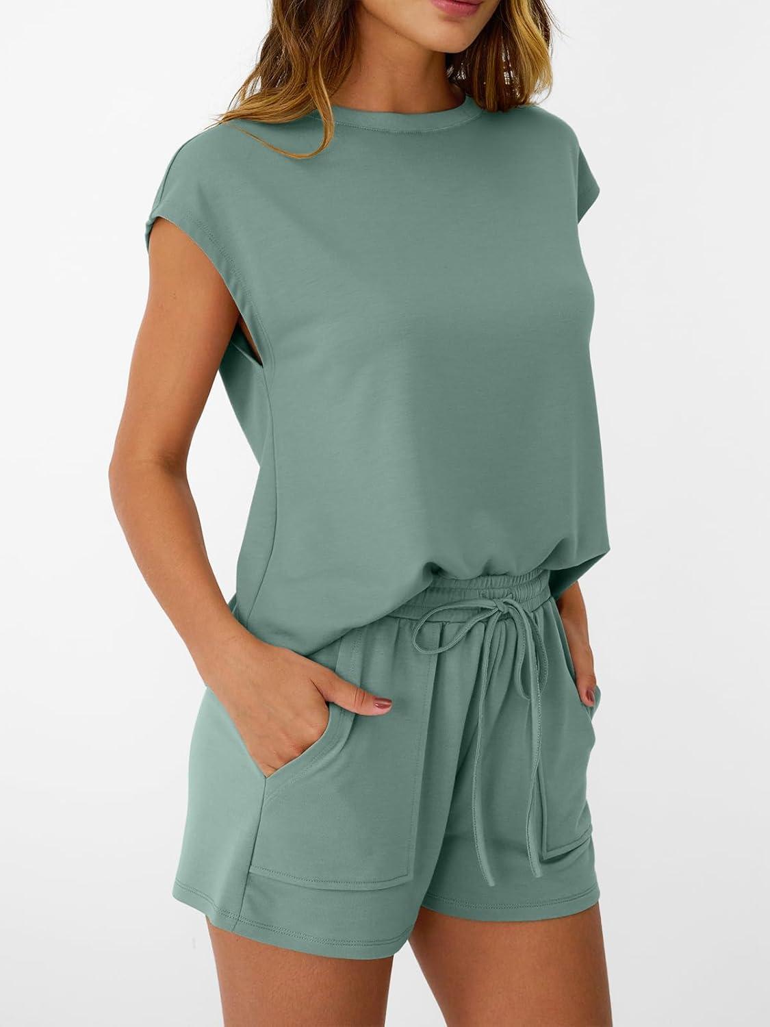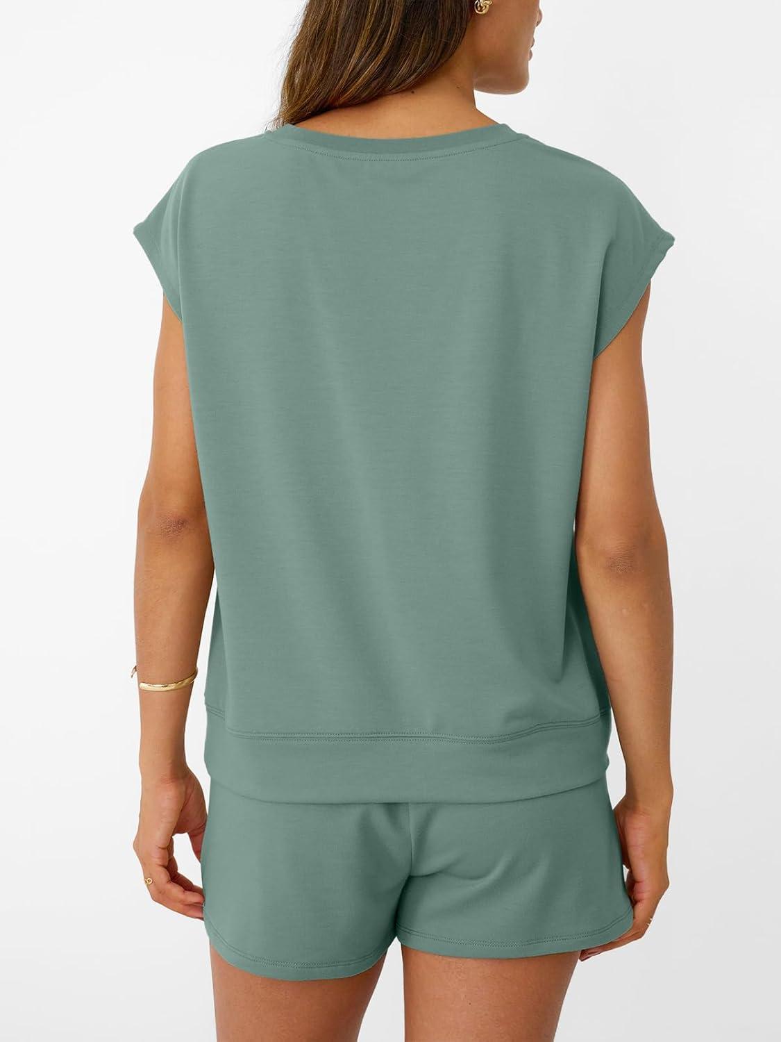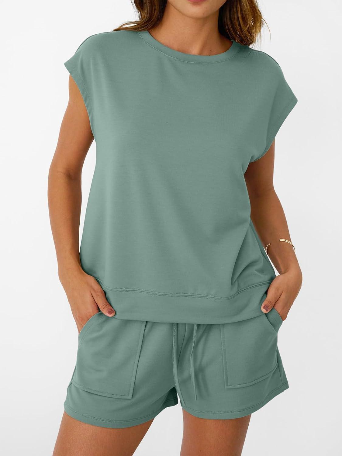AUTOMET Womens Crew Neck Two Piece short Sets Cap Sleeve Drawstring Summer Sweatsuit with Pocket(Sage Green)