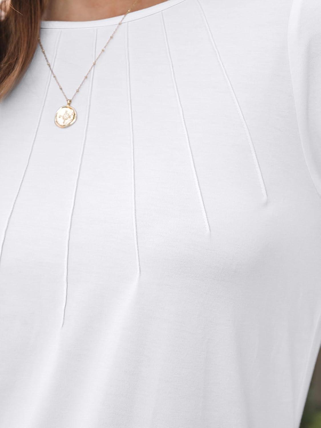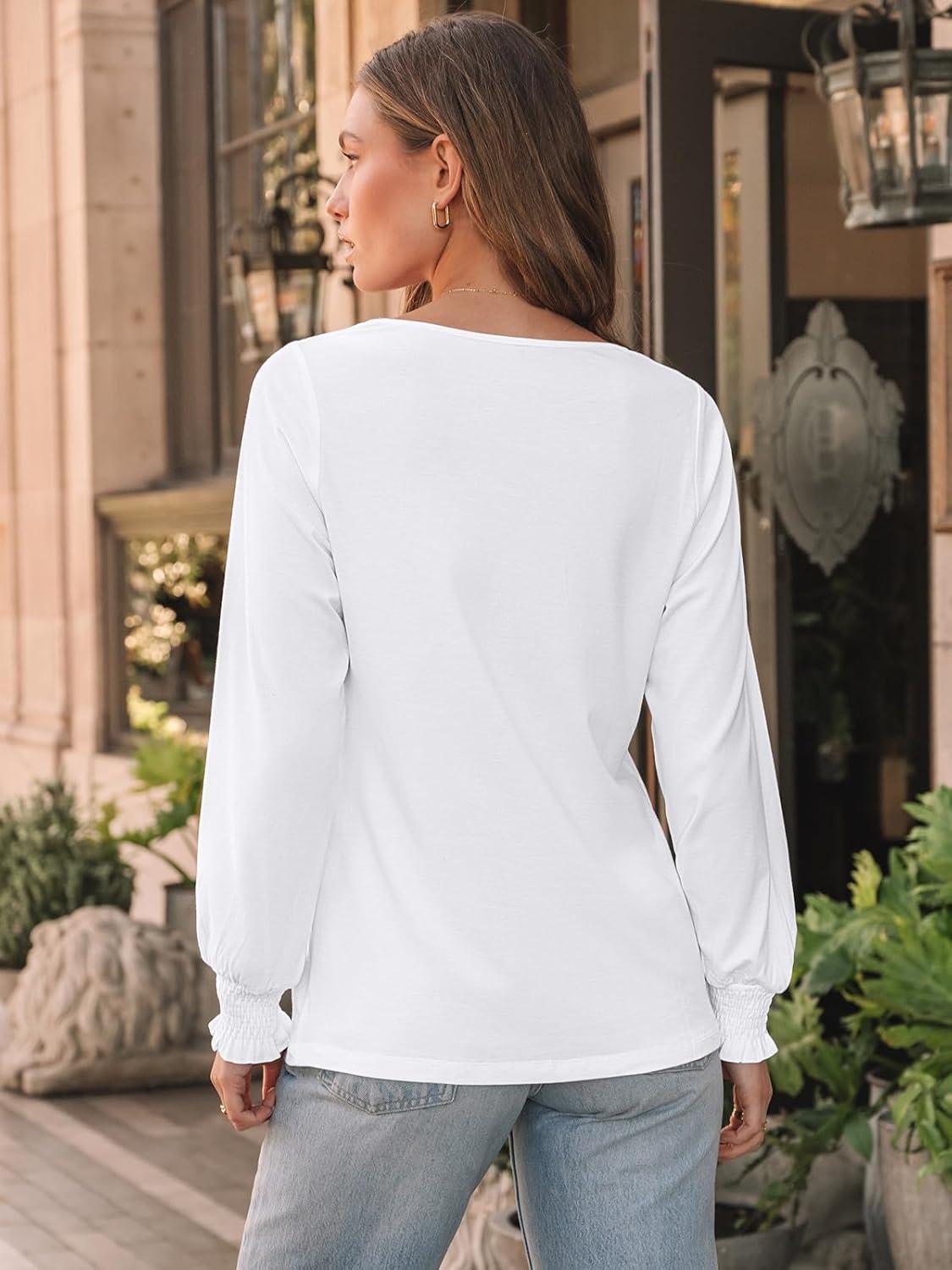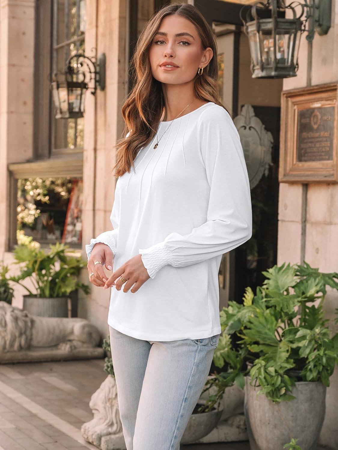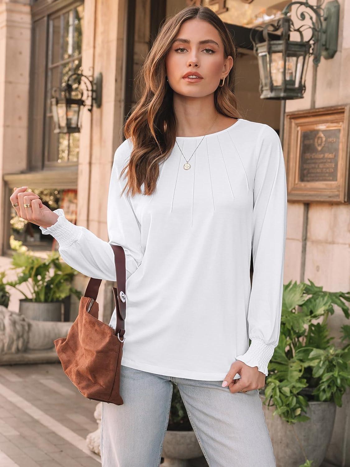 AUTOMET Womens Fall Fashion Long Sleeve Shirts Dressy Casual Pleated Basic Trendy Tops Winter Clothes 2025(White)