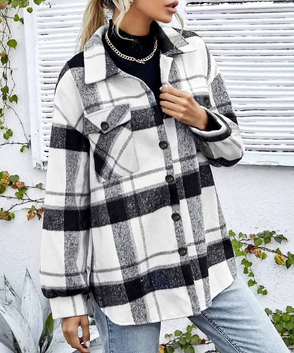 AUTOMET Womens Fall Outfits Fashion Clothes Shackets Flannel Plaid Button Down Long Sleeve Shirts Jackets(Blackwhite)