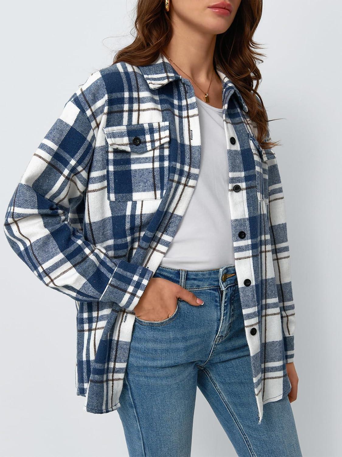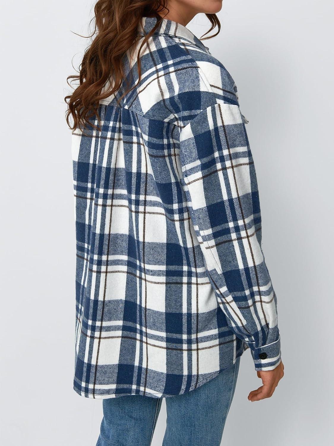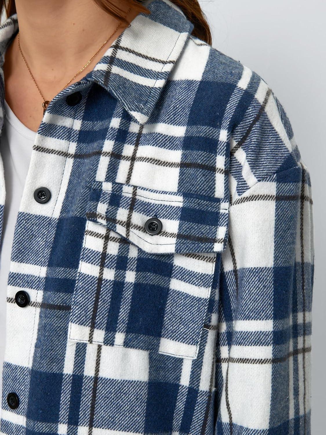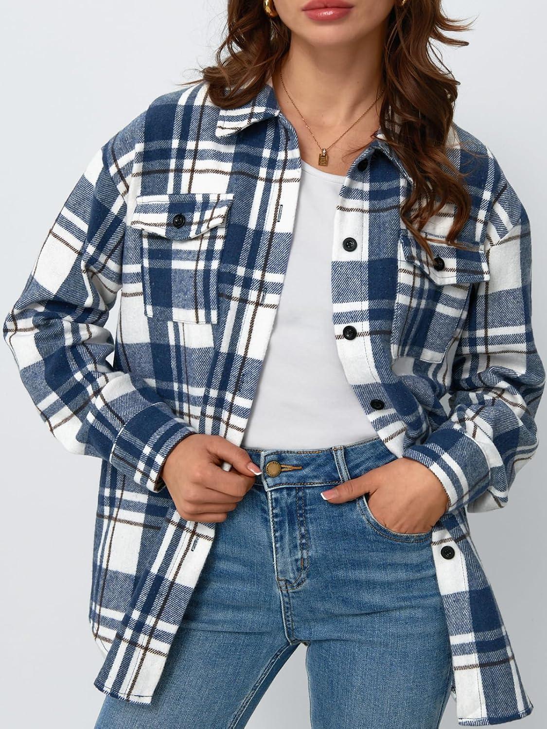 AUTOMET Womens Fall Outfits Fashion Clothes Shackets Flannel Plaid Button Down Long Sleeve Shirts Jackets(Bluewhite)