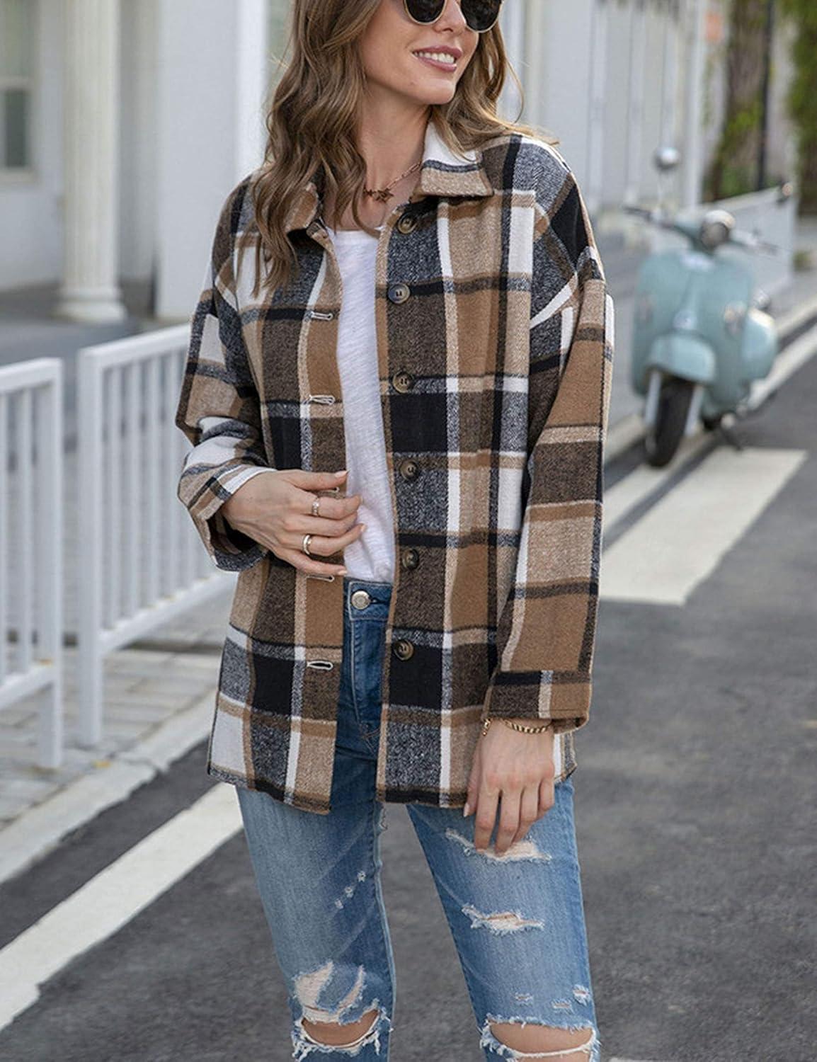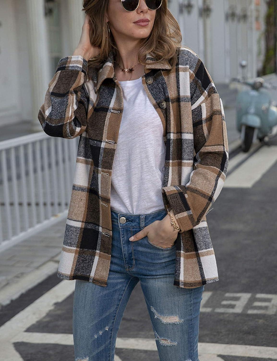 AUTOMET Womens Fall Outfits Fashion Clothes Shackets Flannel Plaid Button Down Long Sleeve Shirts Jackets(Khakigrey)