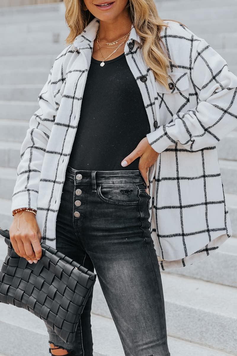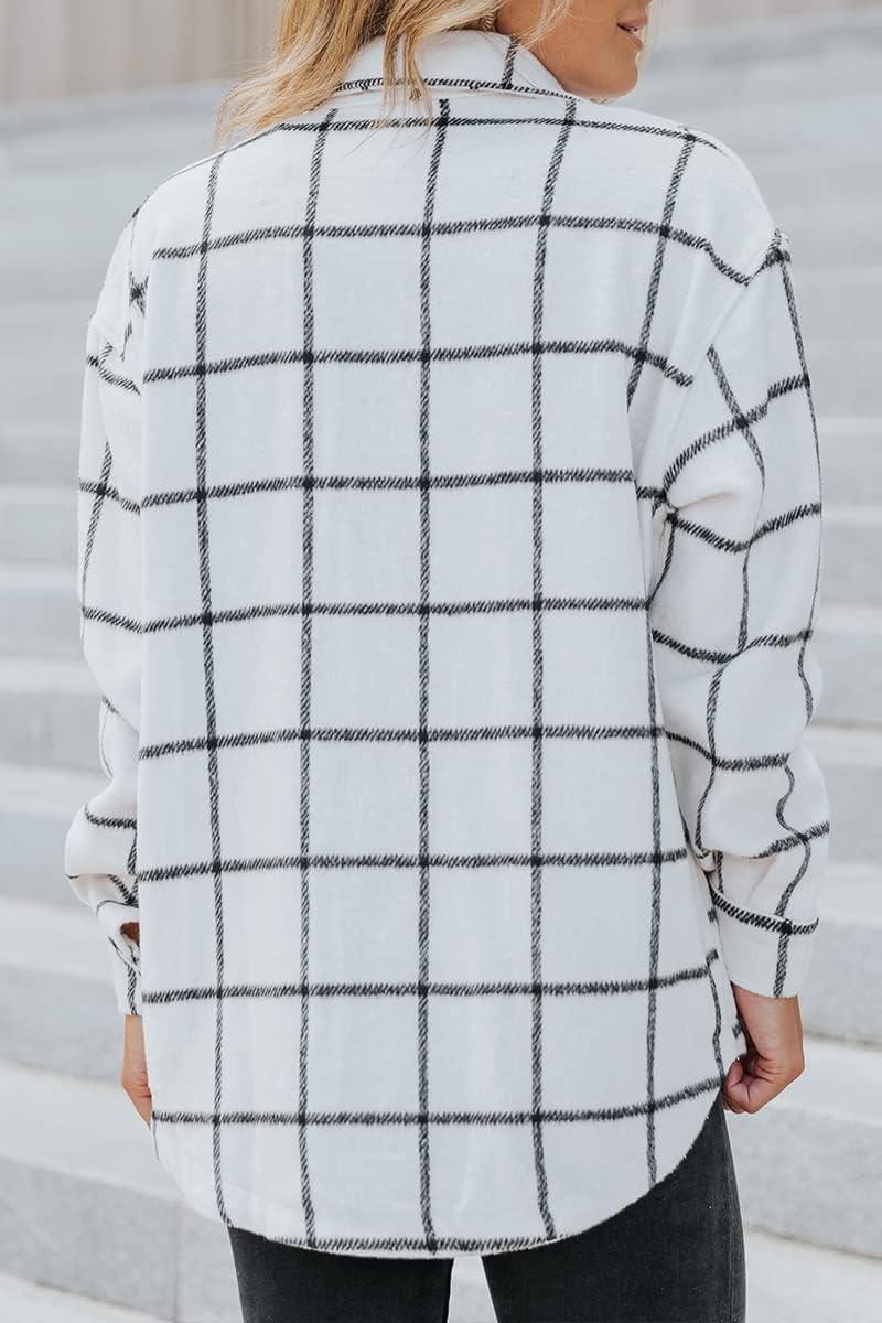 AUTOMET Womens Fall Outfits Fashion Clothes Shackets Flannel Plaid Button Down Long Sleeve Shirts Jackets(White)
