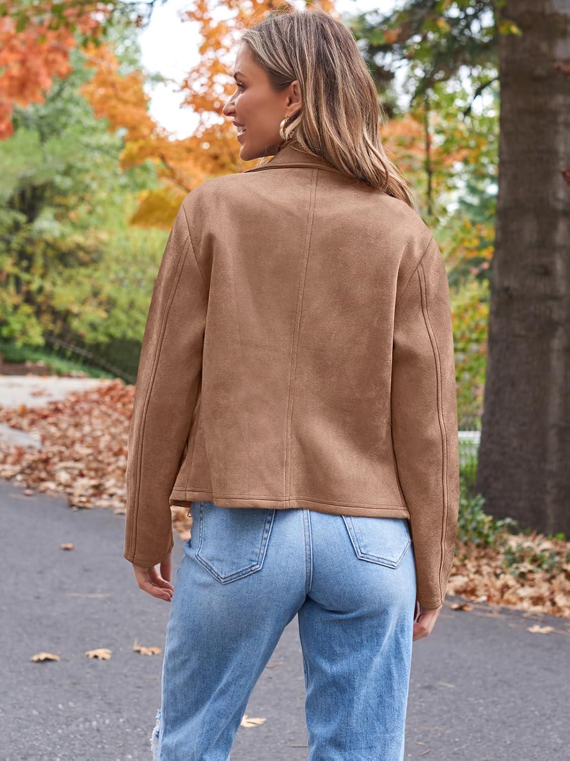 AUTOMET Womens Faux Leather Jackets Suede Fall Fashion 2025 Outfits Winter Clothes Open Front Cropped Coat Outwear(Camel)