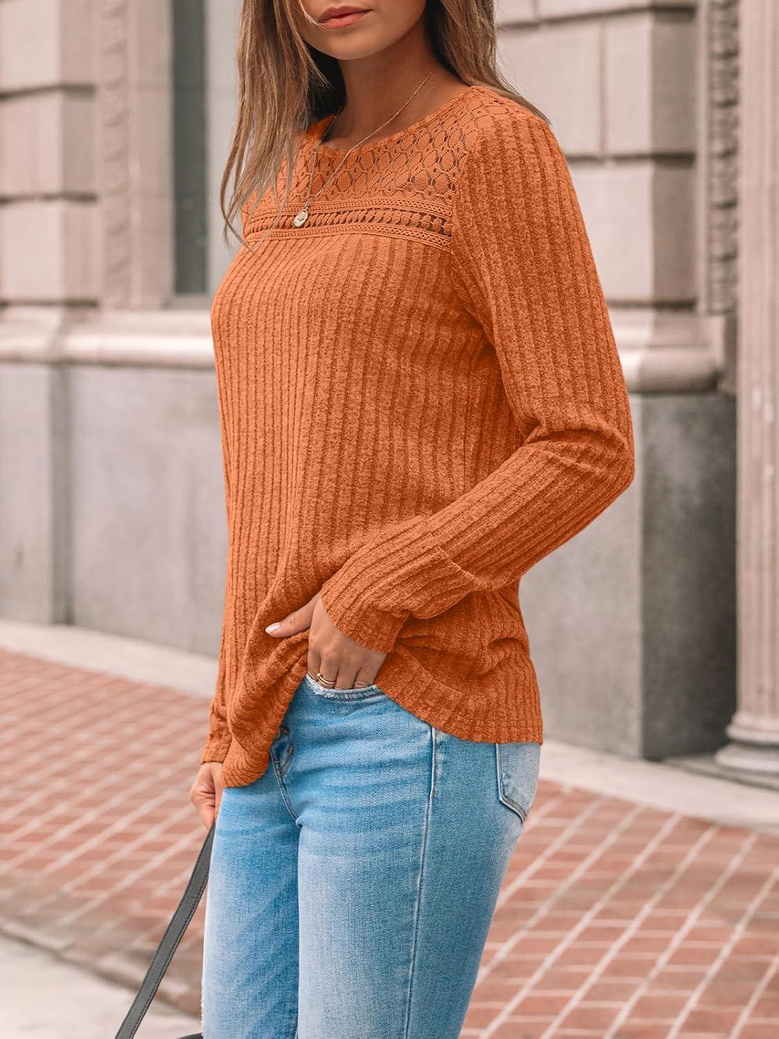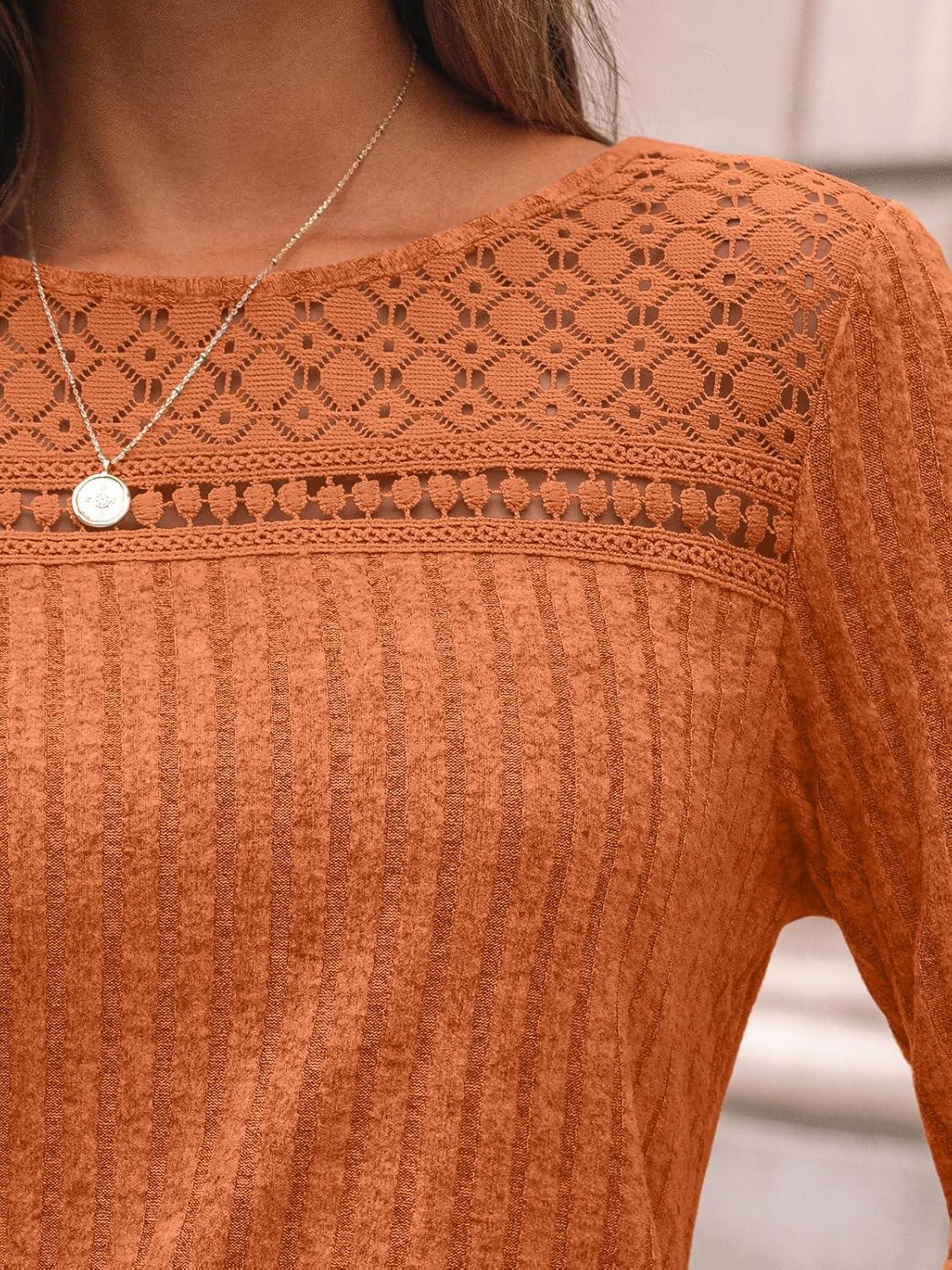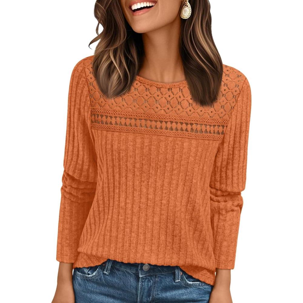 AUTOMET Womens Lace Long Sleeve Shirt Fall Top Fashion Dreesy Casual Tunic Sweaters Mesh Clothes Trendy Work Cute Outfits(Pumpkin)