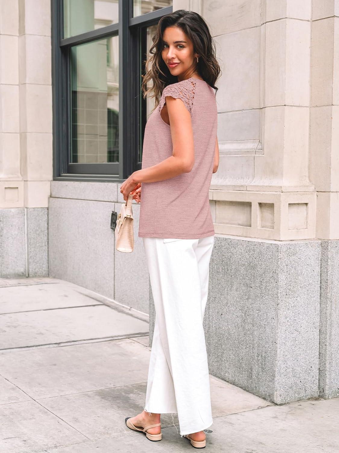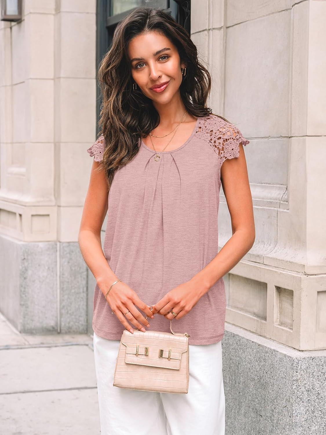 AUTOMET Womens Lace Tops Pleated Short Sleeve Shirts Summer Business Casual Dressy Blouses(Light Pink)