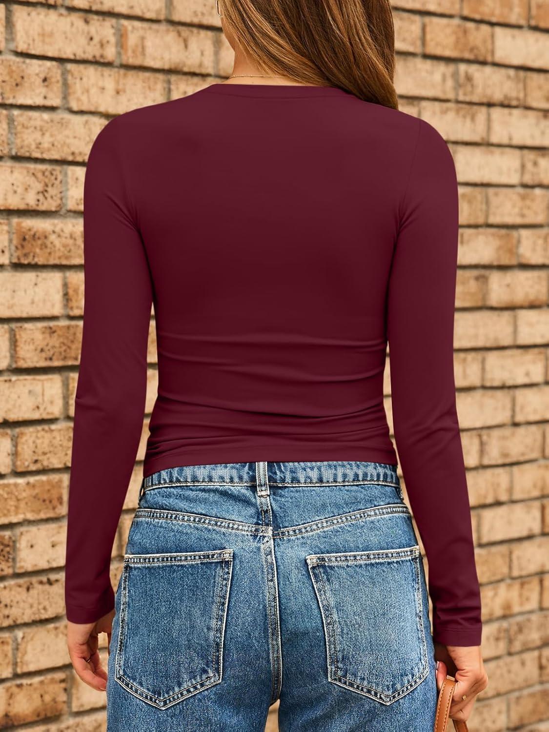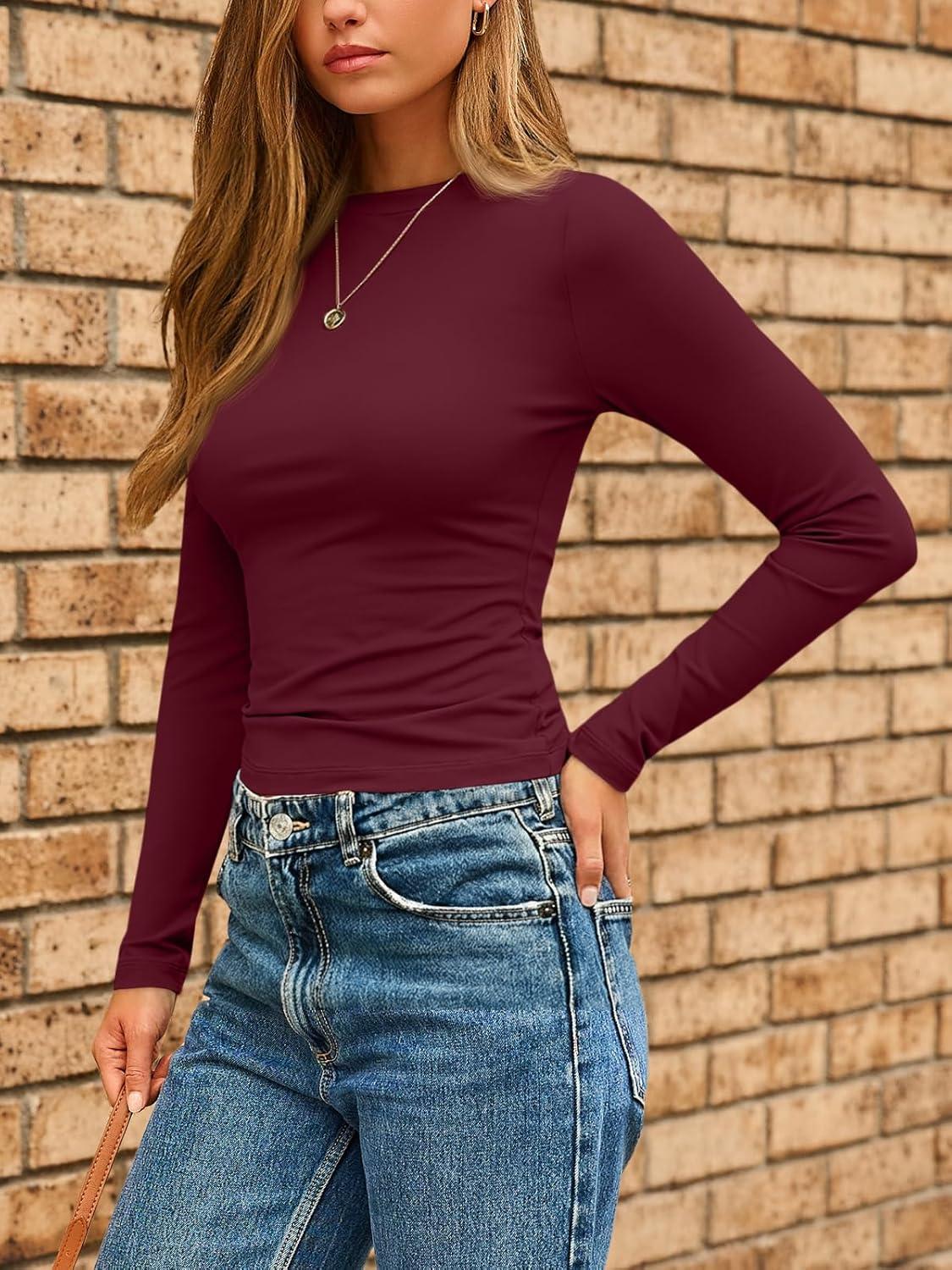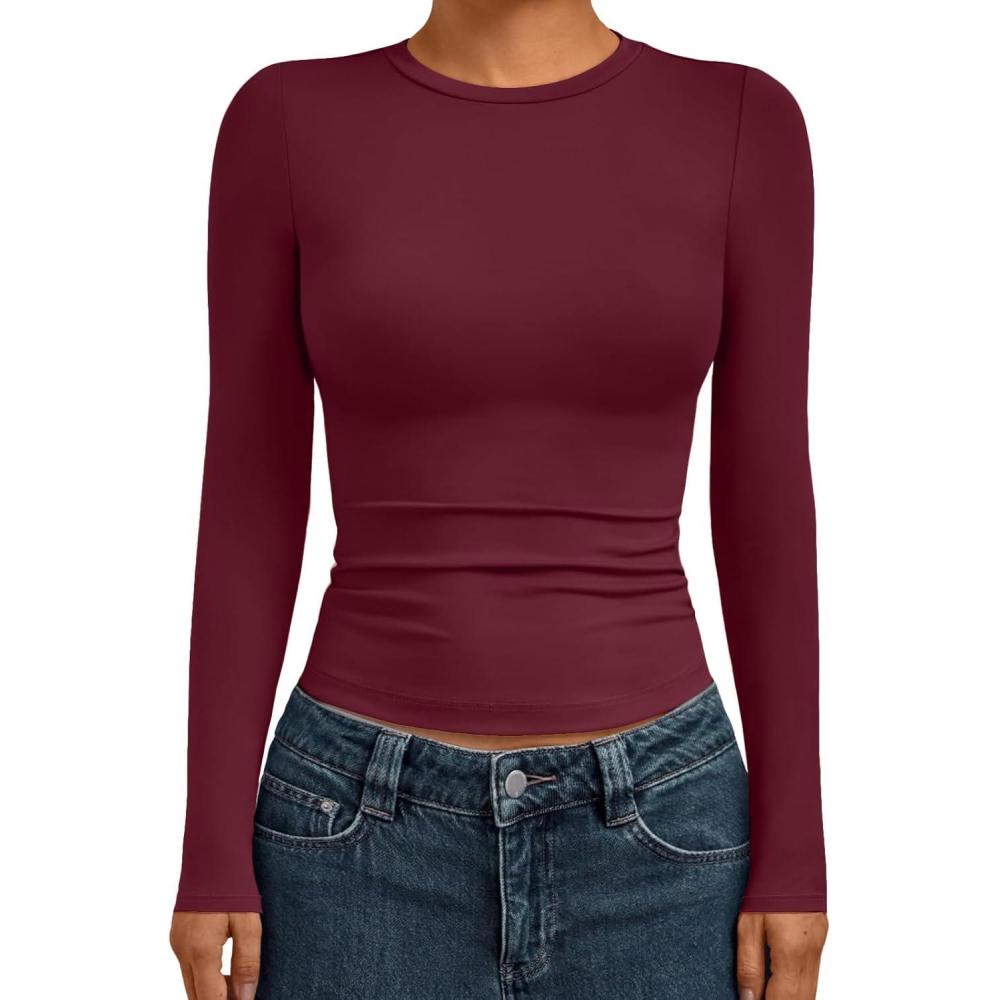 AUTOMET Womens Long Sleeve Shirts Basic Compression Going Out Crop Tops Fall Fashion Y2K Clothes 2025(Burgundy)