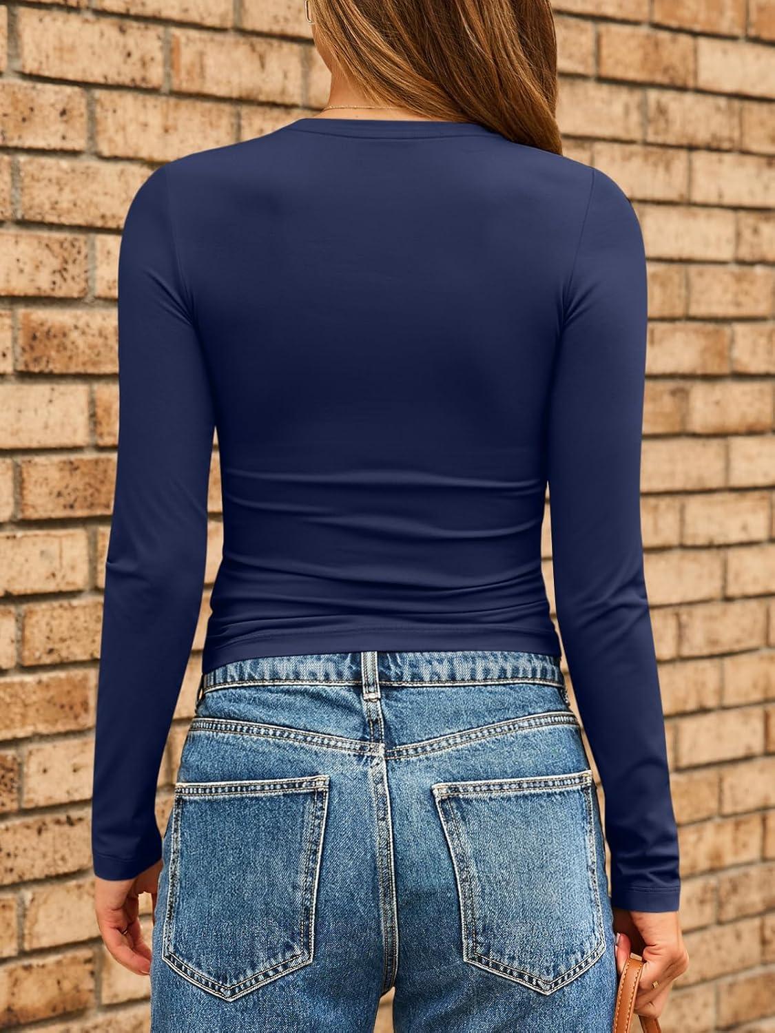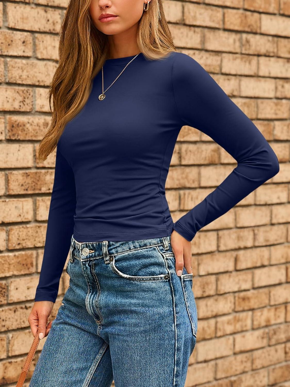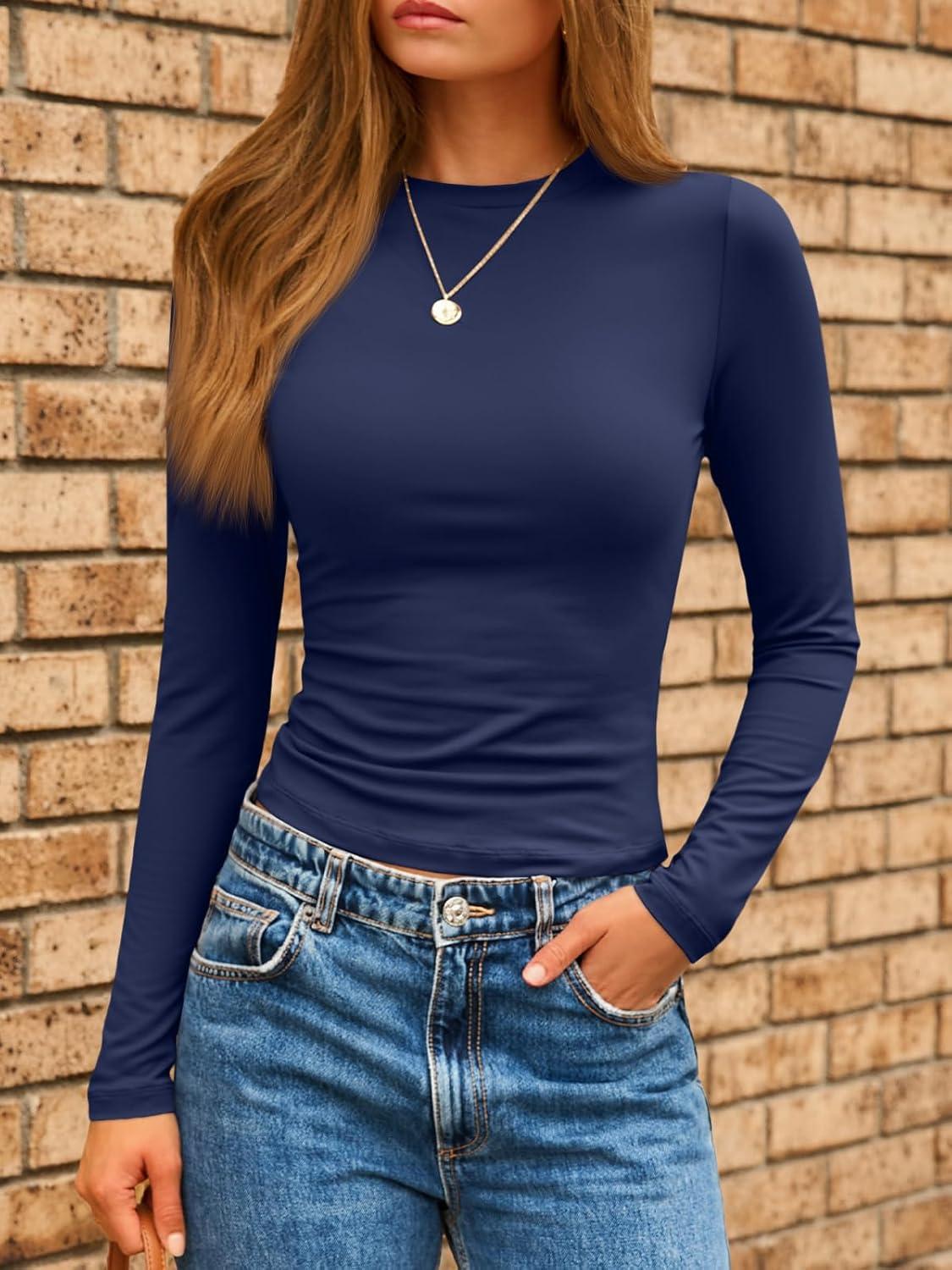 AUTOMET Womens Long Sleeve Shirts Basic Compression Going Out Crop Tops Fall Fashion Y2K Clothes 2025(Navy Blue)